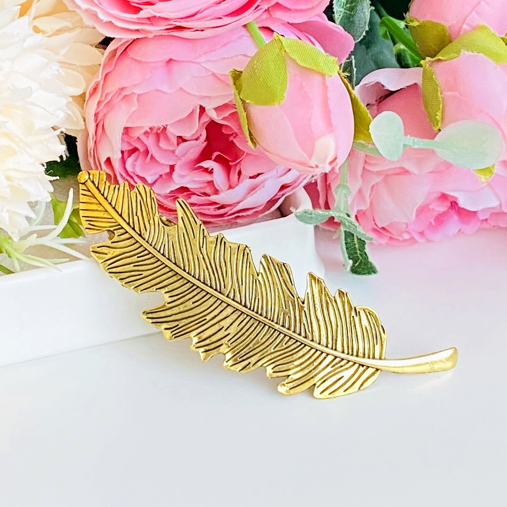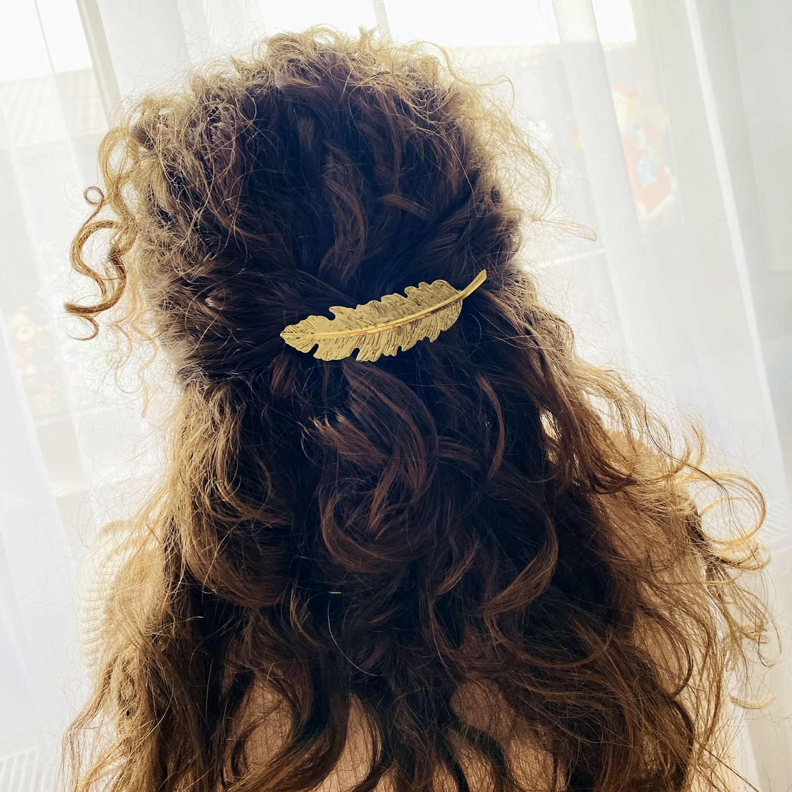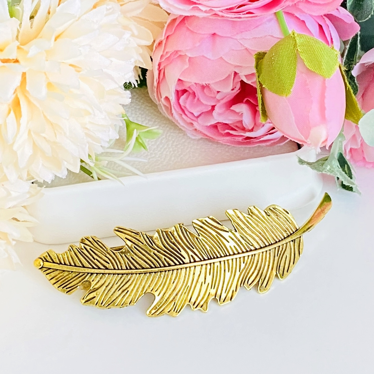 Agrafa de par din metal auriu, in forma de pana, tare simpatica.