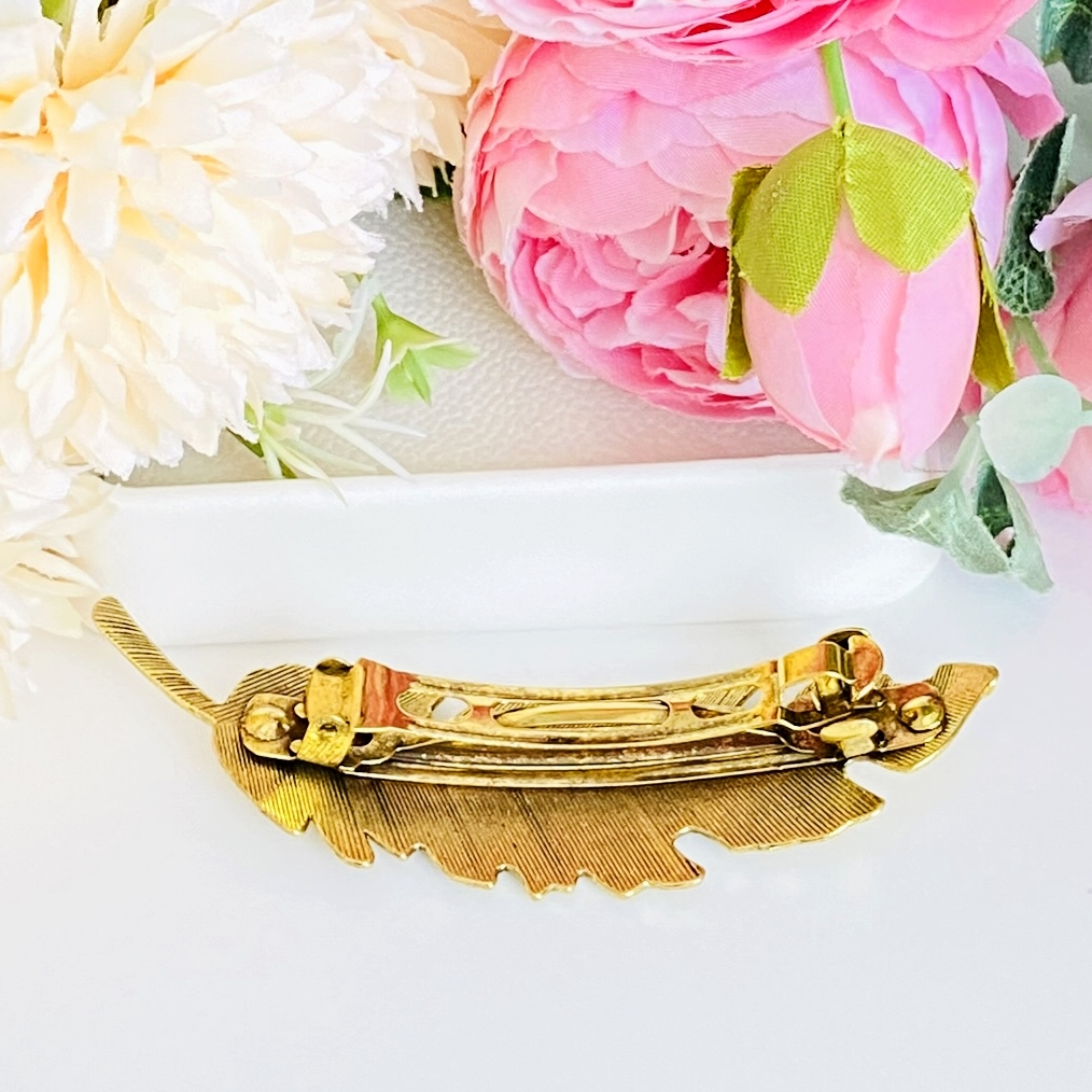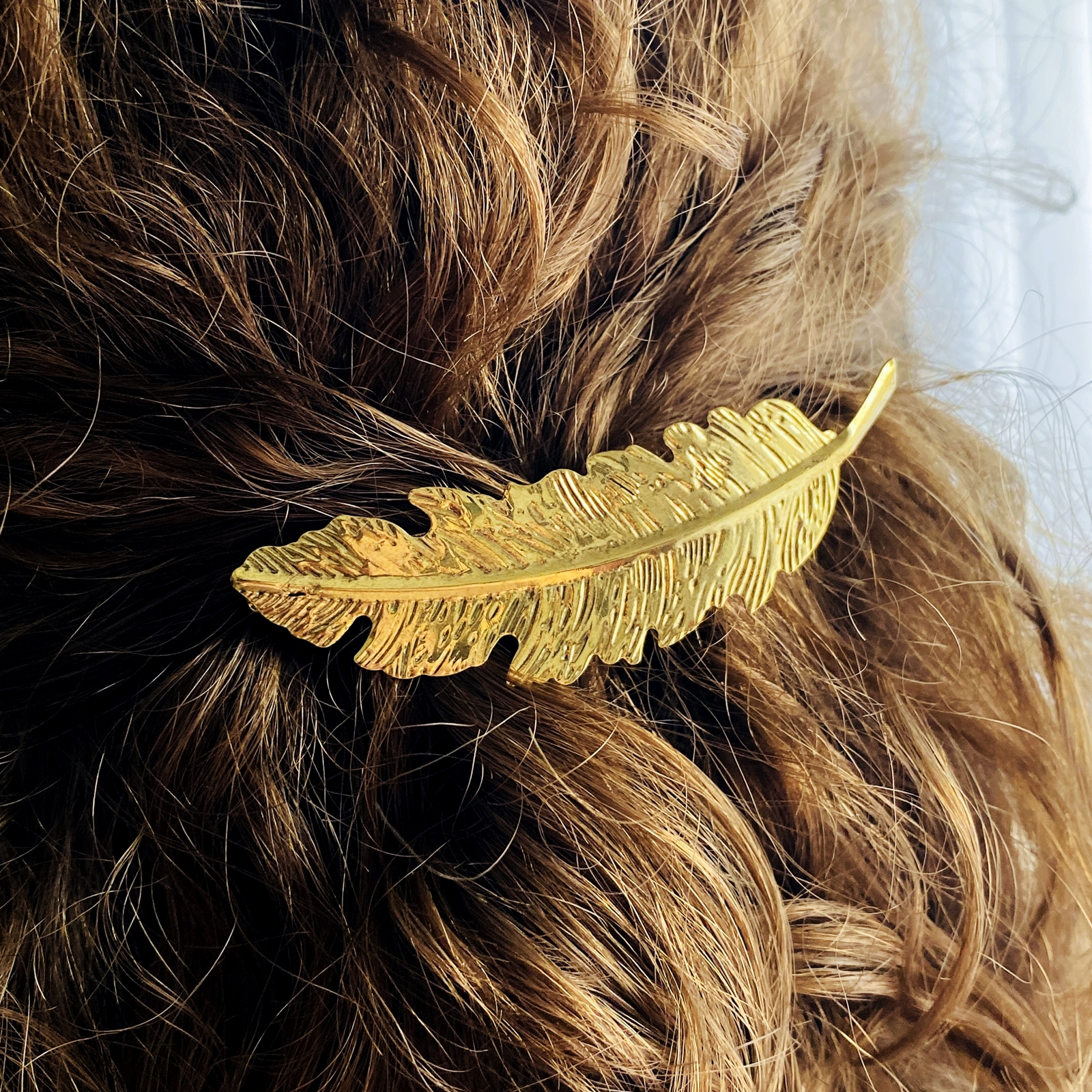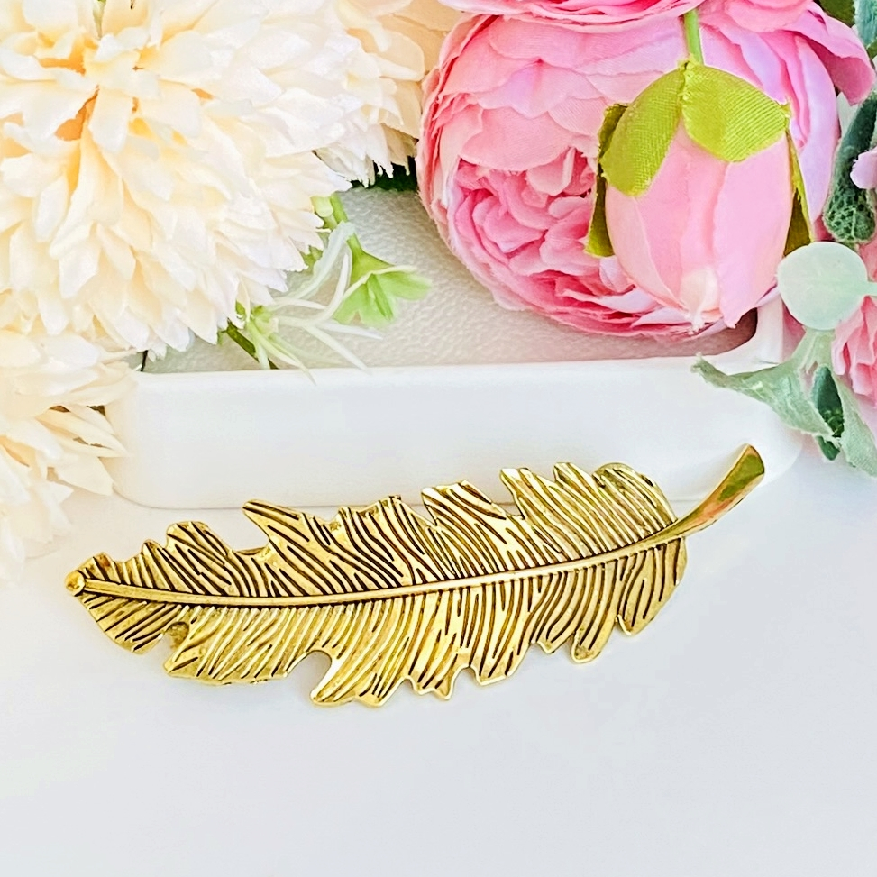 Agrafa de par din metal auriu, in forma de pana, tare simpatica.