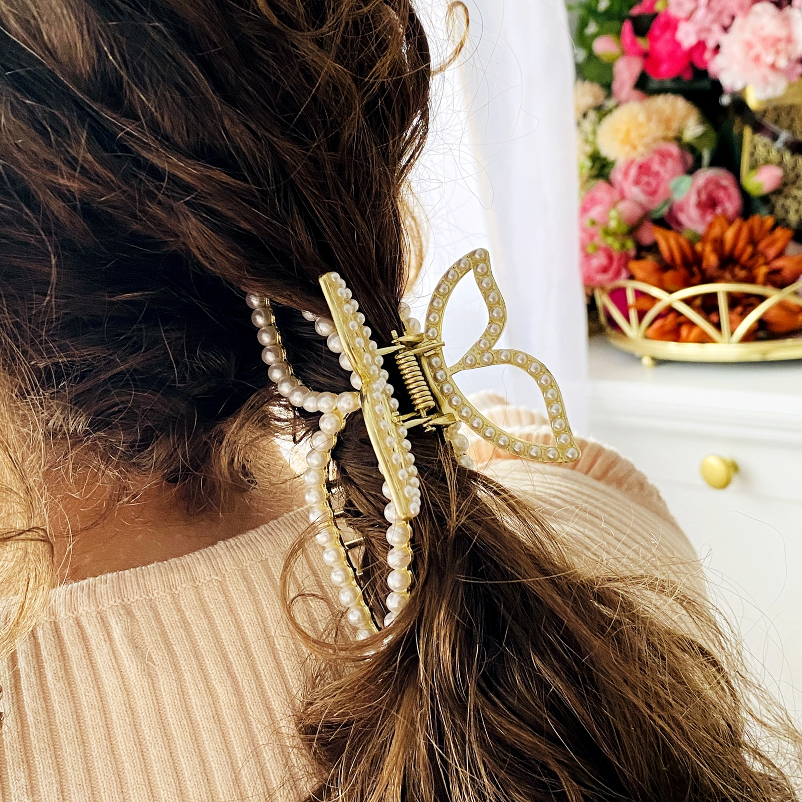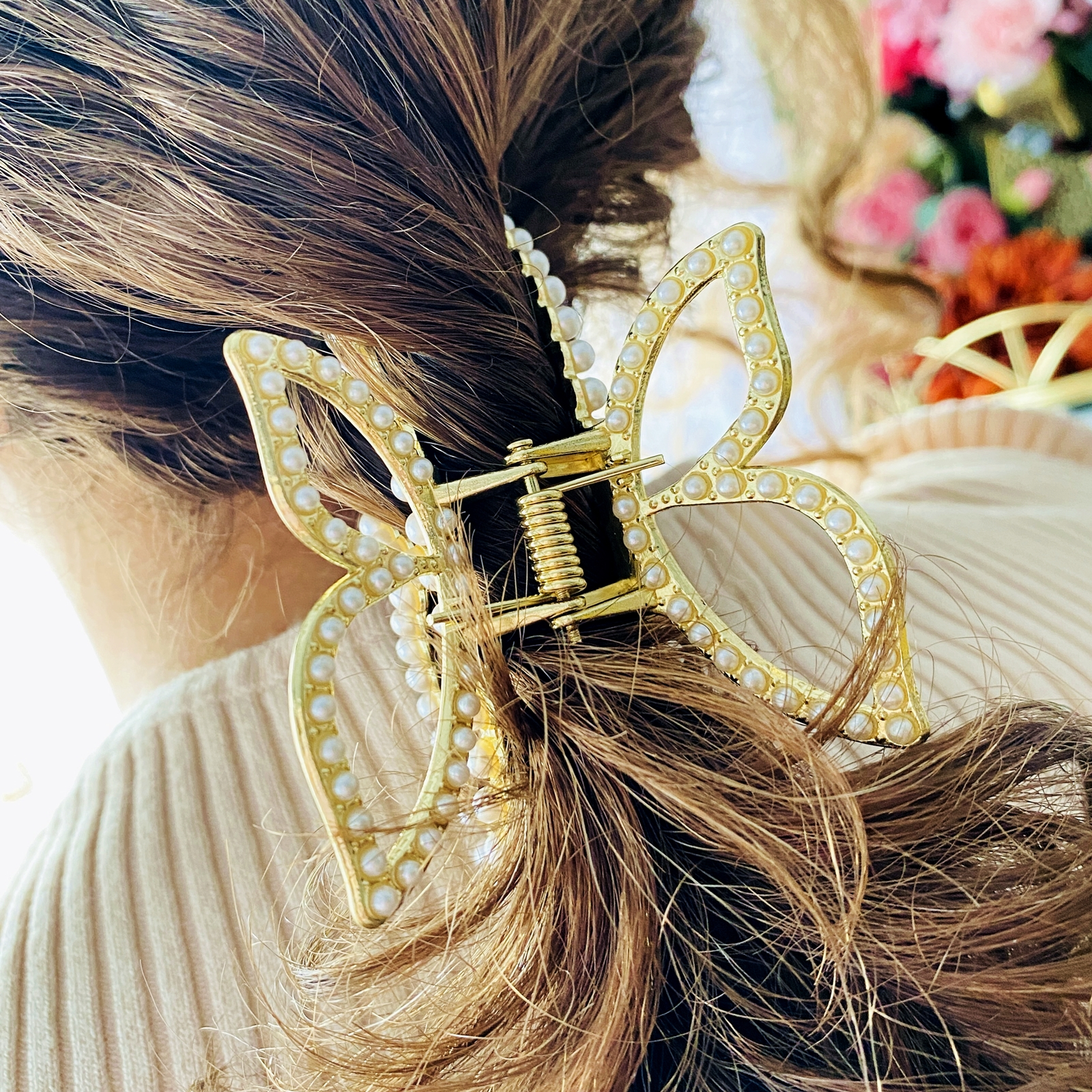 Clama de par din metal auriu, in forma de fluture, bogat decorata cu perlute albe, absolut superba.