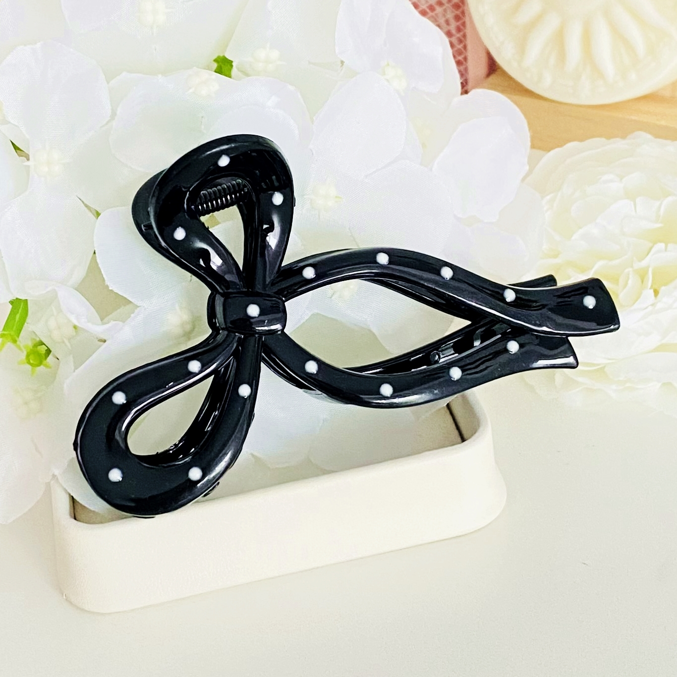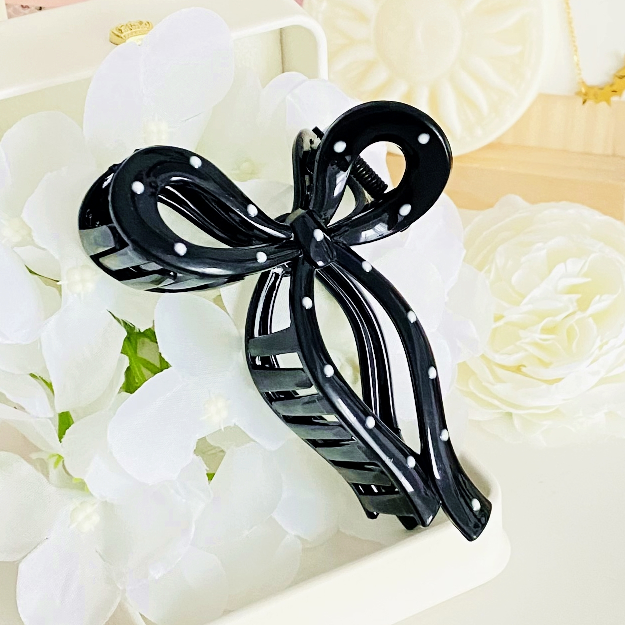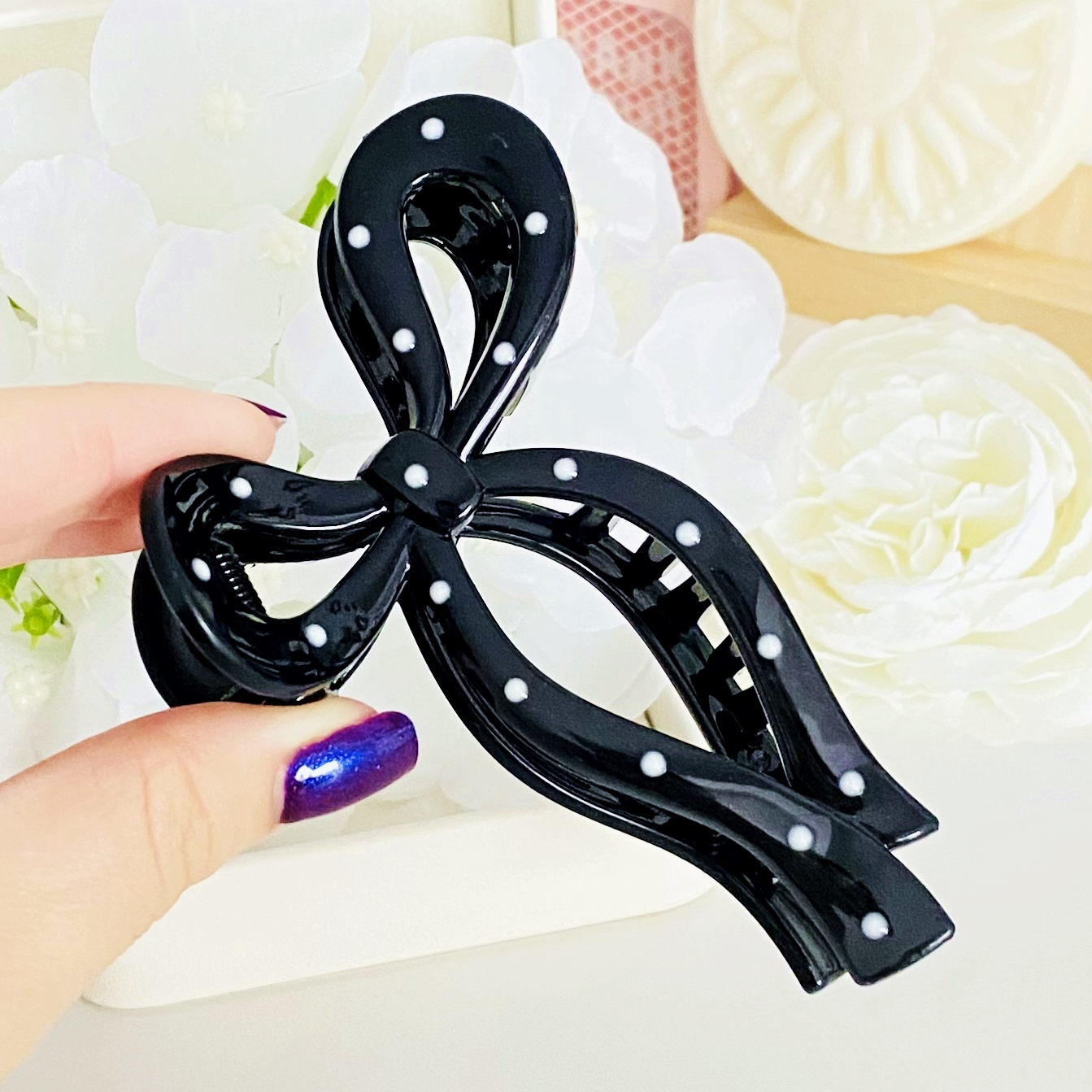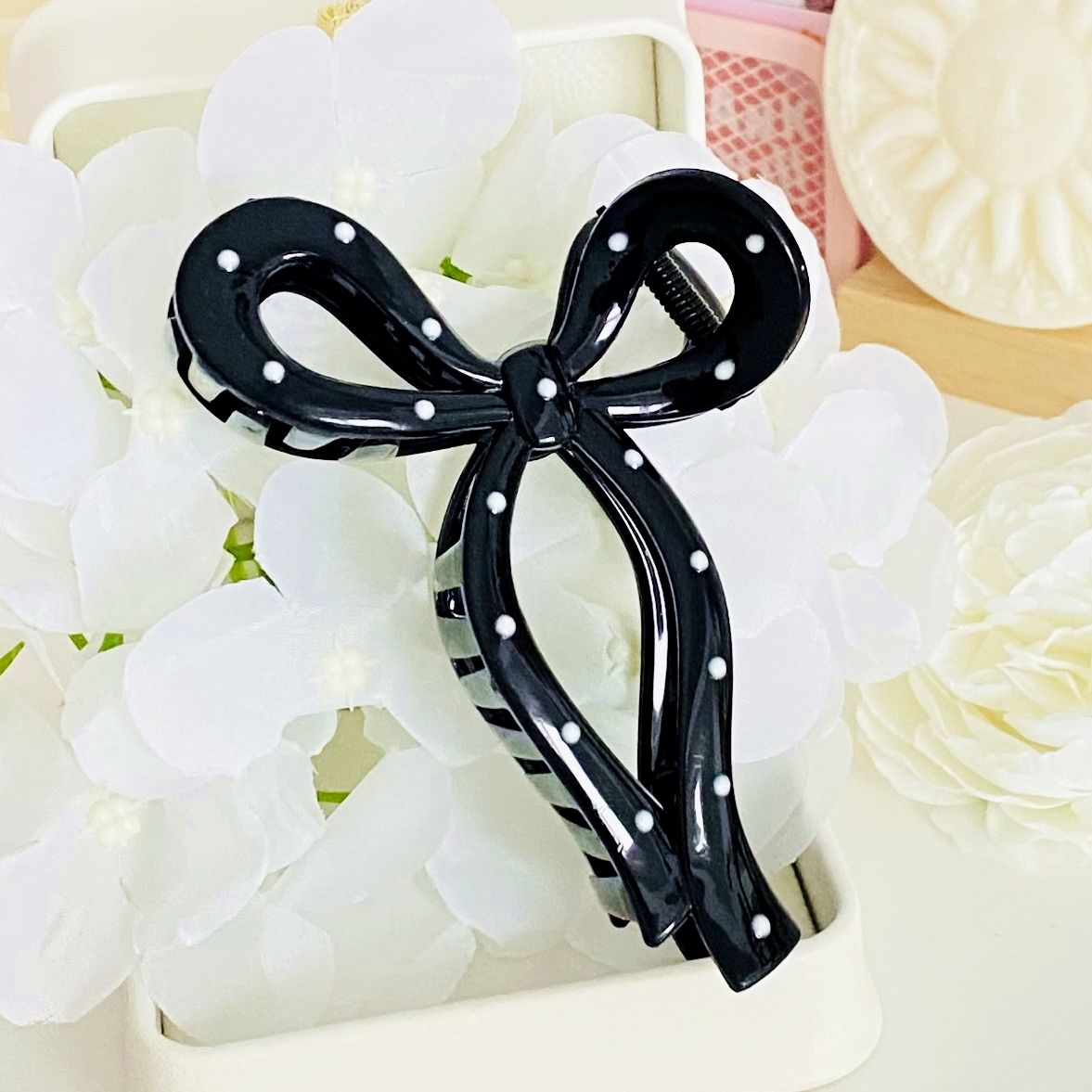 Clama de par din acril, bogat decorata cu buline, absolut superba.