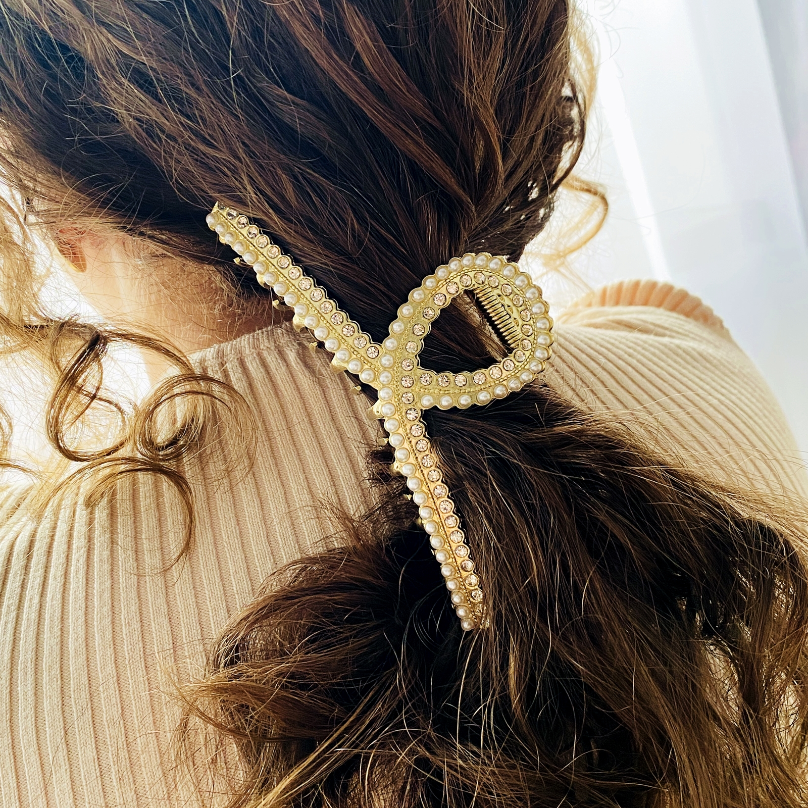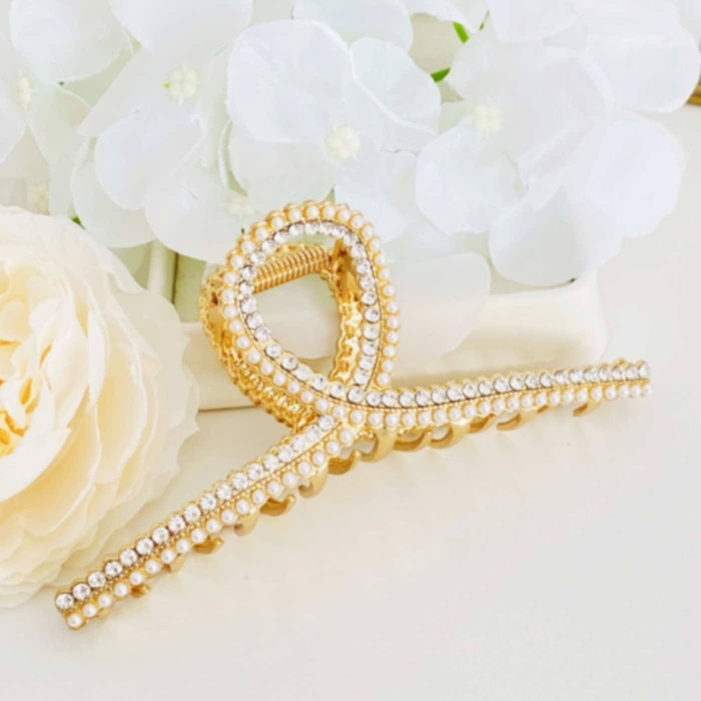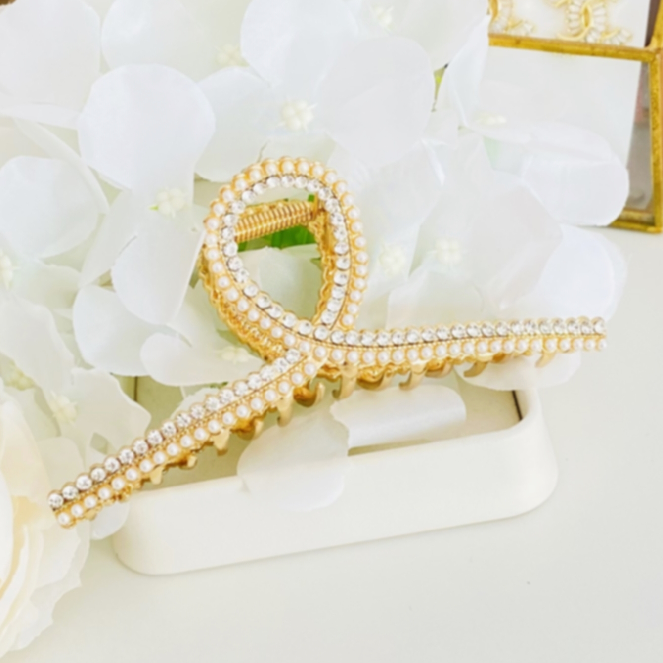 Clama de par din metal auriu, bogat decorata cu perlute albe si cristale, absolut superba.