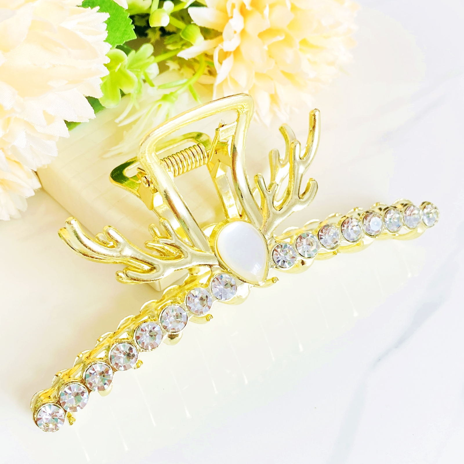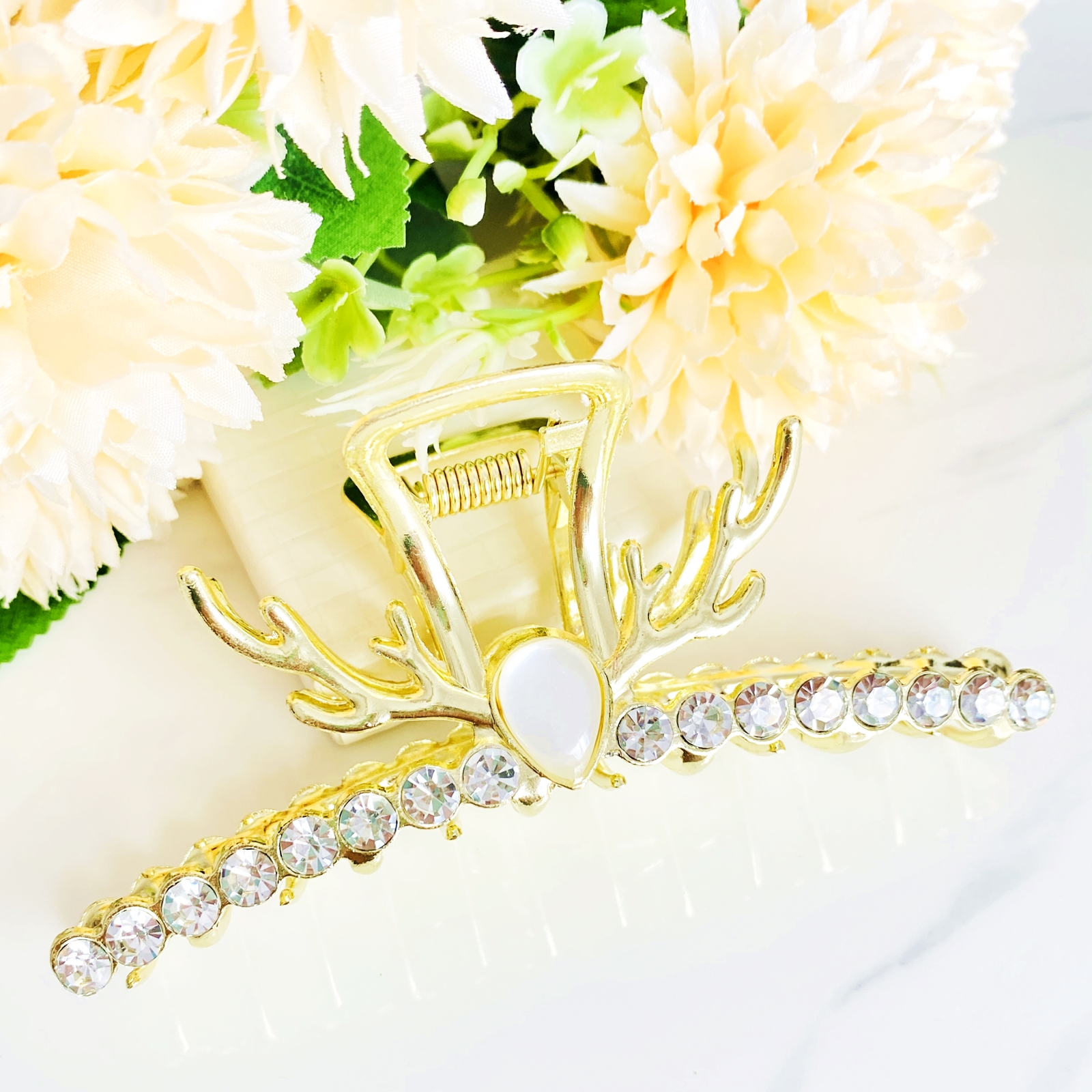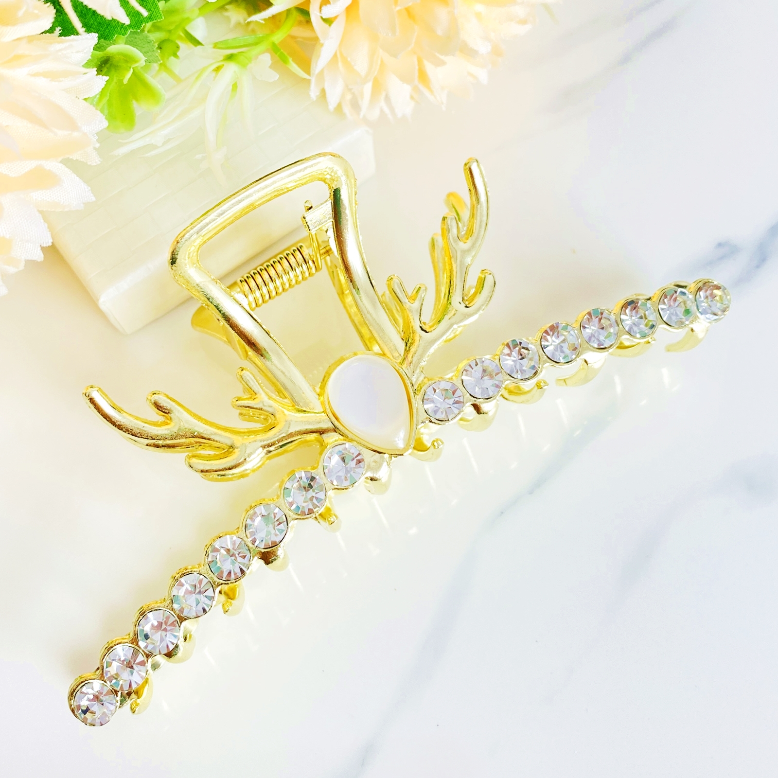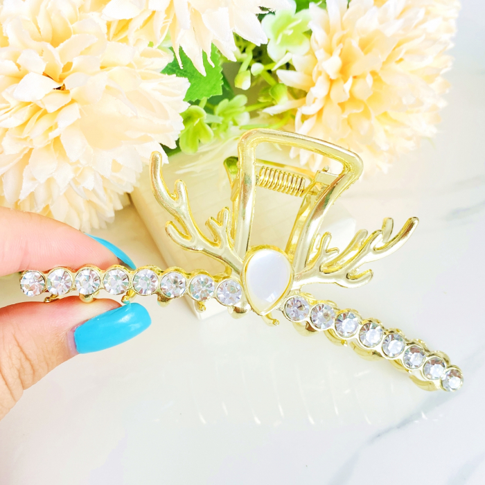 Clama de par din metal auriu, ce reprezinta coarnele maiestuosului ren, decorata cu cristale, ce-ti va oferi suportul necesar pe toata perioada zilei.