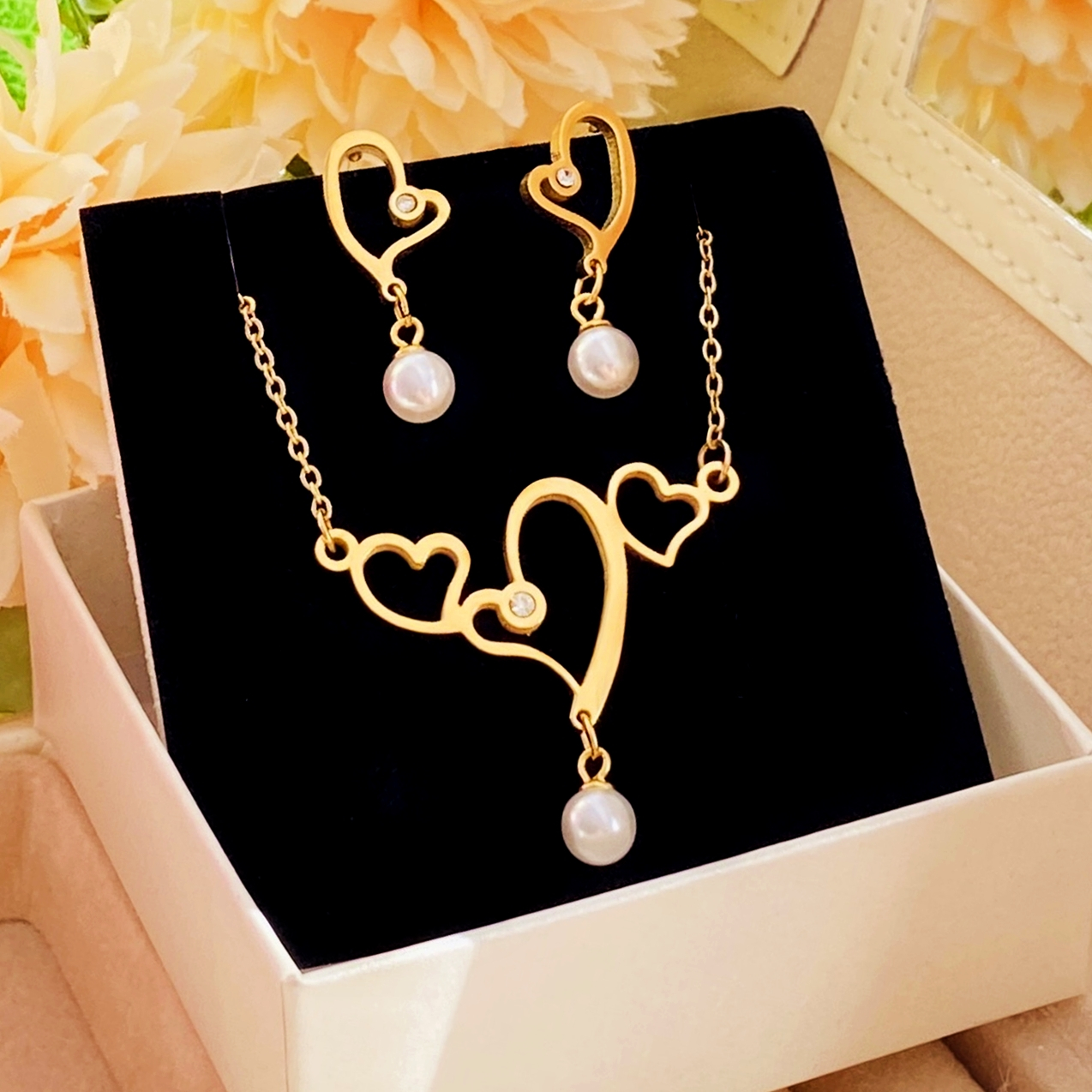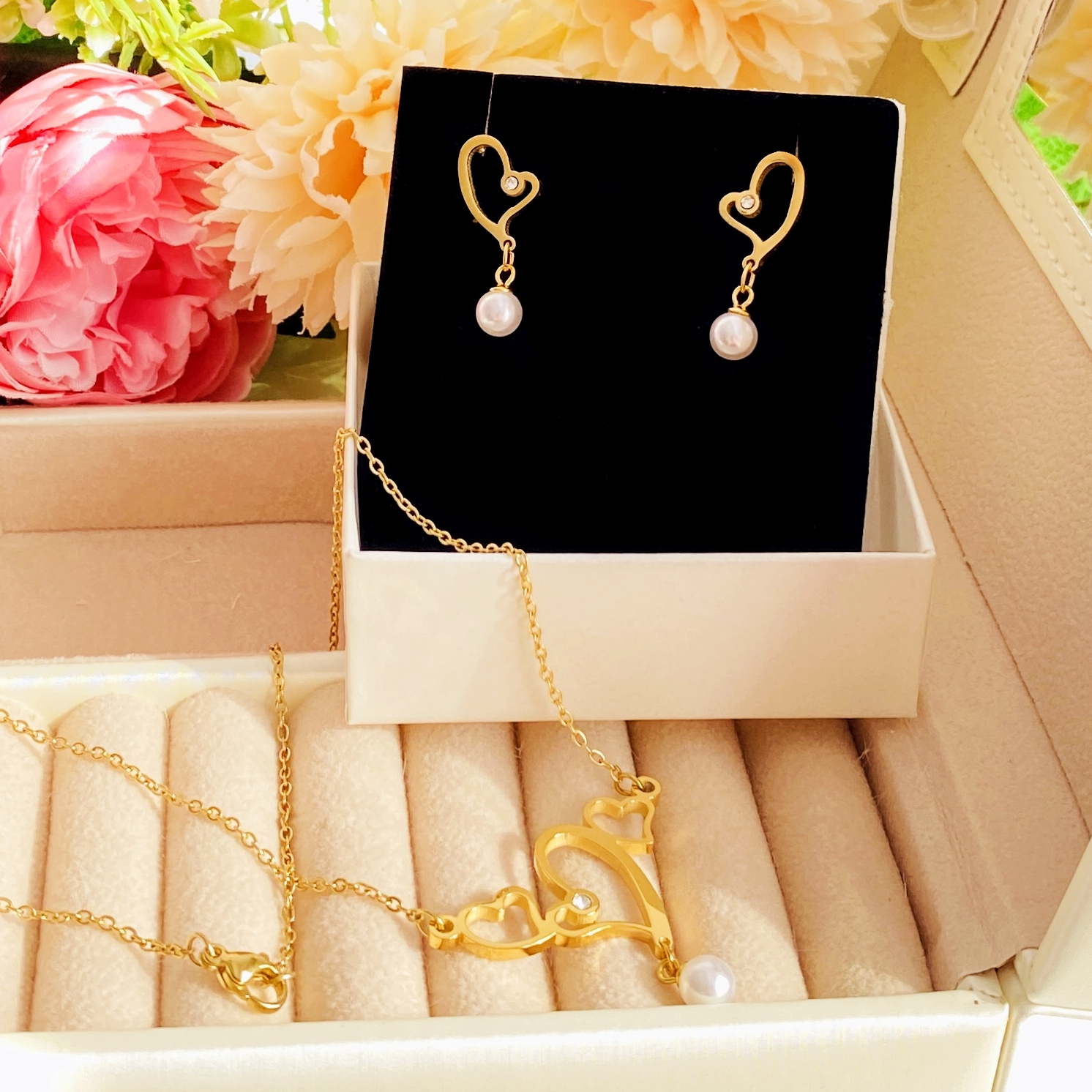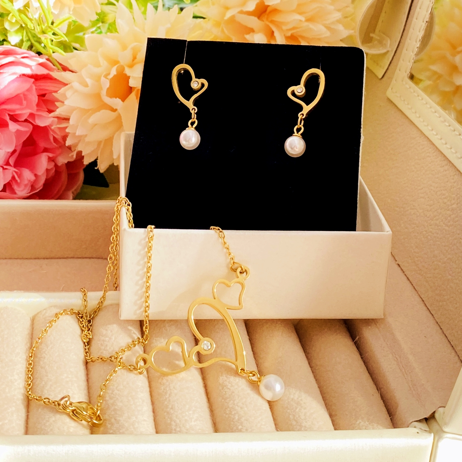 Set Colier & Cercei Inimi & Perle - Otel Inoxidabil