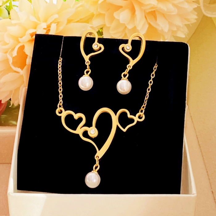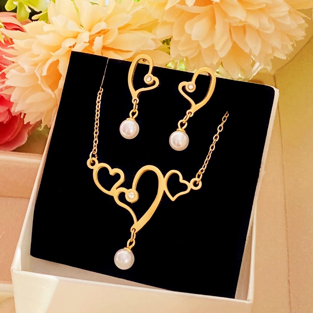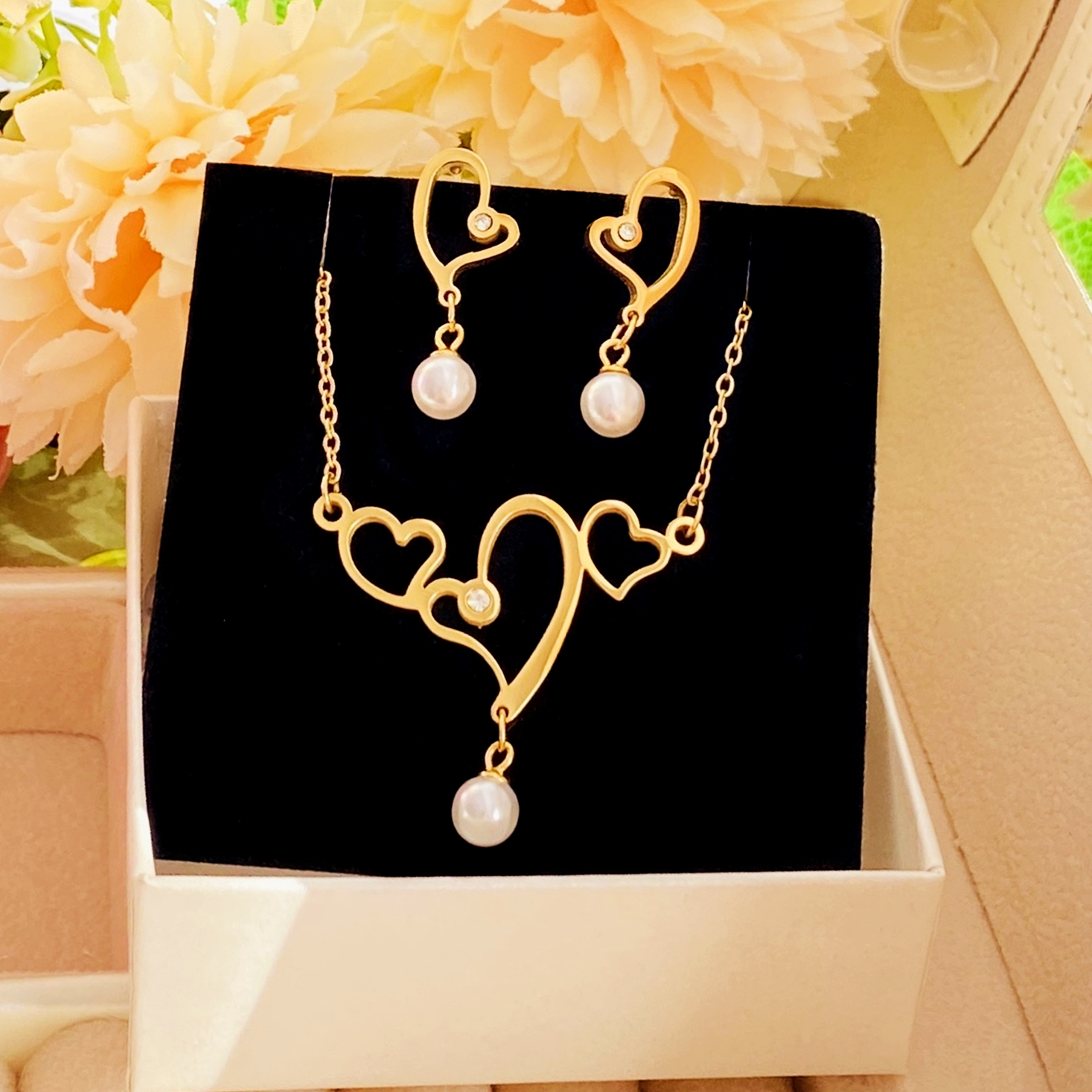 Set Colier & Cercei Inimi & Perle - Otel Inoxidabil