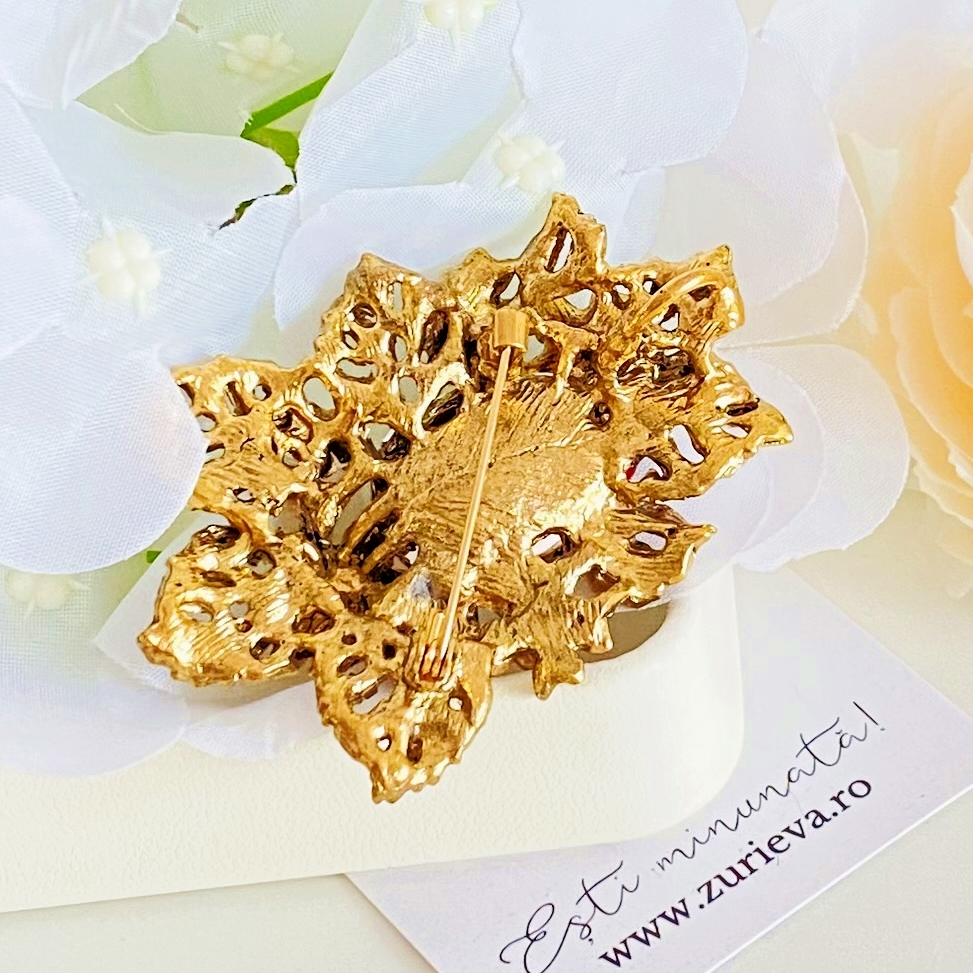 Brosa eleganta, plina de cristale, absolut superba, ce-ti poate completa cu succes o multime de tinute, scotandu-le din anonimat.