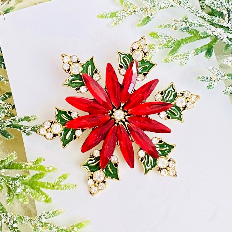 Brosa craciunistica, in forma de fulg de zapada, bogat decorata cu cristale colorate, perfecta pentru a fi oferita cadou celor dragi de Sarbatori.