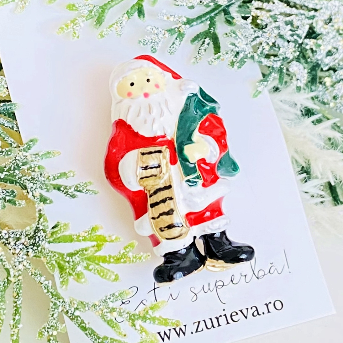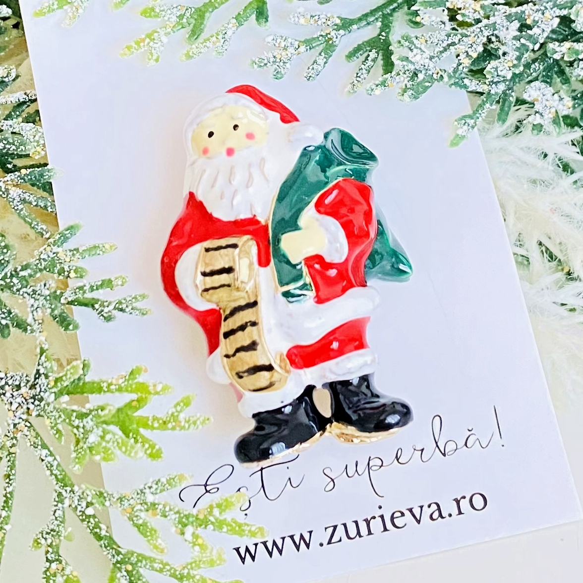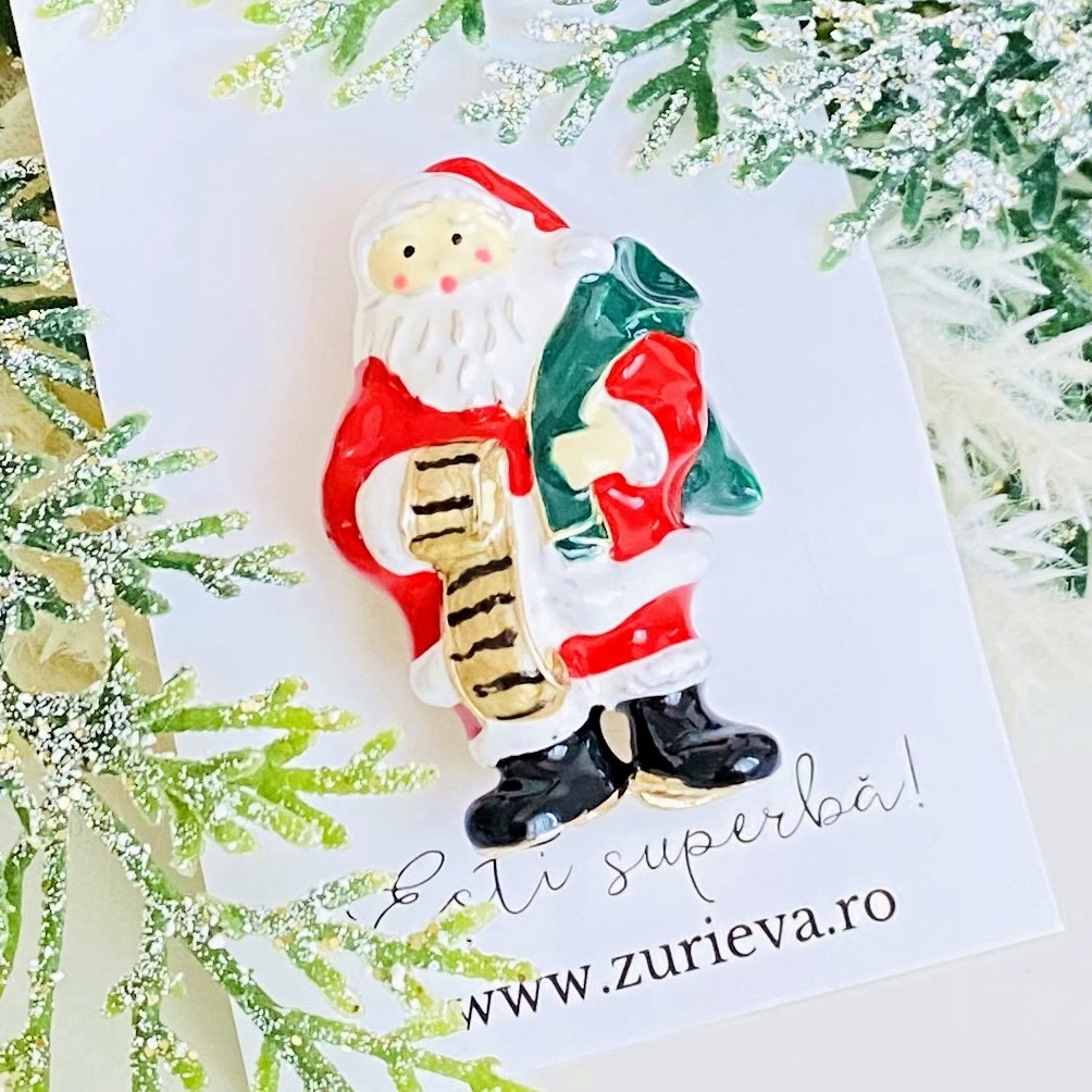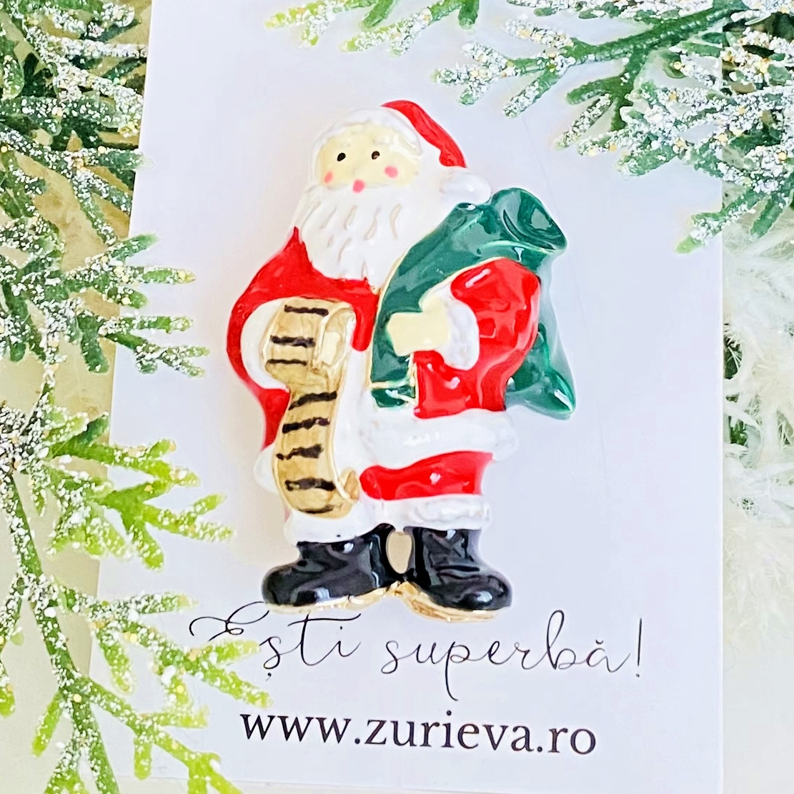Brosa craciunistica, in forma de Mos Craciun, bogat decorata cu email, perfecta pentru a fi oferita cadou celor dragi de Sarbatori.