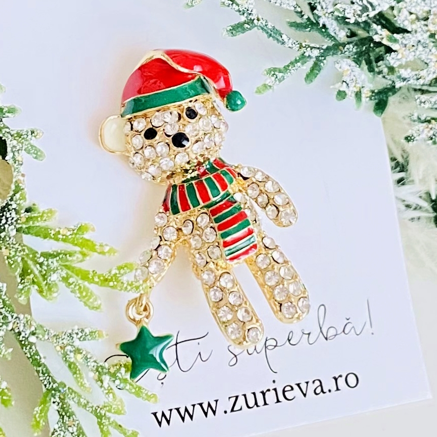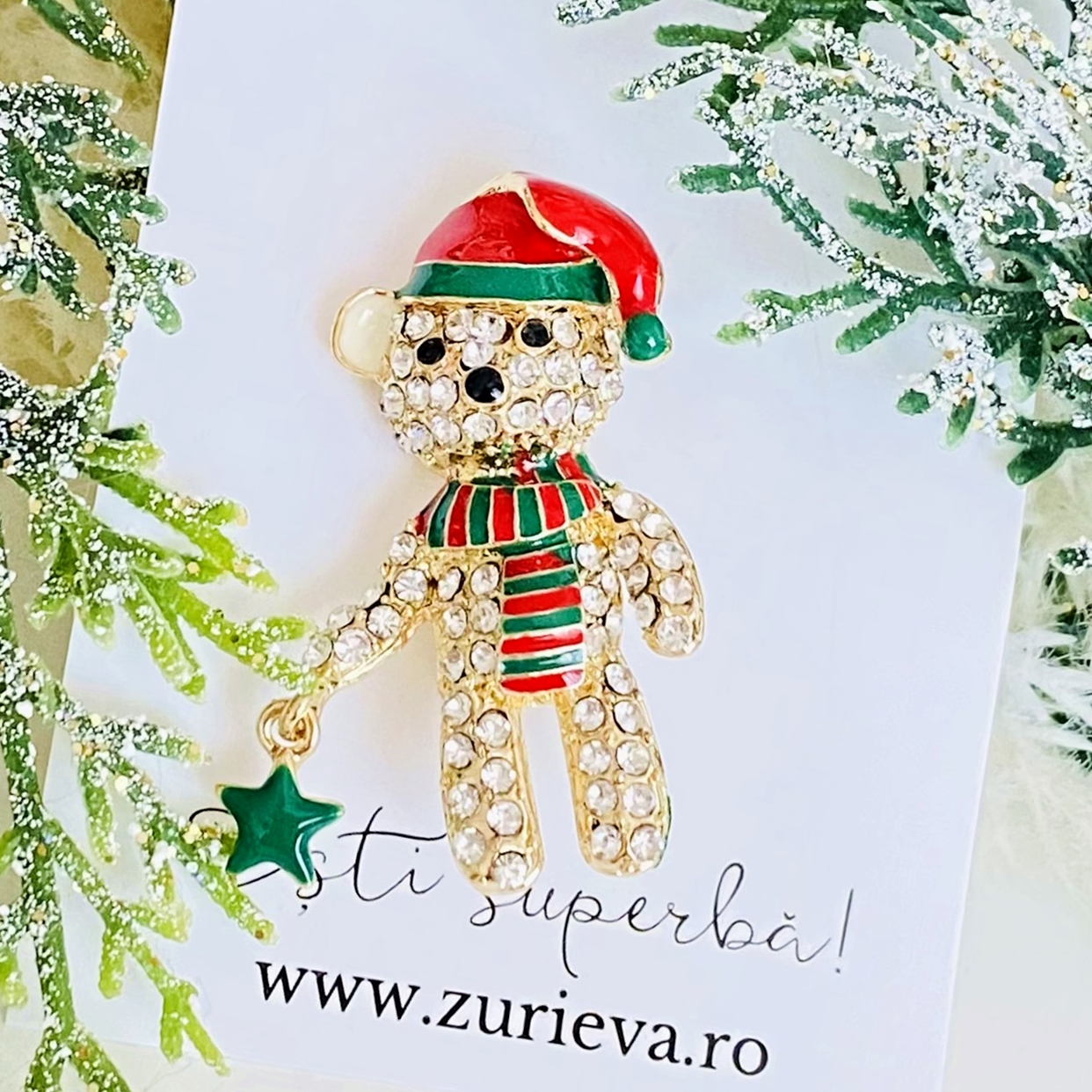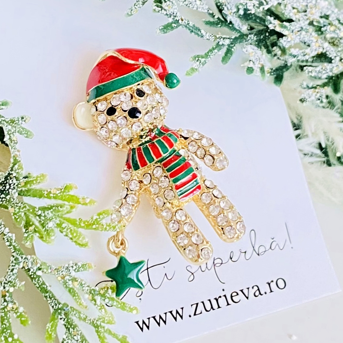 Brosa craciunistica, in forma de ursulet, bogat decorata cu cristale, perfecta pentru a fi oferita cadou celor dragi de Sarbatori.