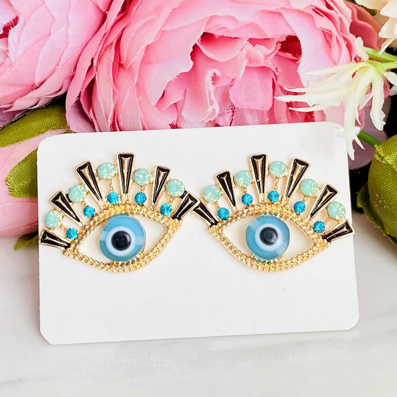 Cercei decorati cu cristale colorate si evil eye, perfecti pentru a-ti completa tinutele preferate.