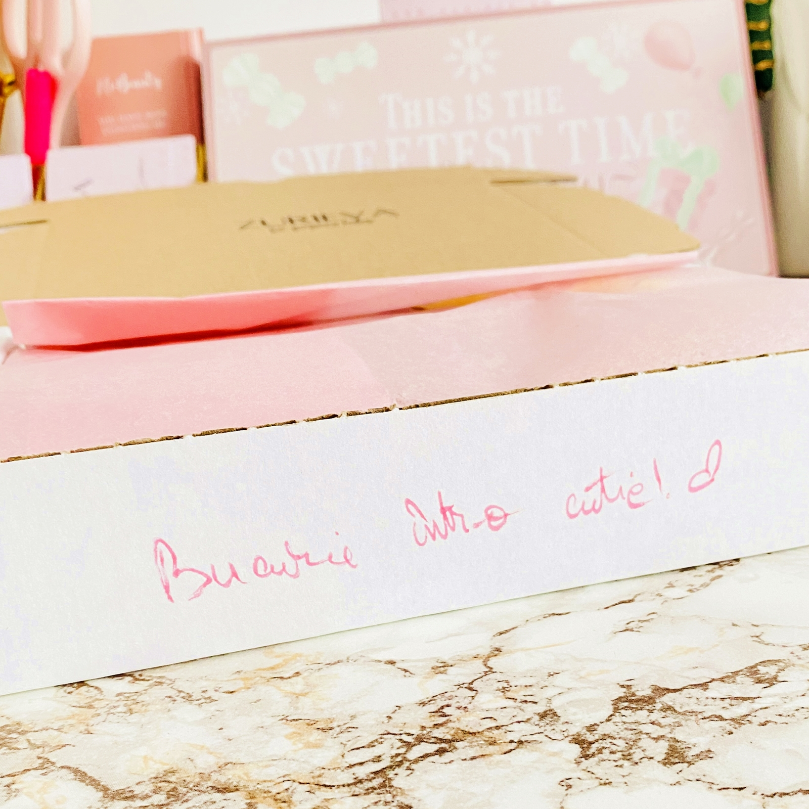 Fiecare gift box vine insotit de mesajul "Bucurie intr-o cutie!", dar, la cerere, putem scrie mesajul dorit de tine.