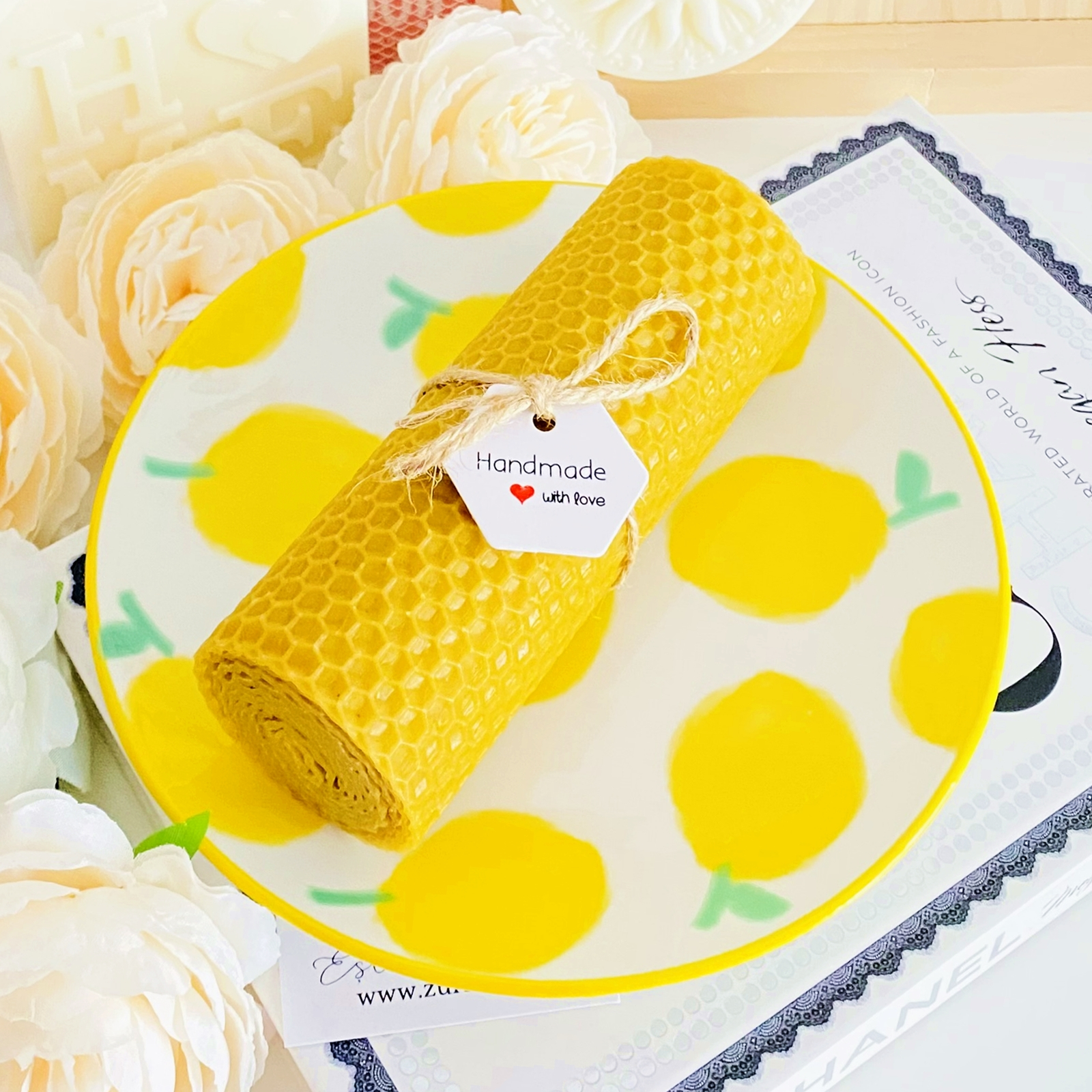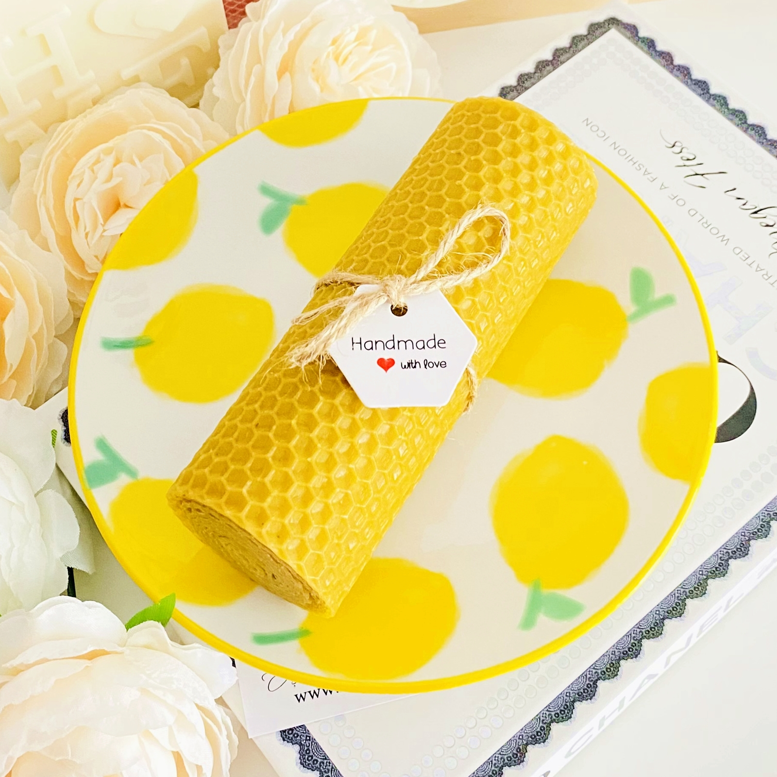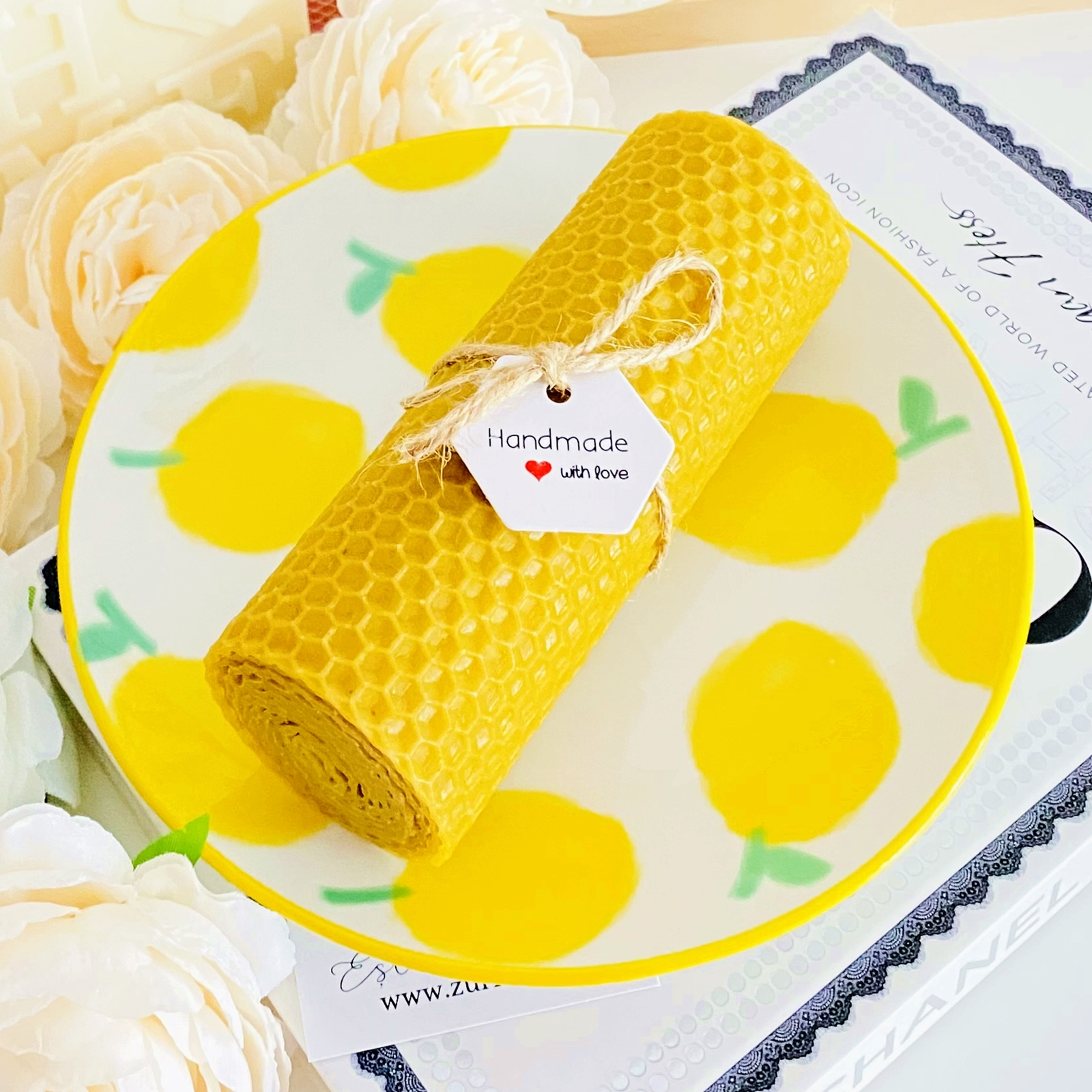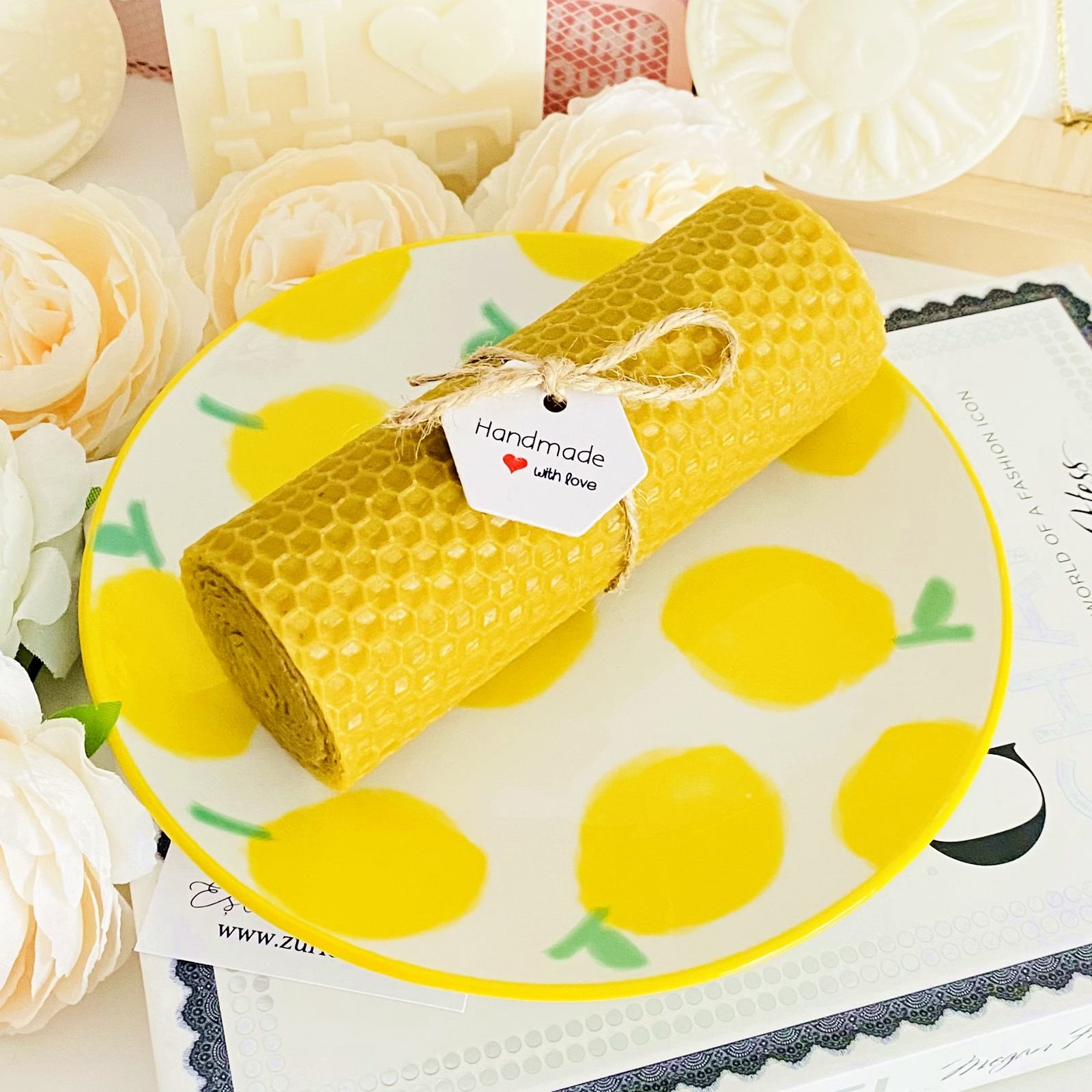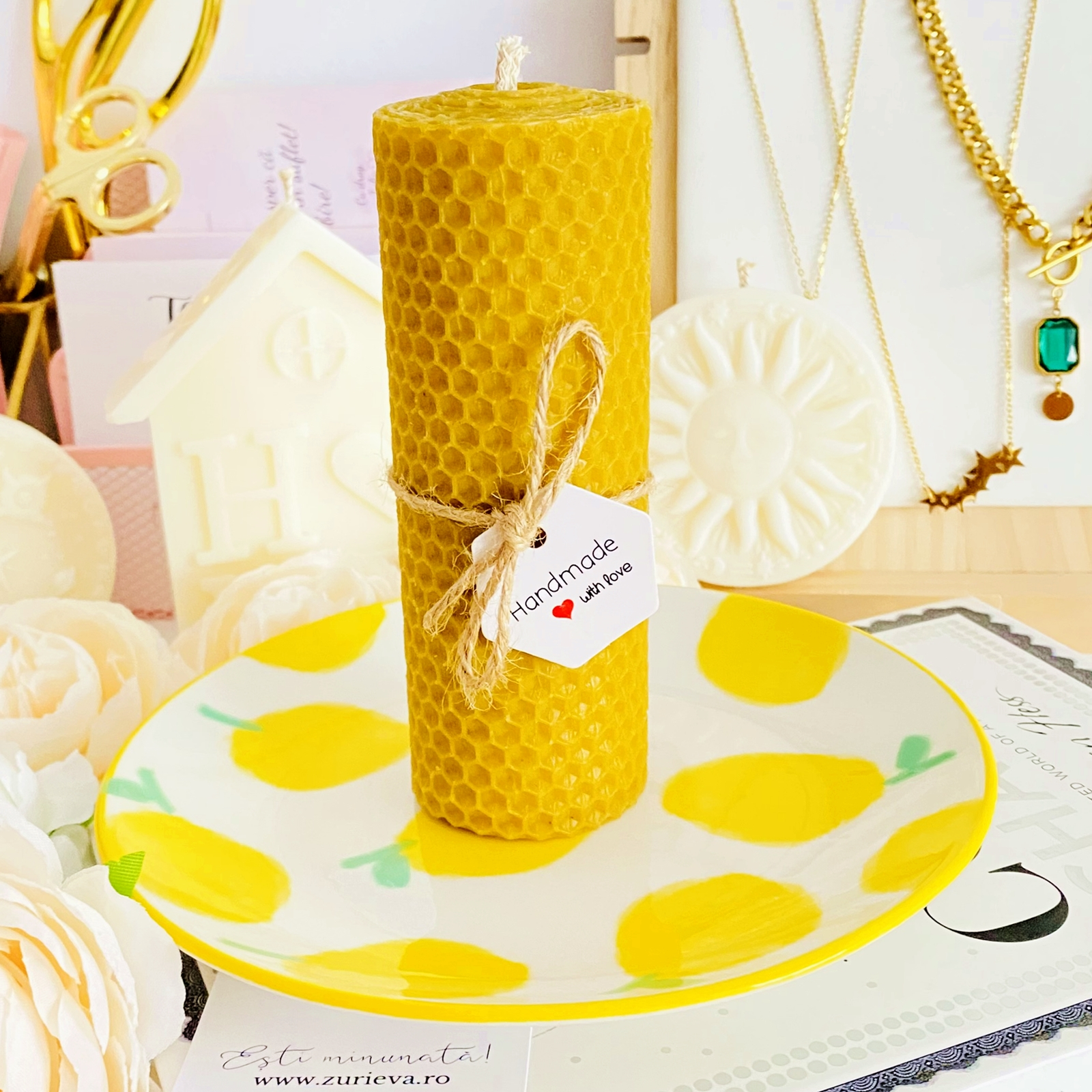 Set cadou format dintr-o farfurie din ceramica si lumanare handmade din ceara naturala de albine si fitil bumbac, rulata manual in atelierul nostru.