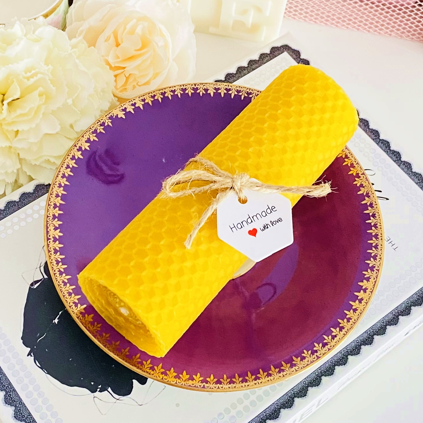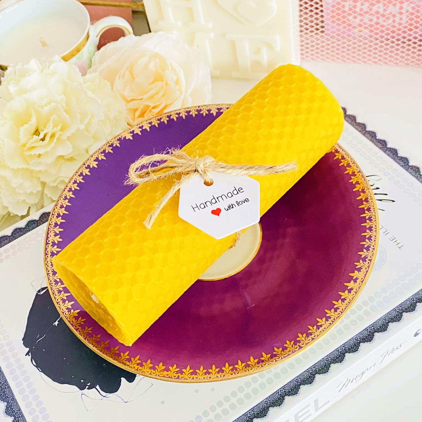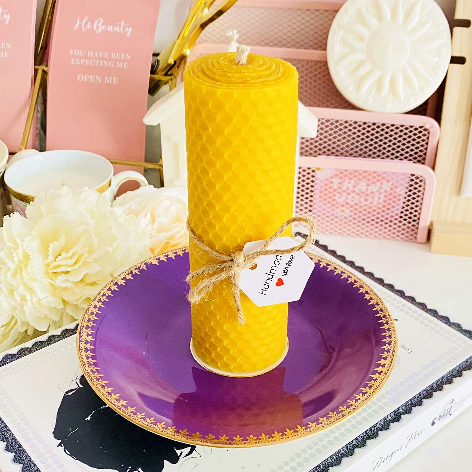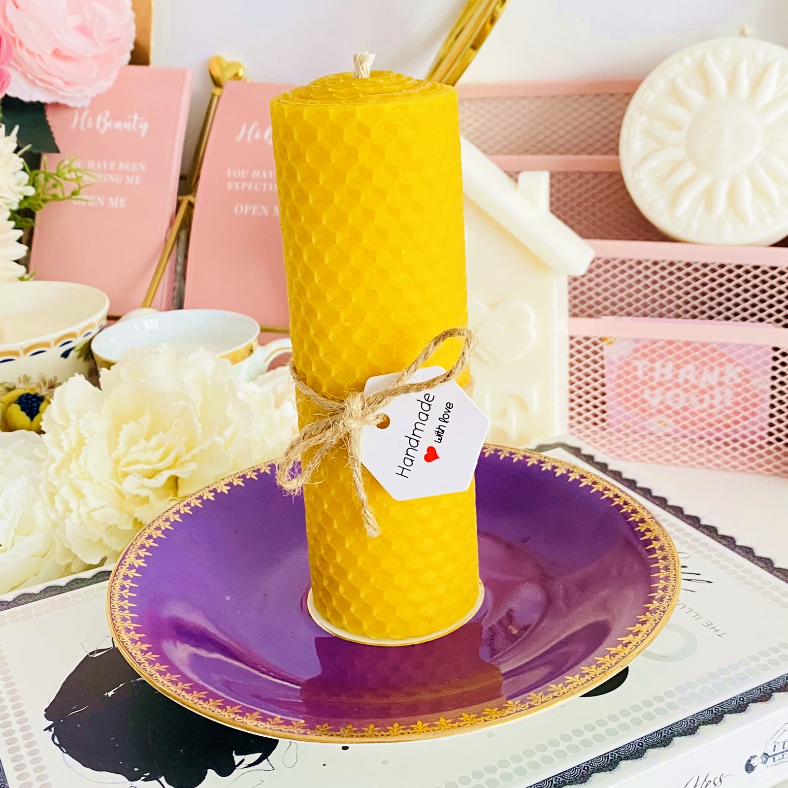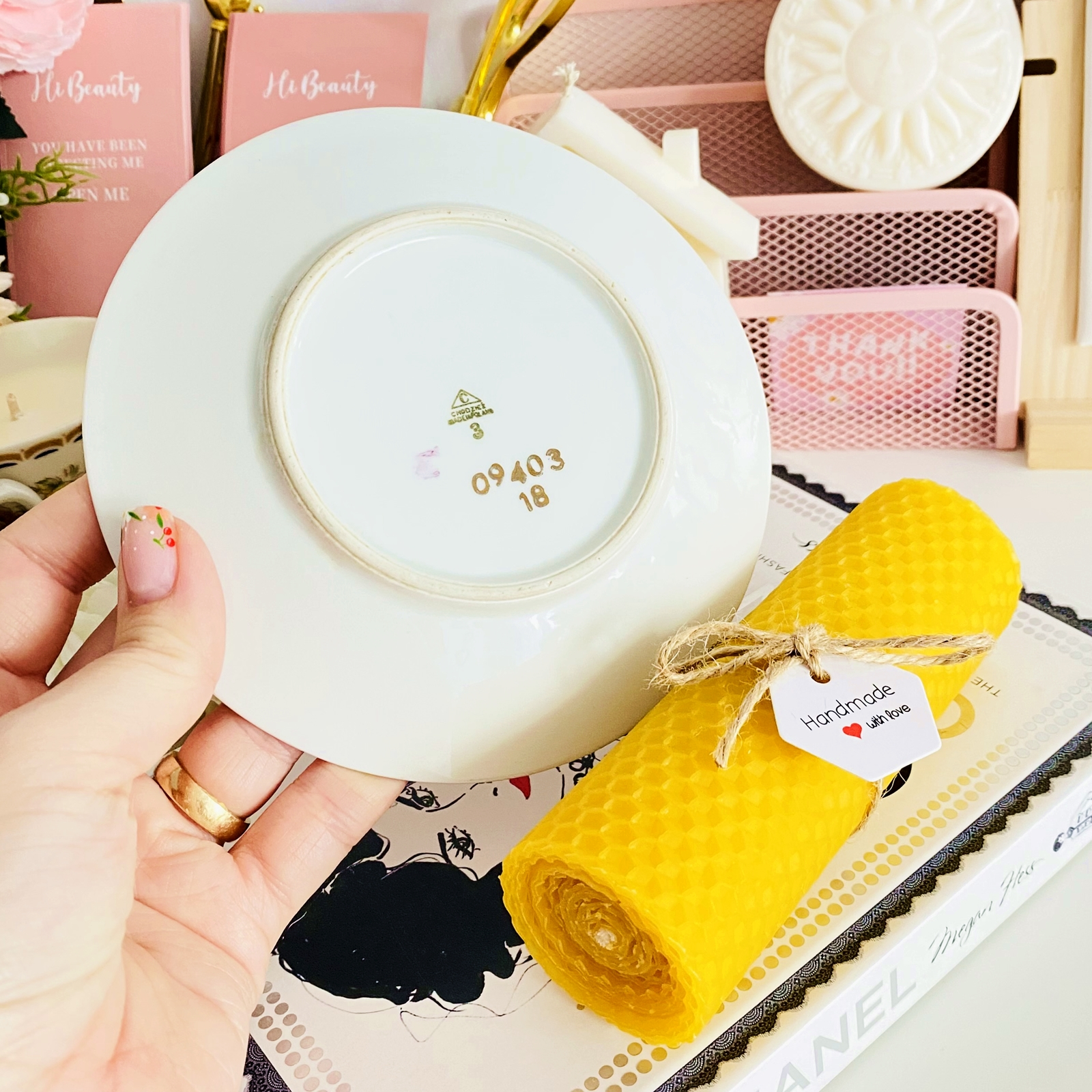 Set cadou format dintr-o farfurie mica vintage din portelan si lumanare handmade din ceara naturala de albine si fitil bumbac, rulata manual in atelierul nostru.