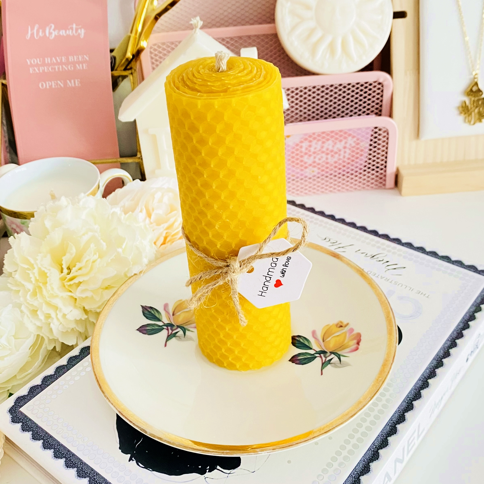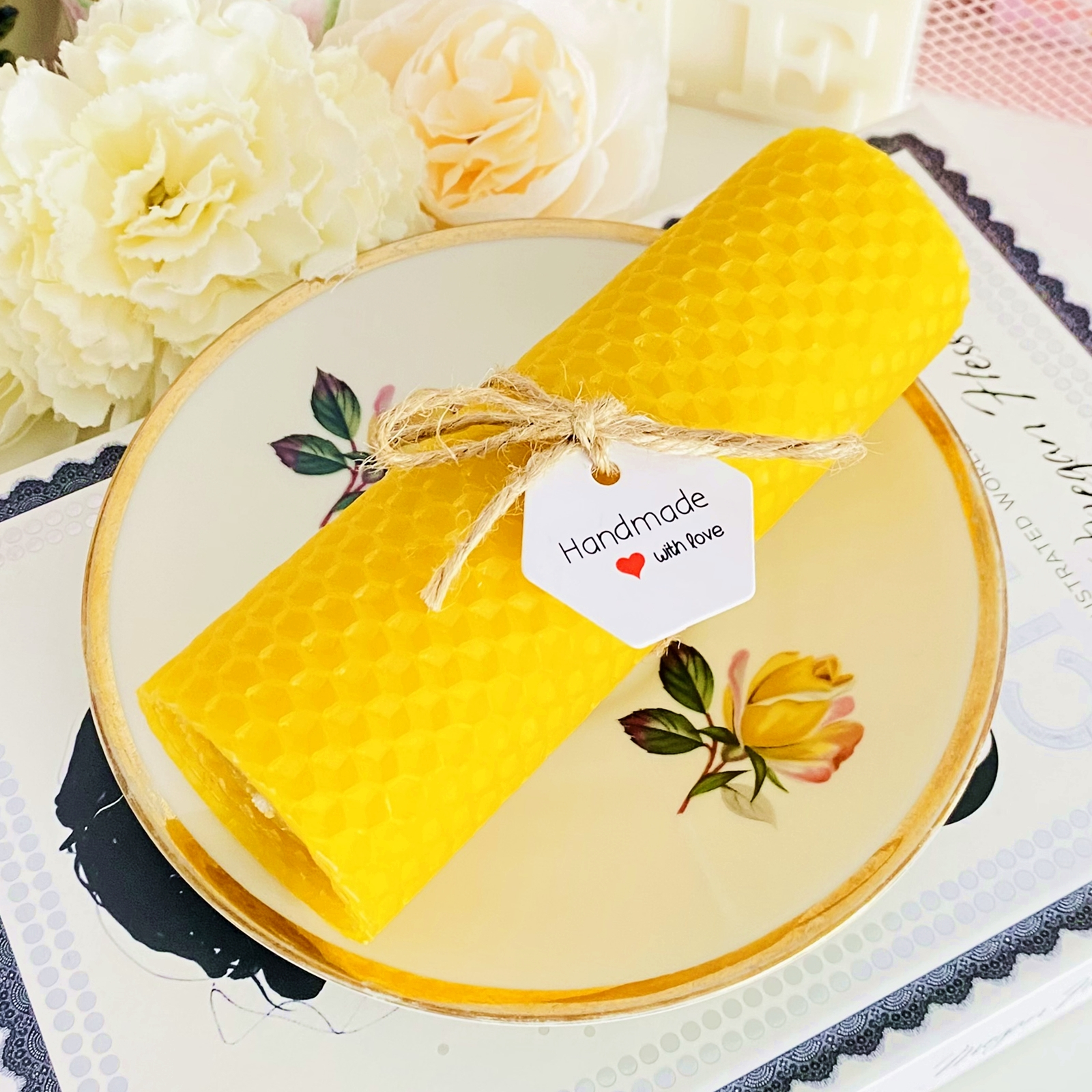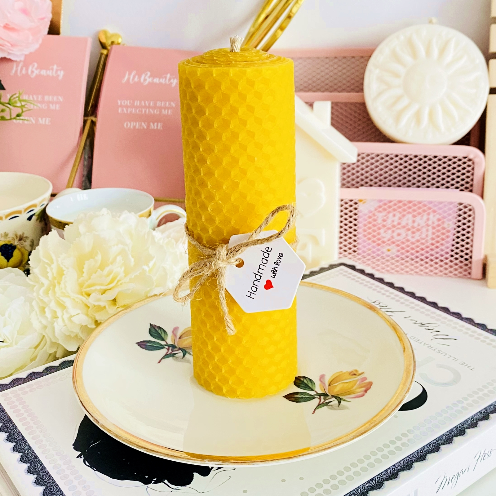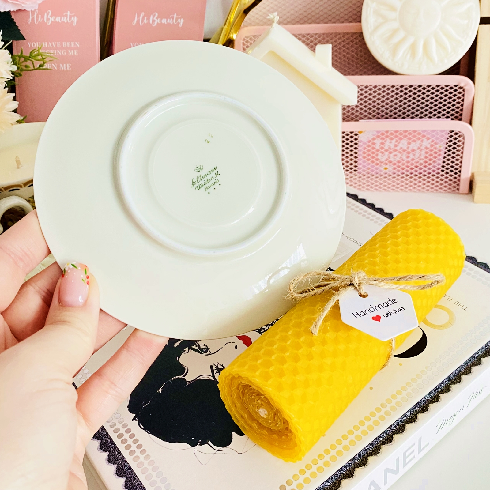 Set cadou format dintr-o farfurie mica vintage din portelan si lumanare handmade din ceara naturala de albine si fitil bumbac, rulata manual in atelierul nostru.
