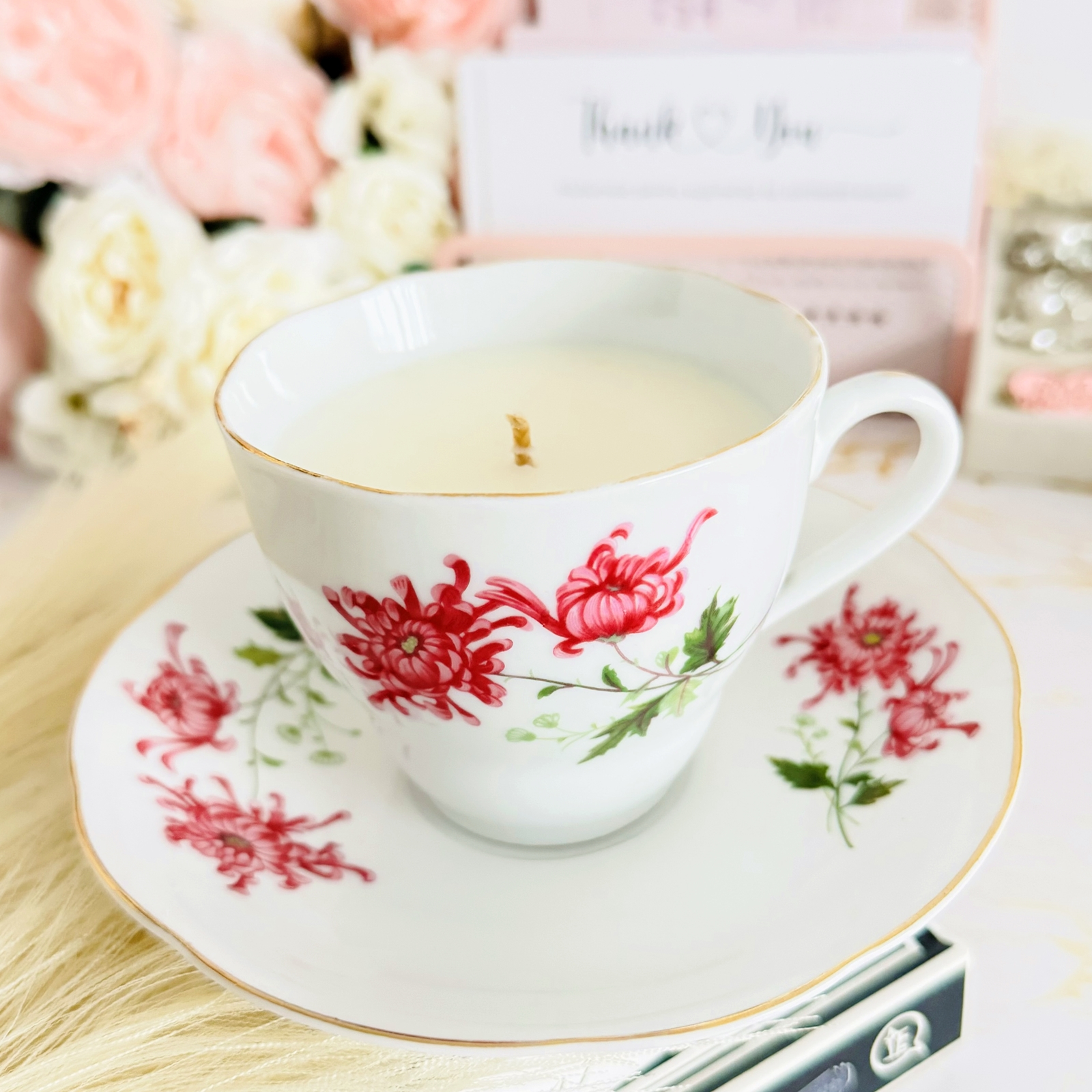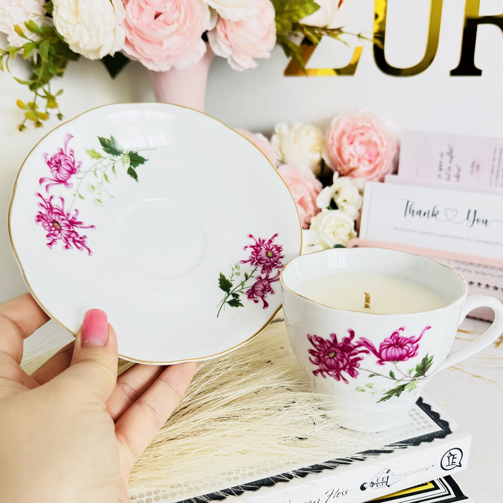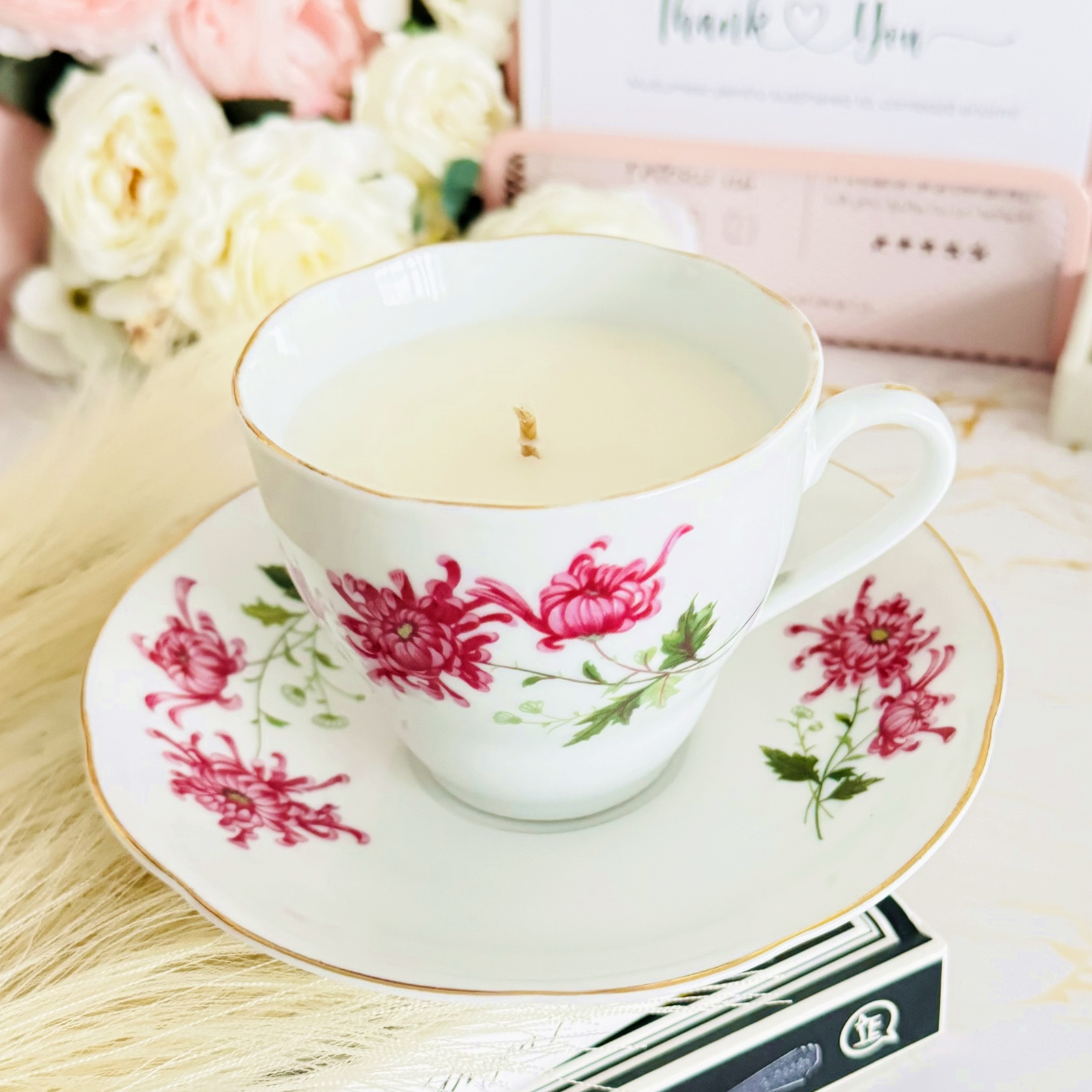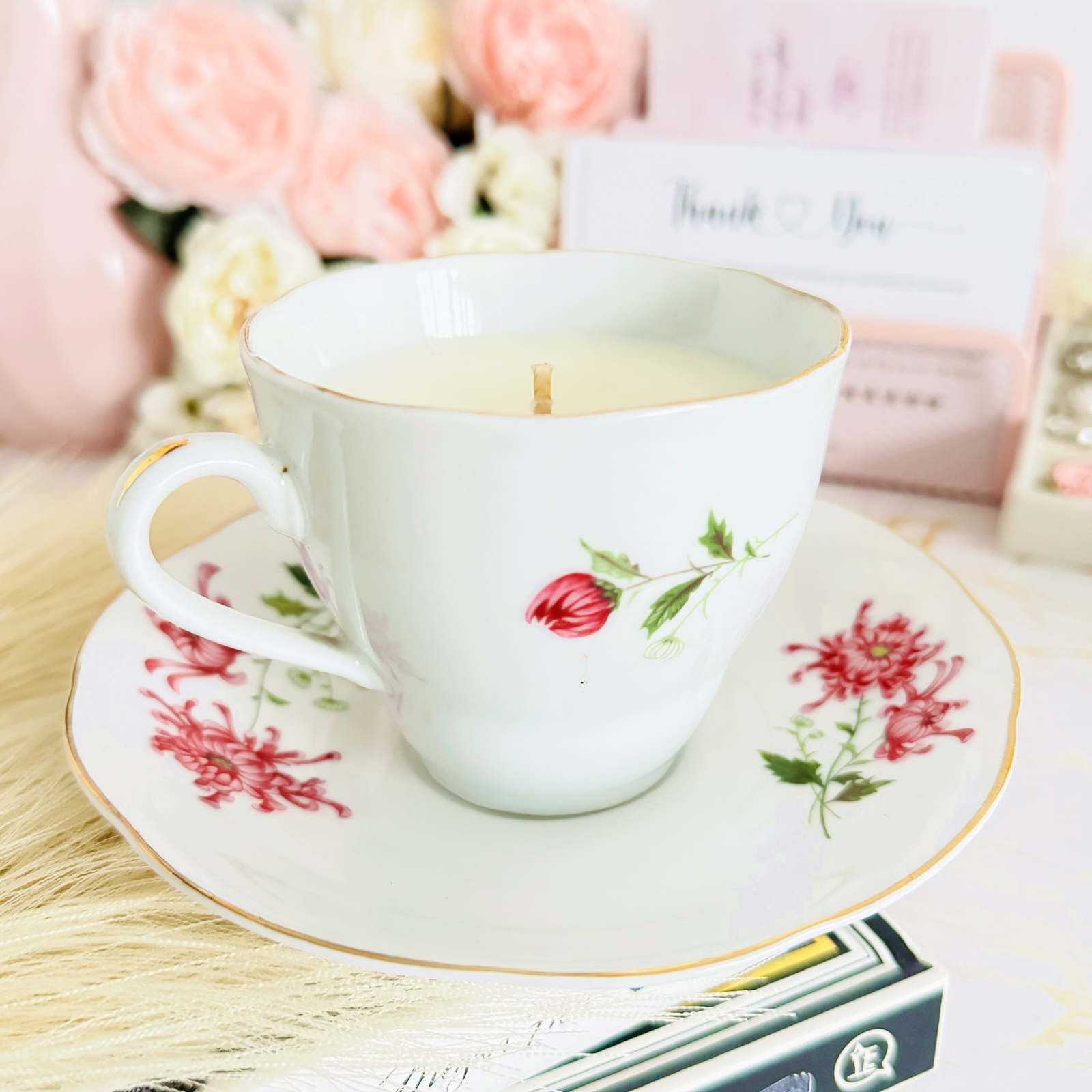 Lumanare parfumata din ceara de soia, 100% naturala, turnata manual intr-o ceasca vintage din portelan si cu fitil din bumbac.