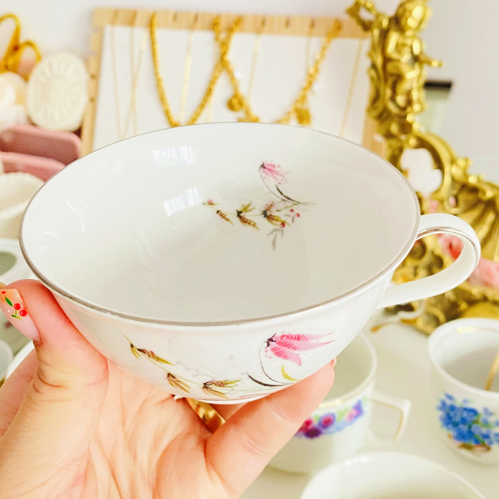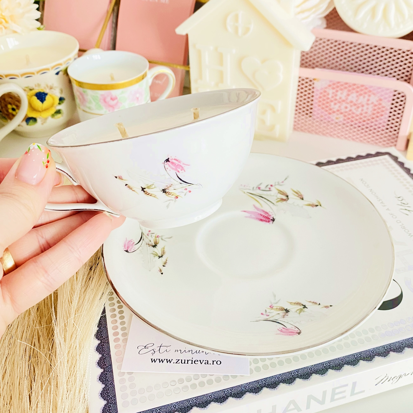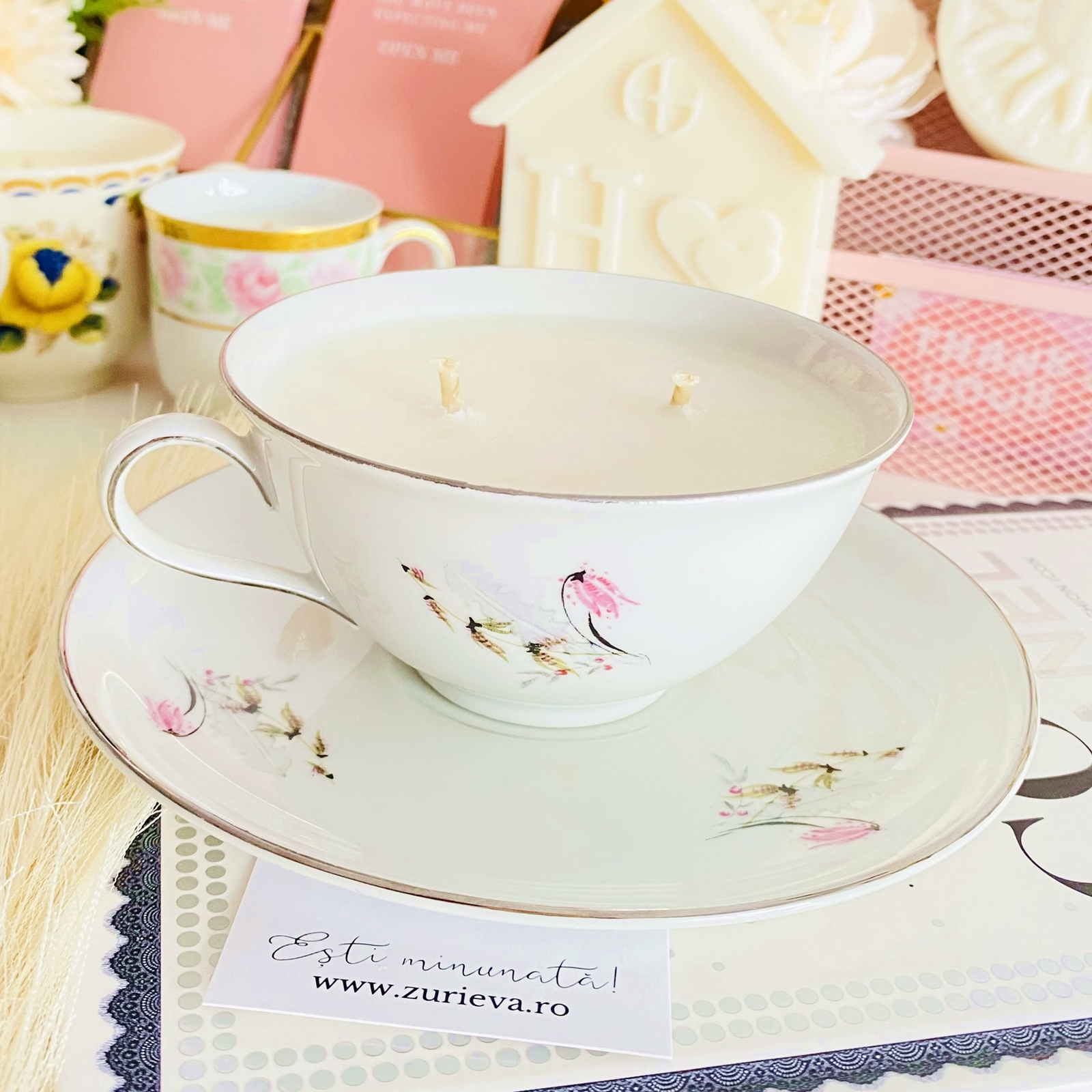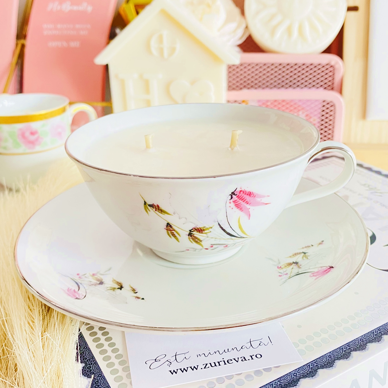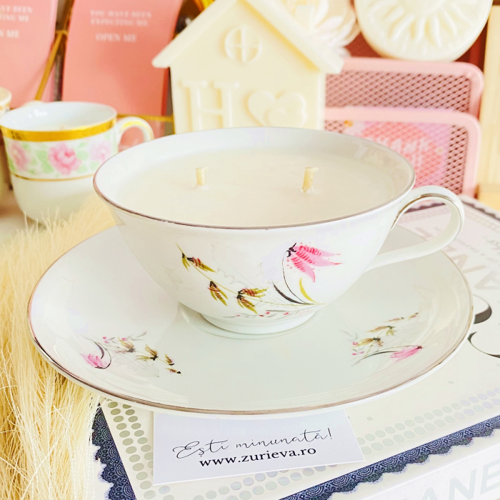 Lumanare parfumata din ceara de soia, 100% naturala, turnata manual intr-o ceasca din portelan vintage si cu fitil din bumbac.