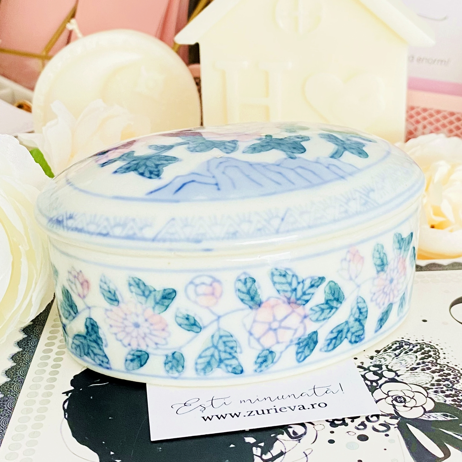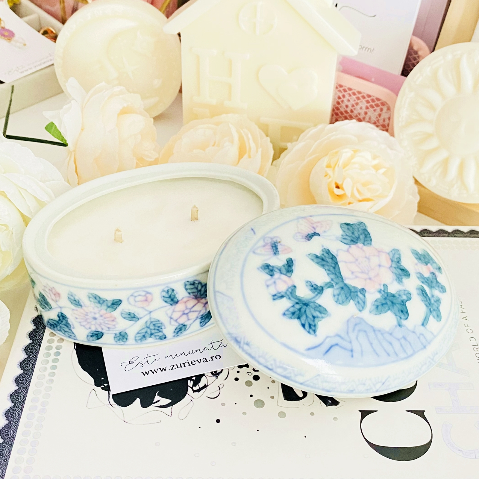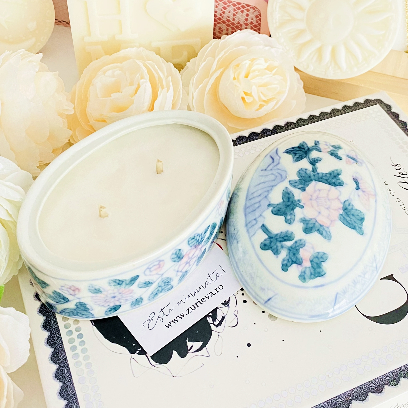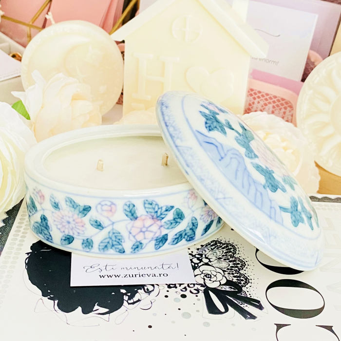 Lumanare parfumata din ceara de soia, 100% naturala, turnata manual intr-o bomboniera vintage din portelan si cu fitil din bumbac.