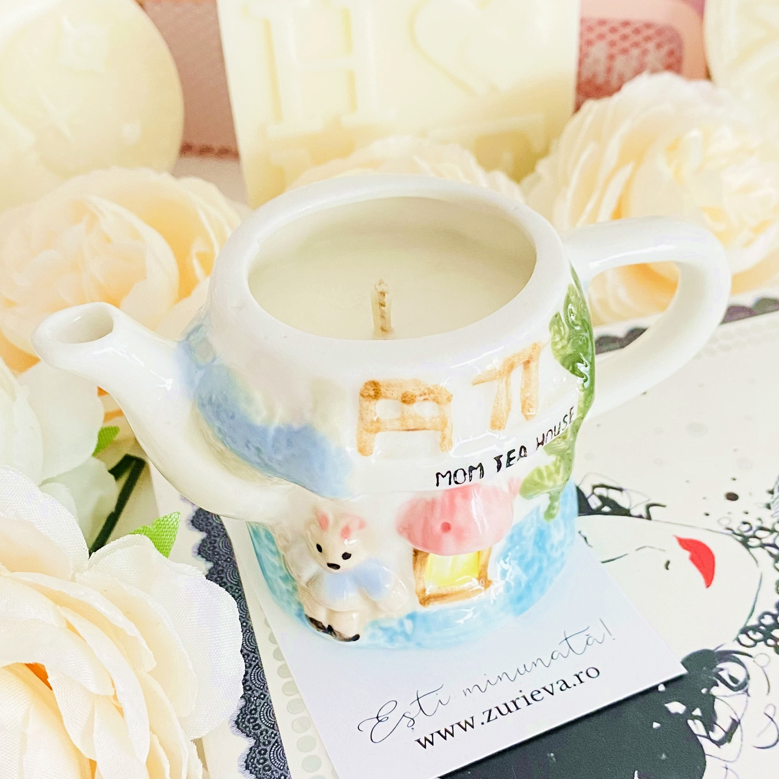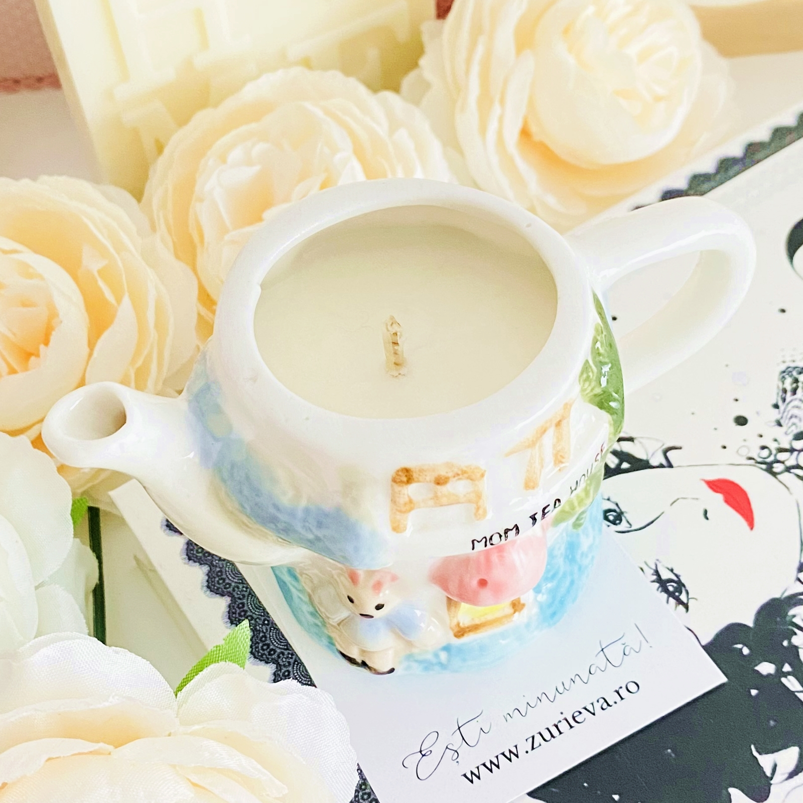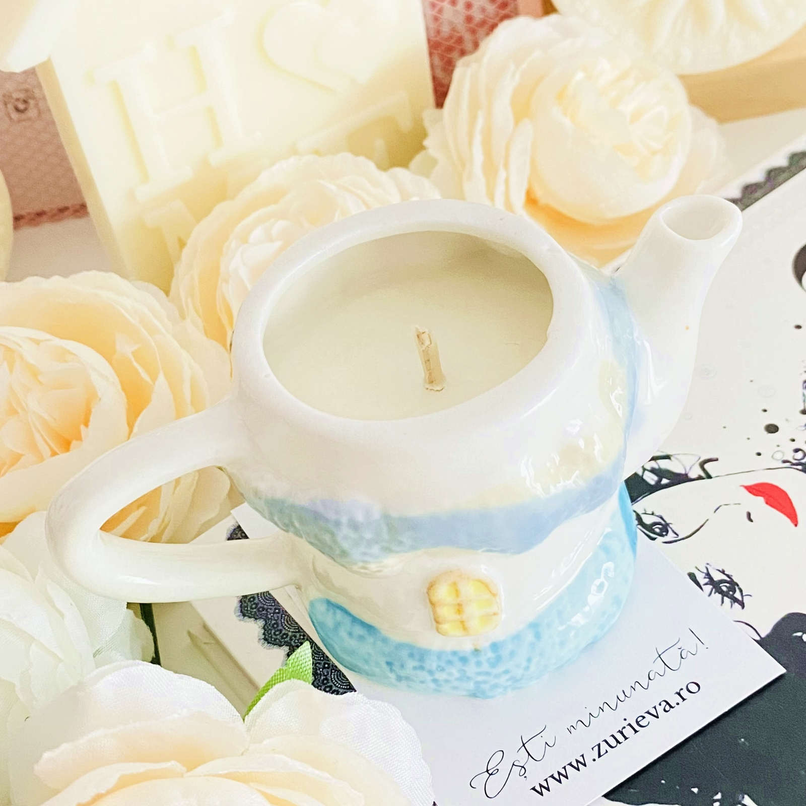 Lumanare parfumata din ceara de soia, 100% naturala, turnata manual intr-un mini ceainic in forma de casuta vintage din ceramica si cu fitil din bumbac.