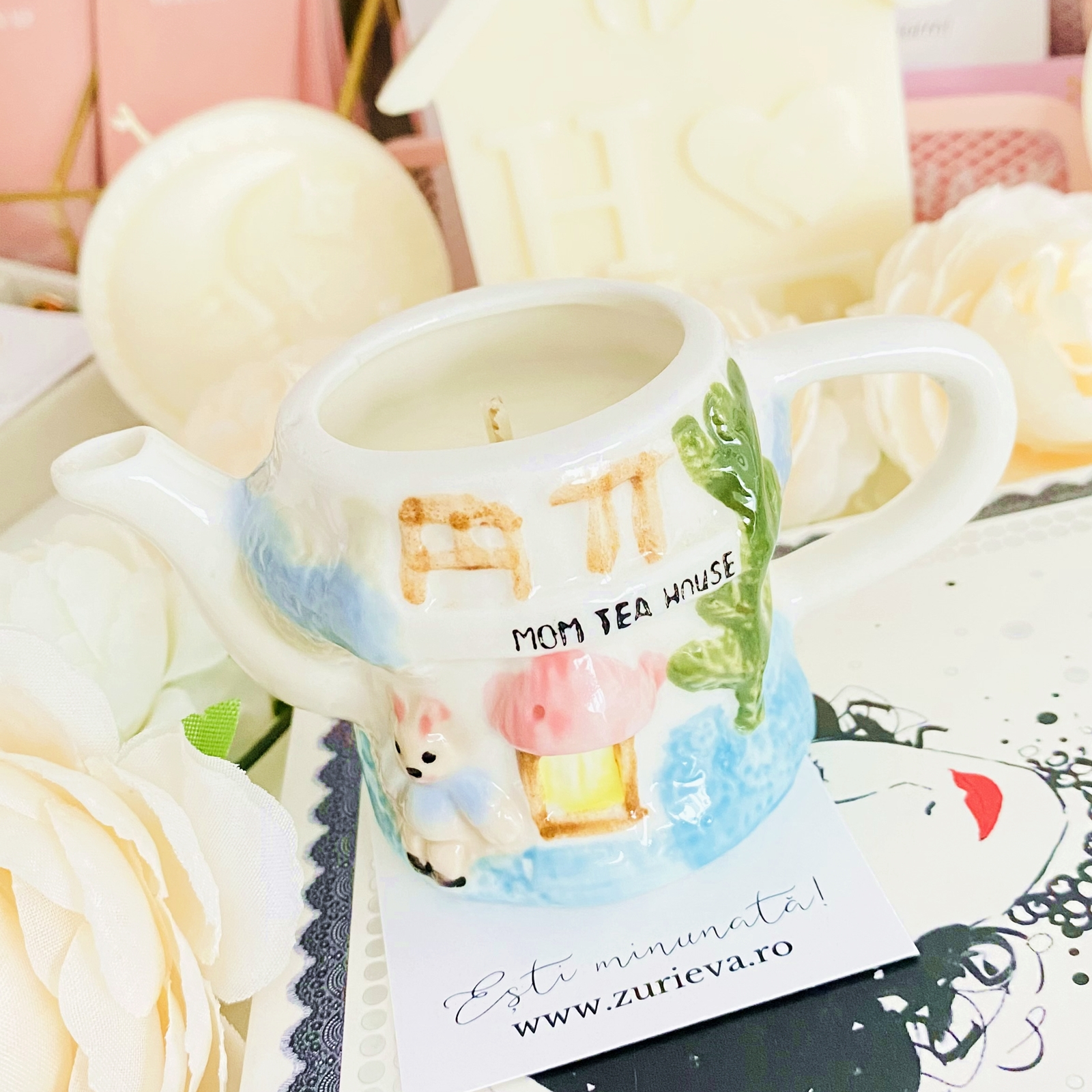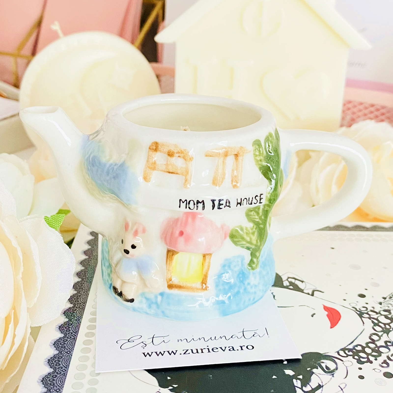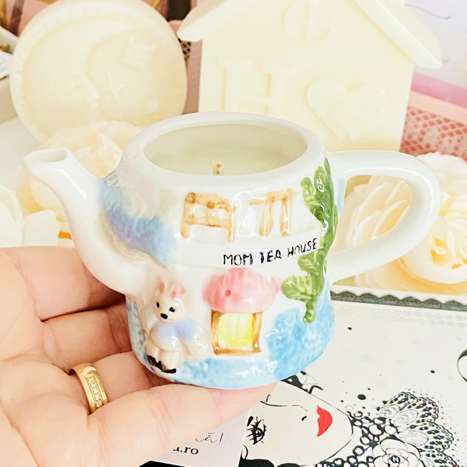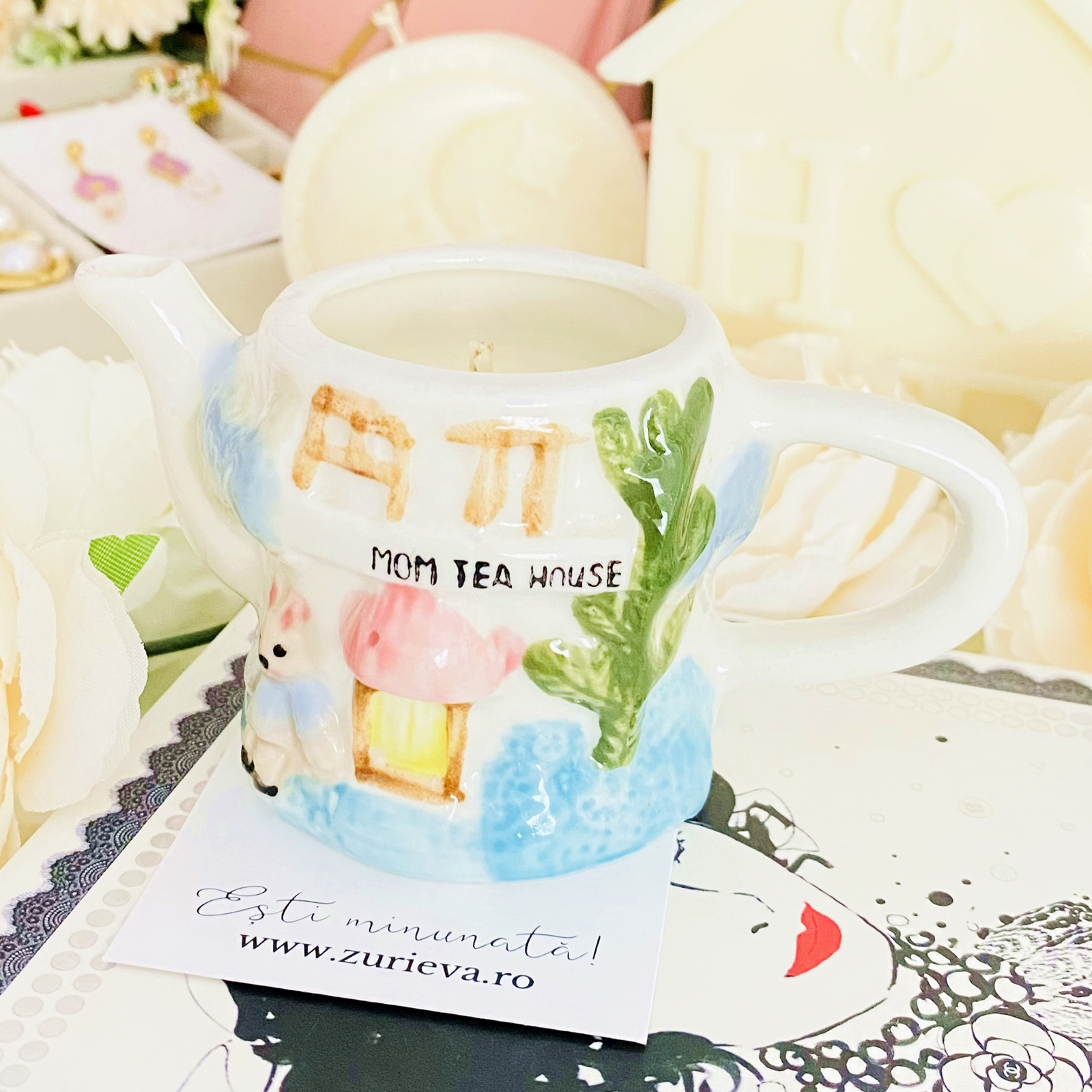 Lumanare parfumata din ceara de soia, 100% naturala, turnata manual intr-un mini ceainic in forma de casuta vintage din ceramica si cu fitil din bumbac.