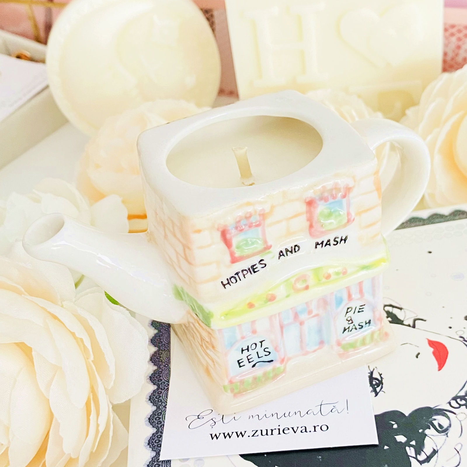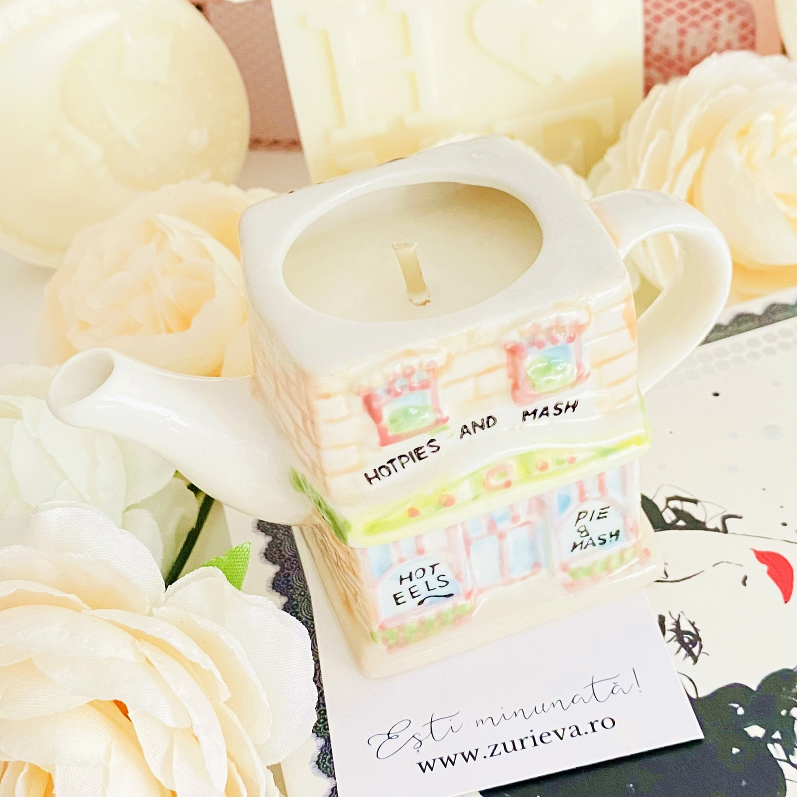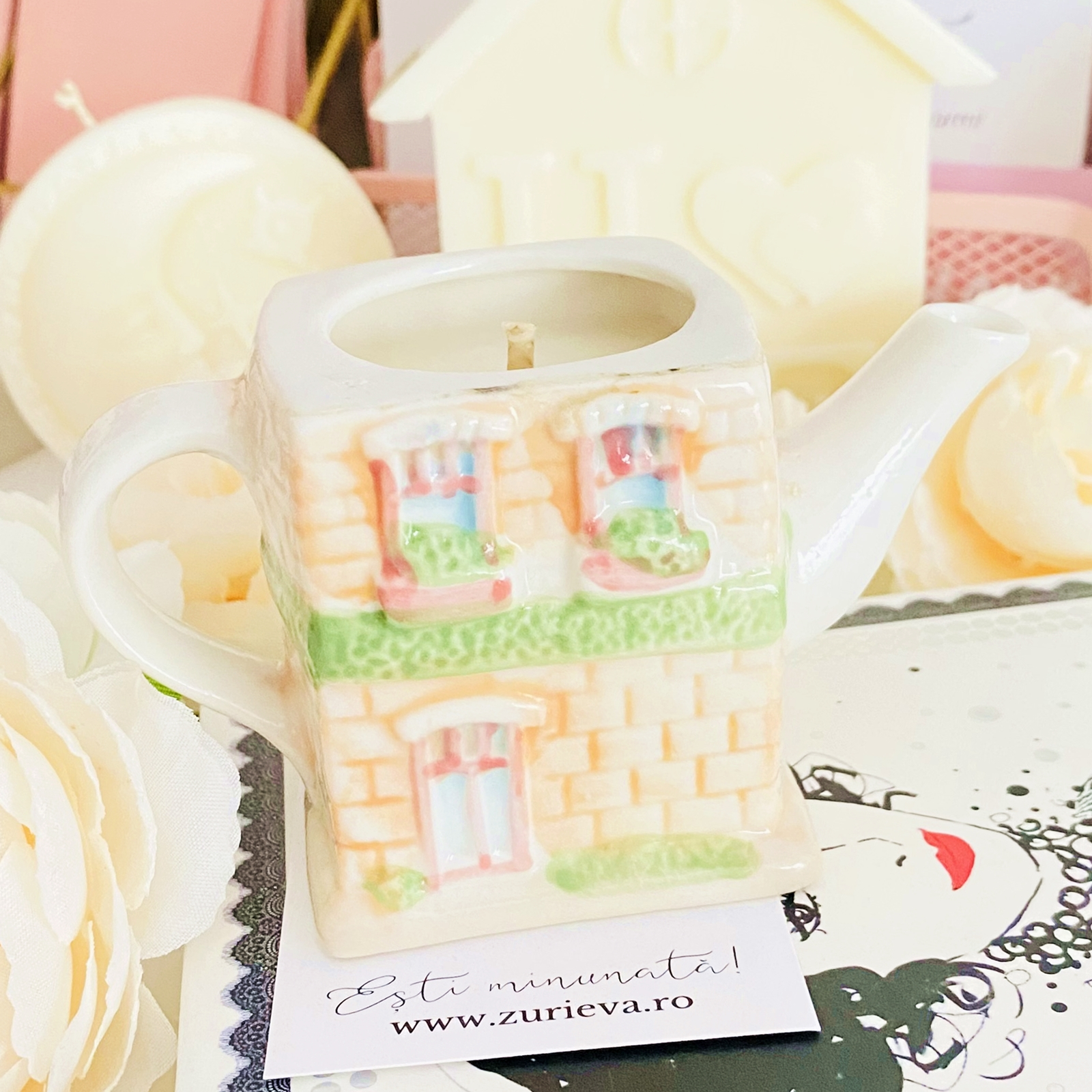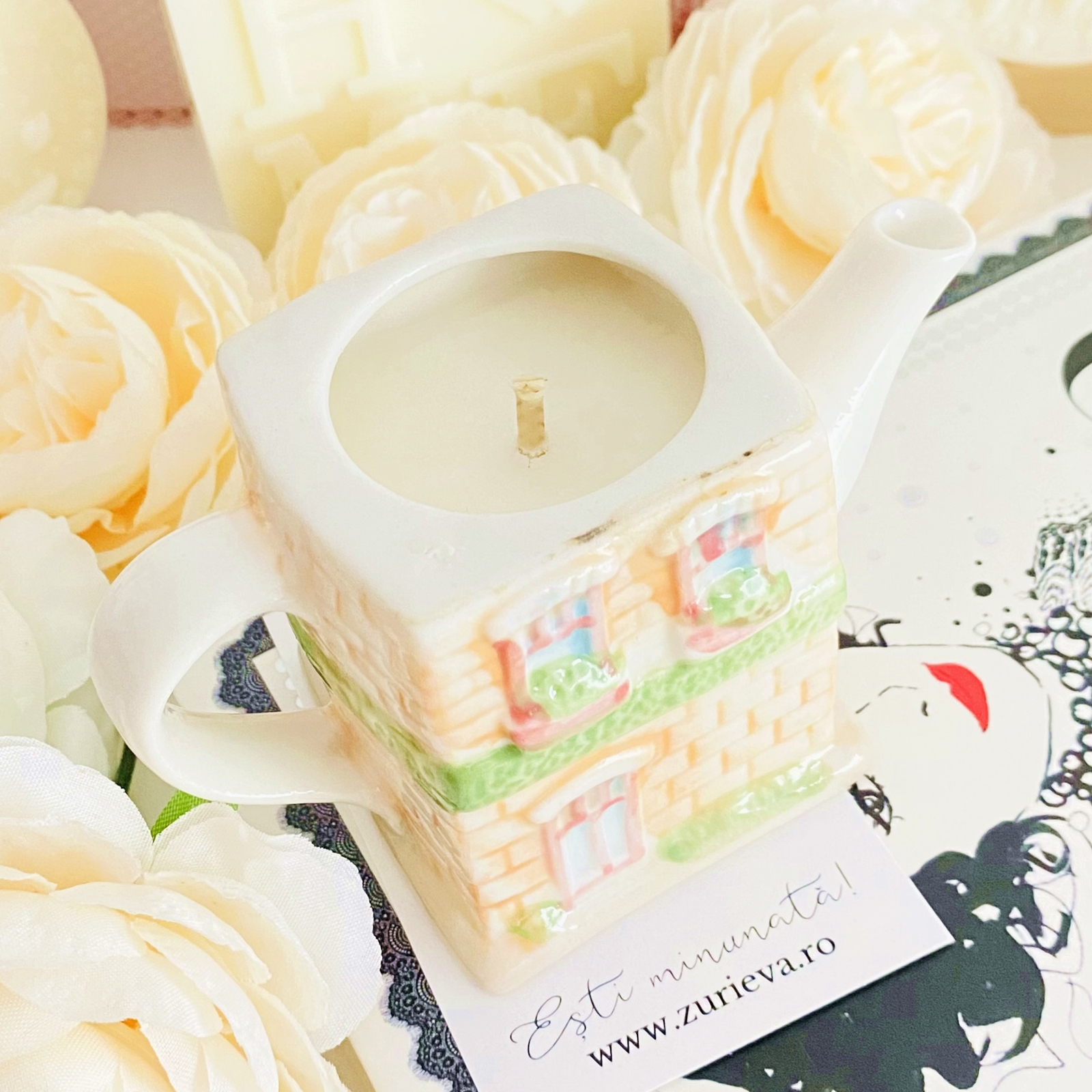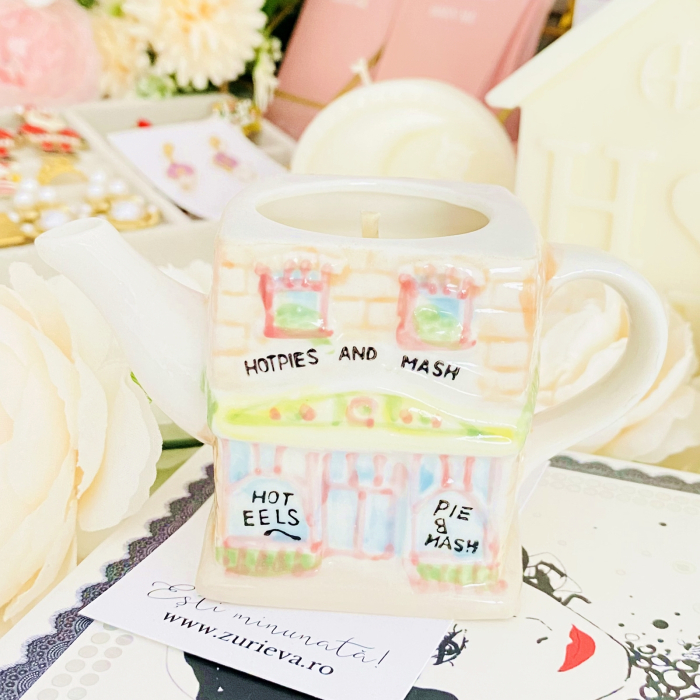 Lumanare parfumata din ceara de soia, 100% naturala, turnata manual intr-un mini ceainic in forma de casuta vintage din ceramica si cu fitil din bumbac.