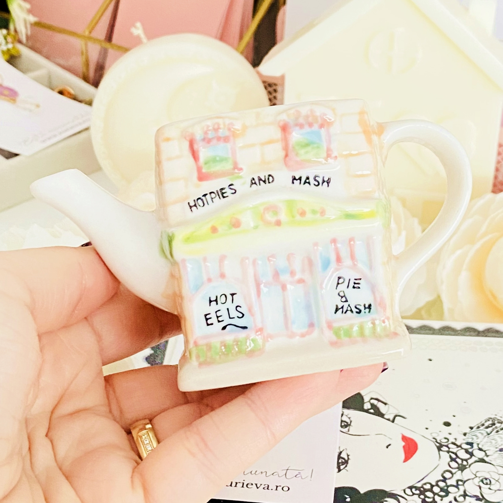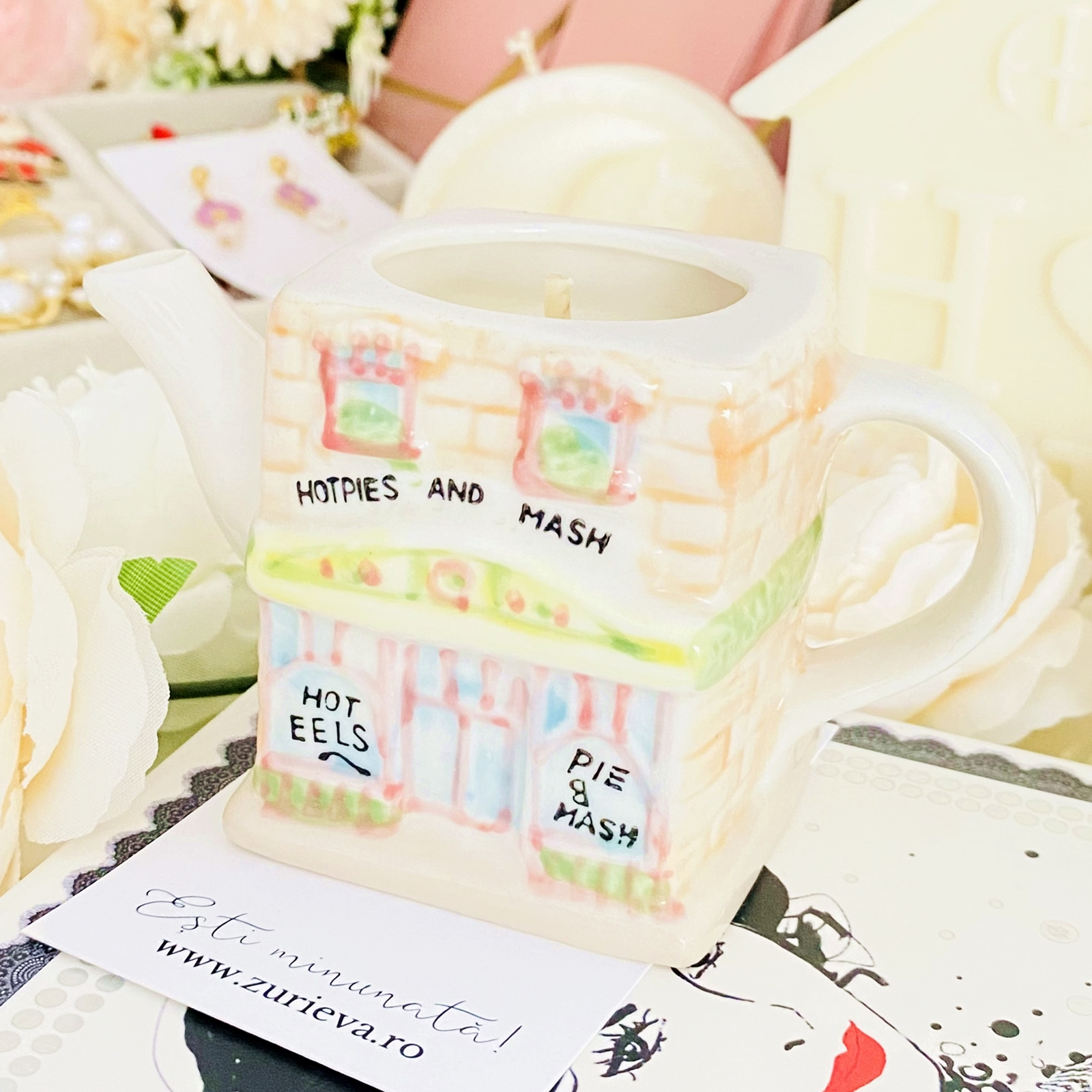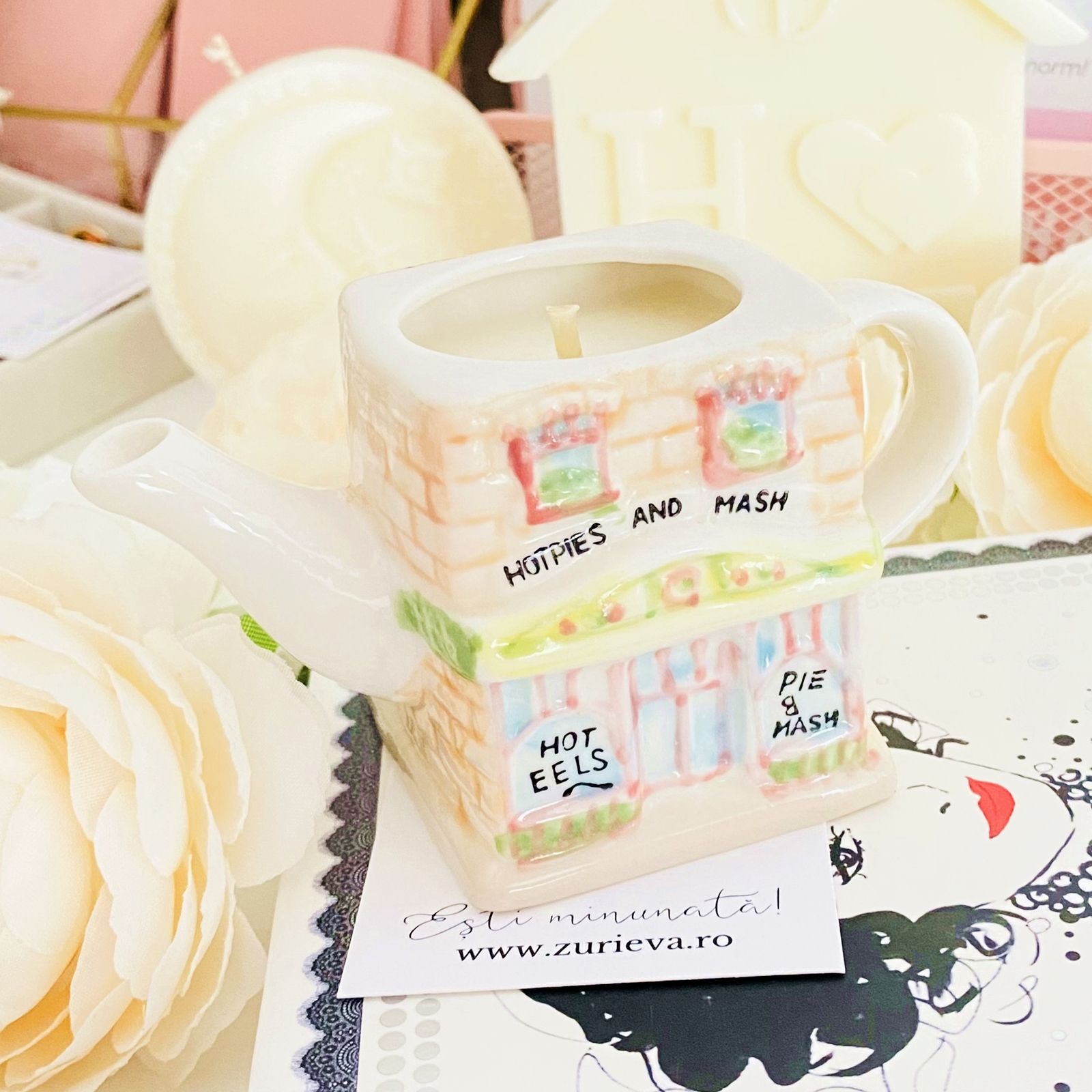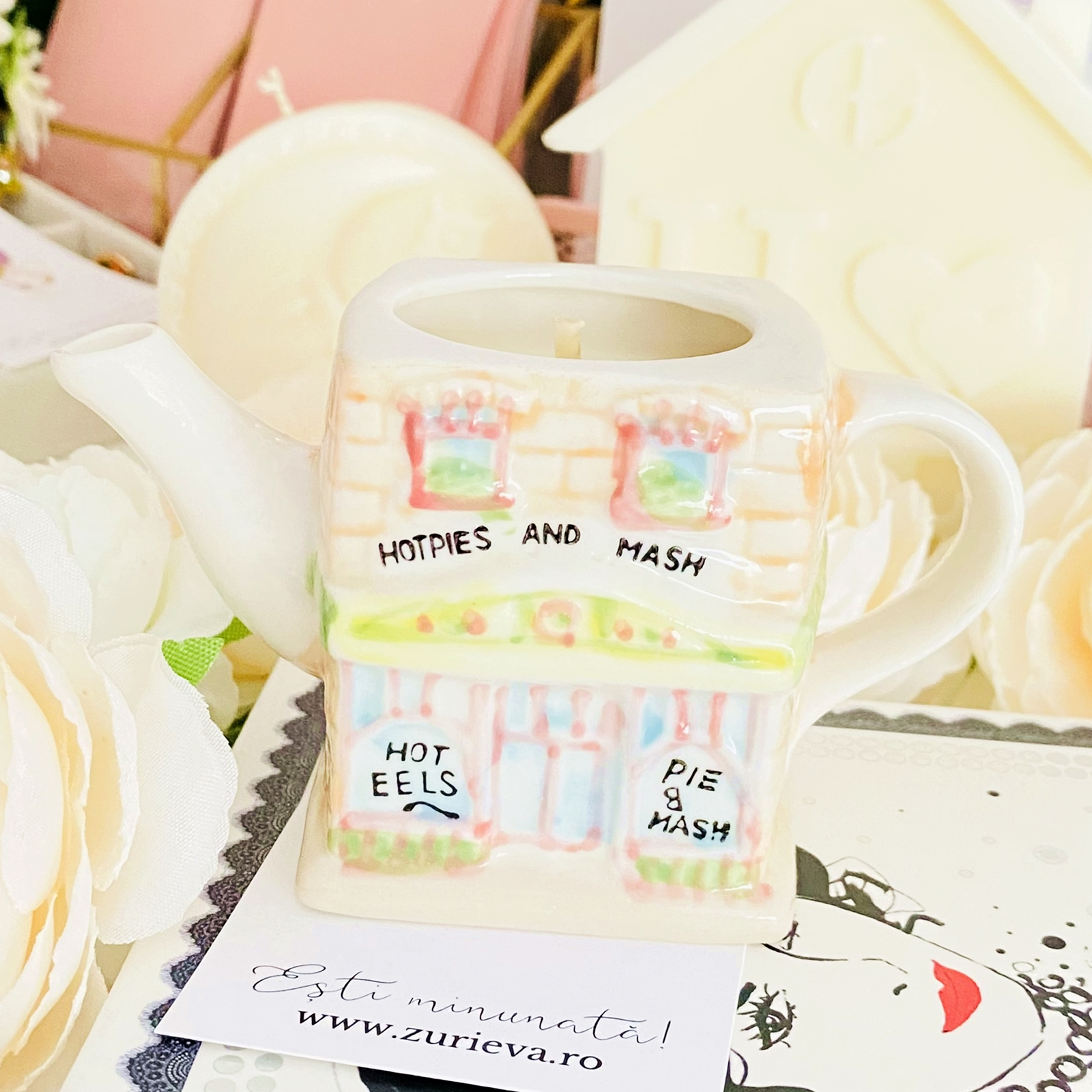 Lumanare parfumata din ceara de soia, 100% naturala, turnata manual intr-un mini ceainic in forma de casuta vintage din ceramica si cu fitil din bumbac.