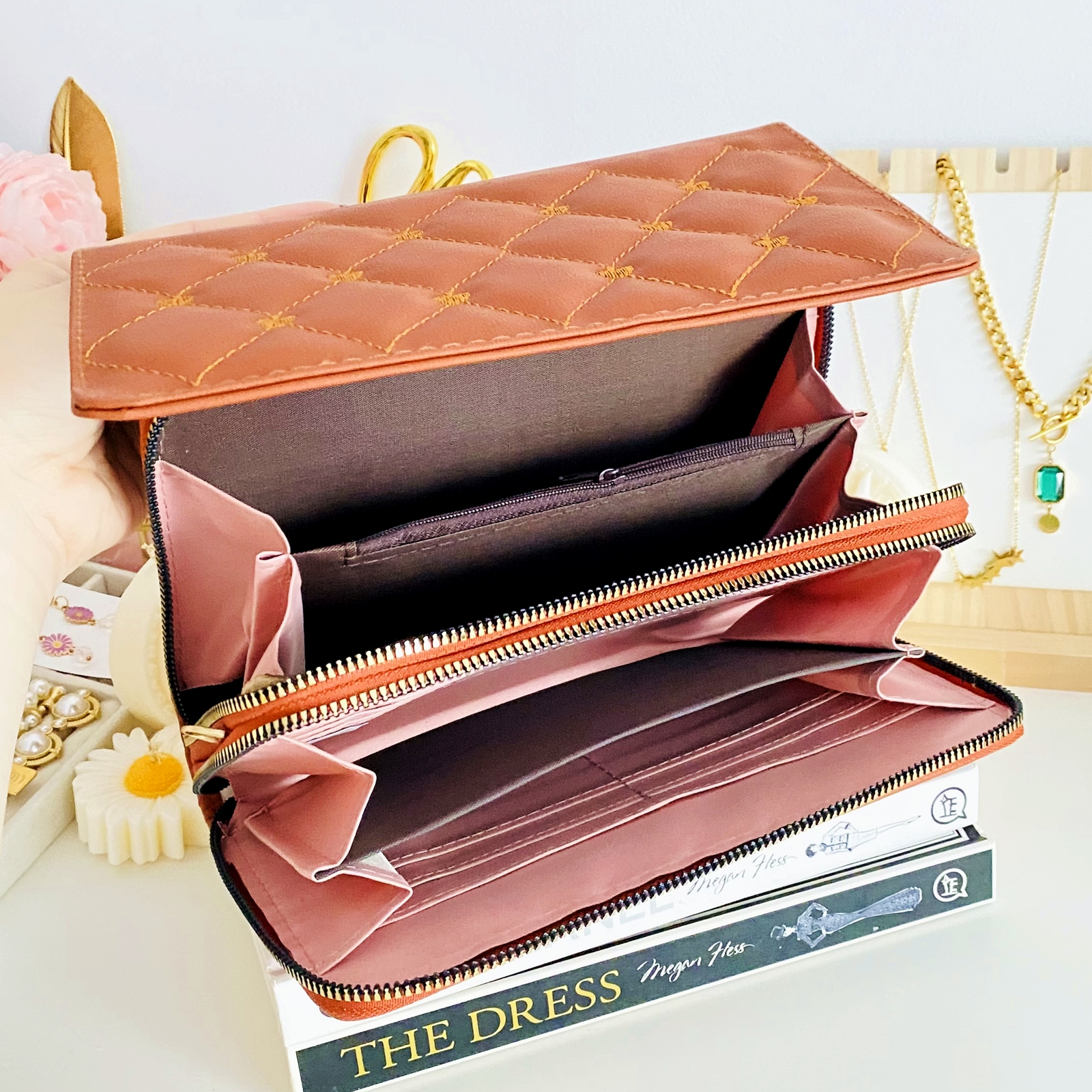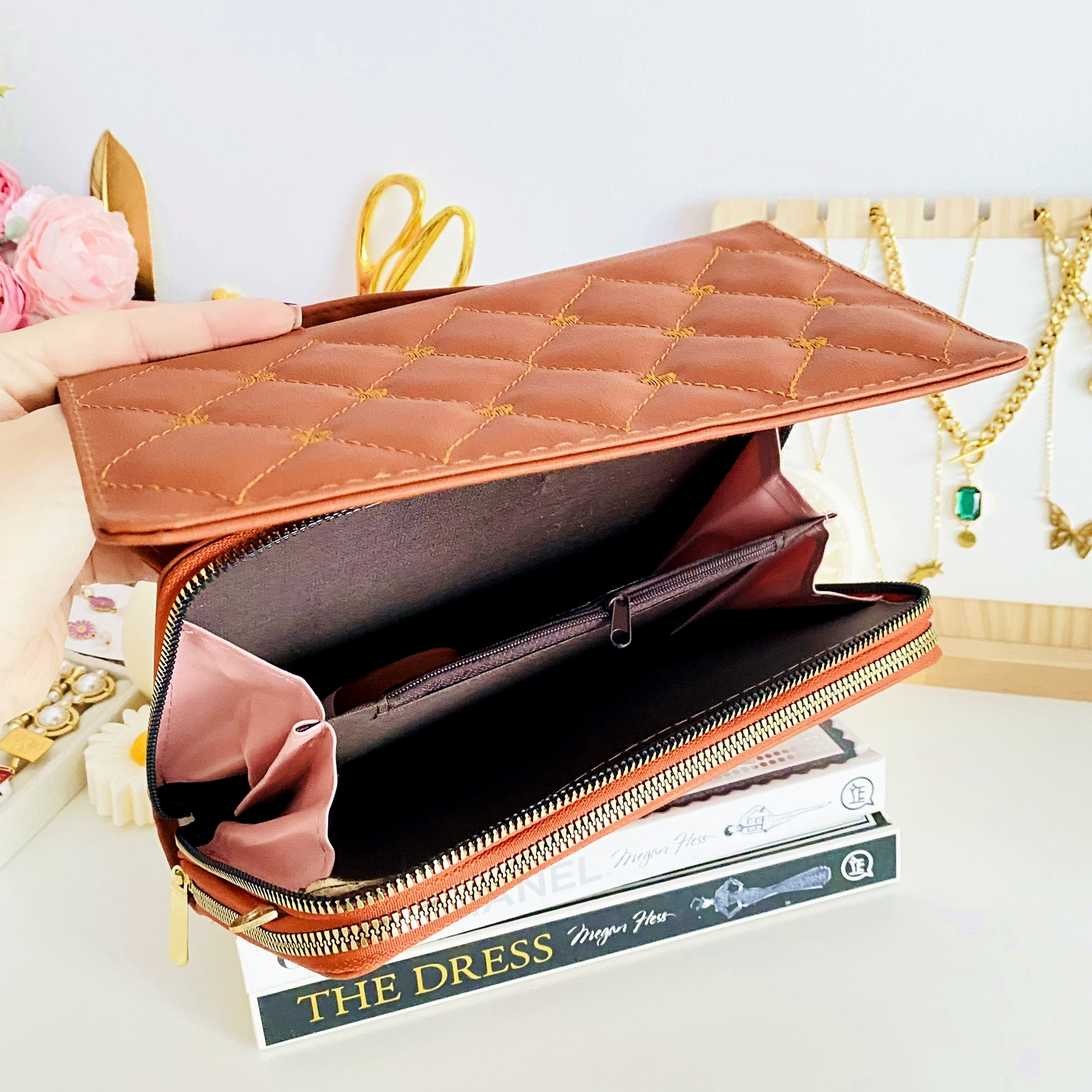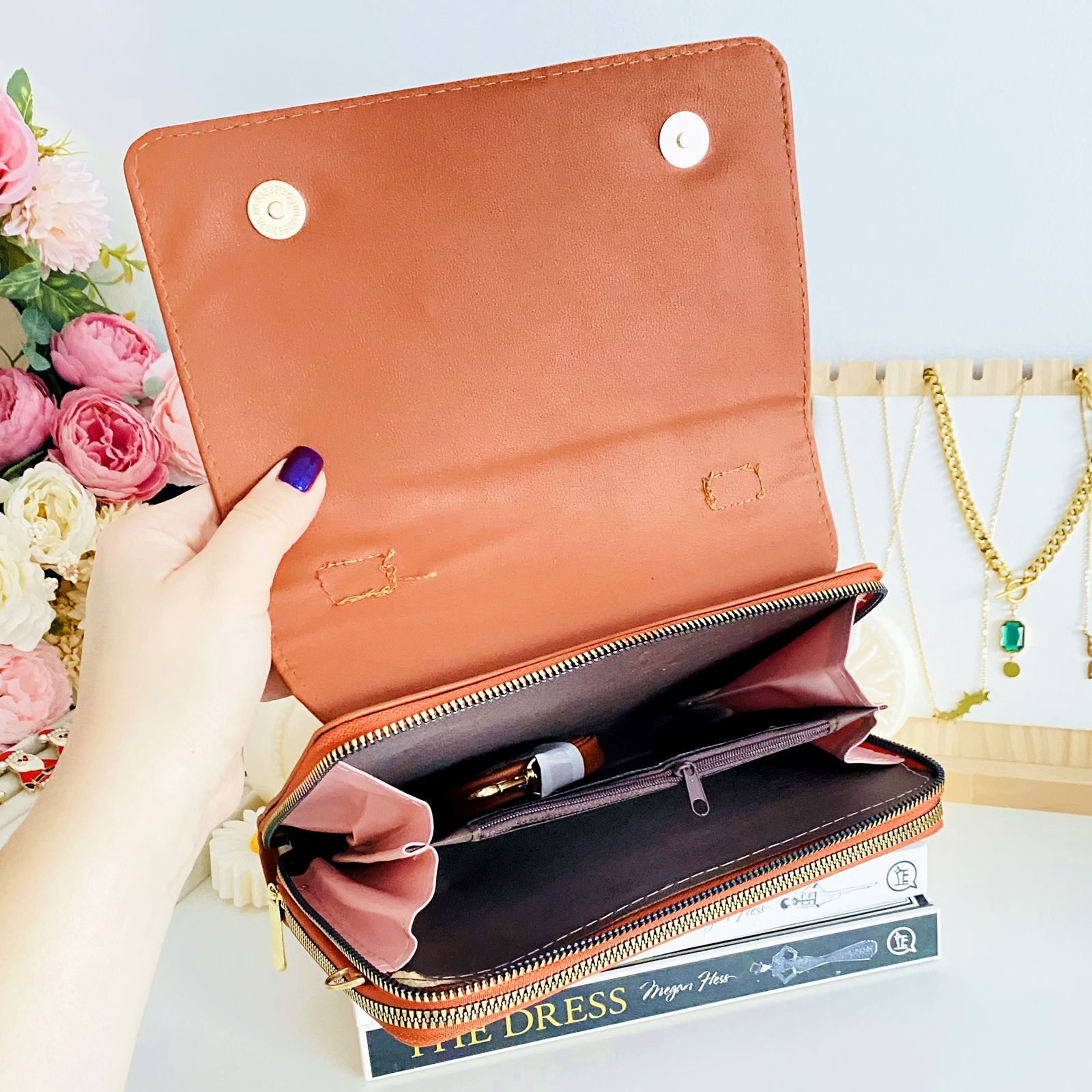 ✔ Prezinta 2 compartimente mari: un compartiment mare pentru bancnote, carduri si diverse maruntisuri si unul mare pentru telefon, servetele, etc. care contine si un compartiment cu fermoar pentru monede