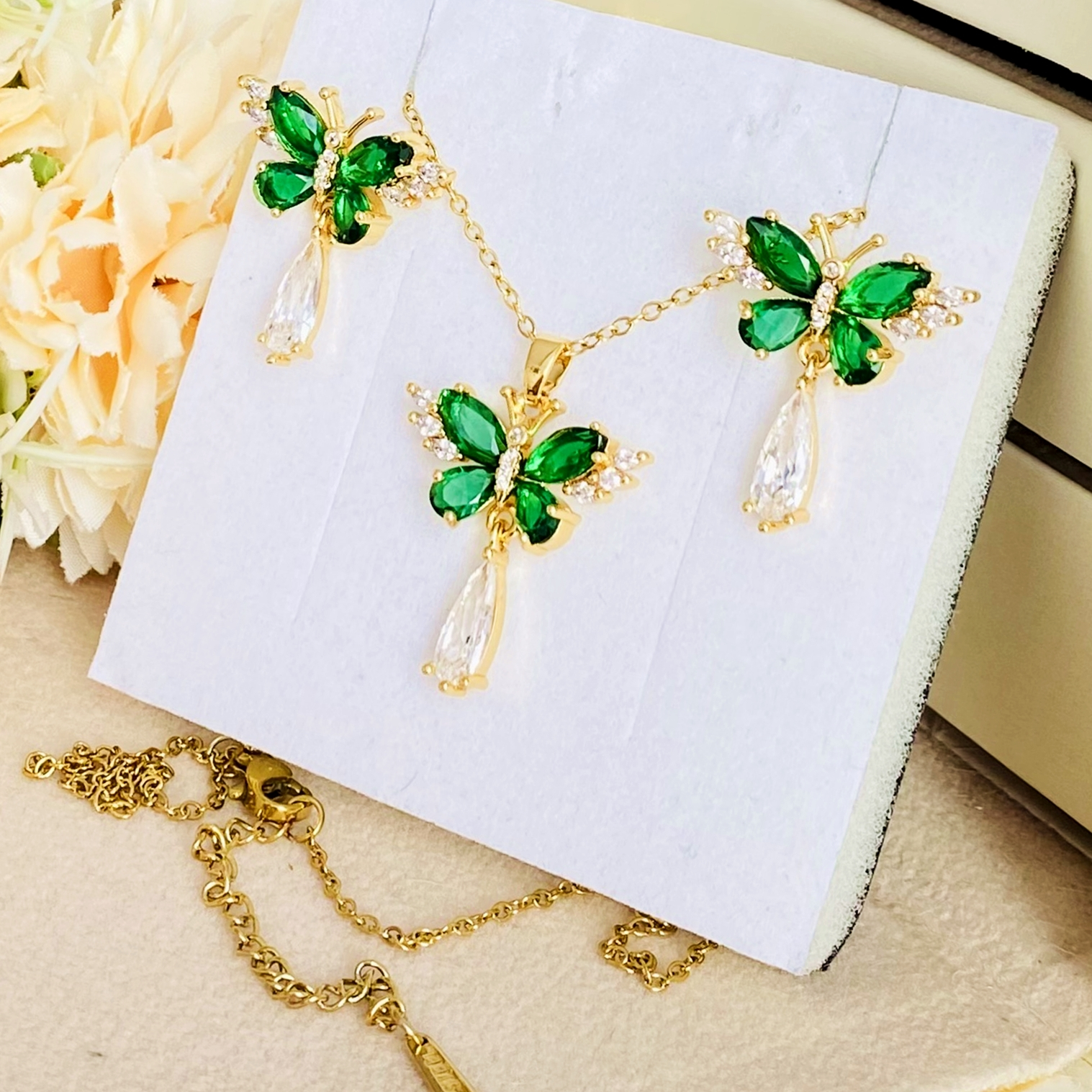 Set Colier & Cercei Fluturi Cristale Verzi - Otel Inoxidabil