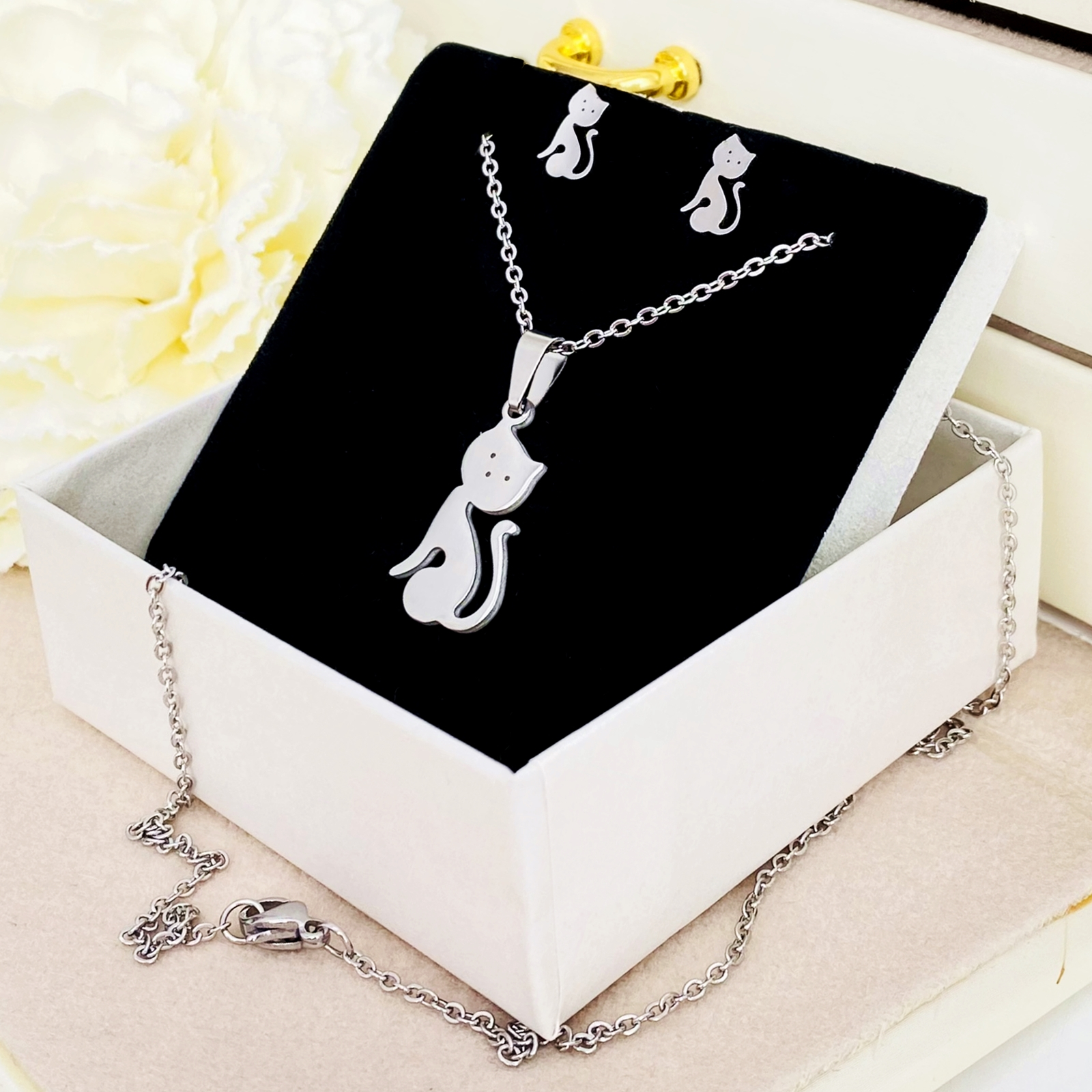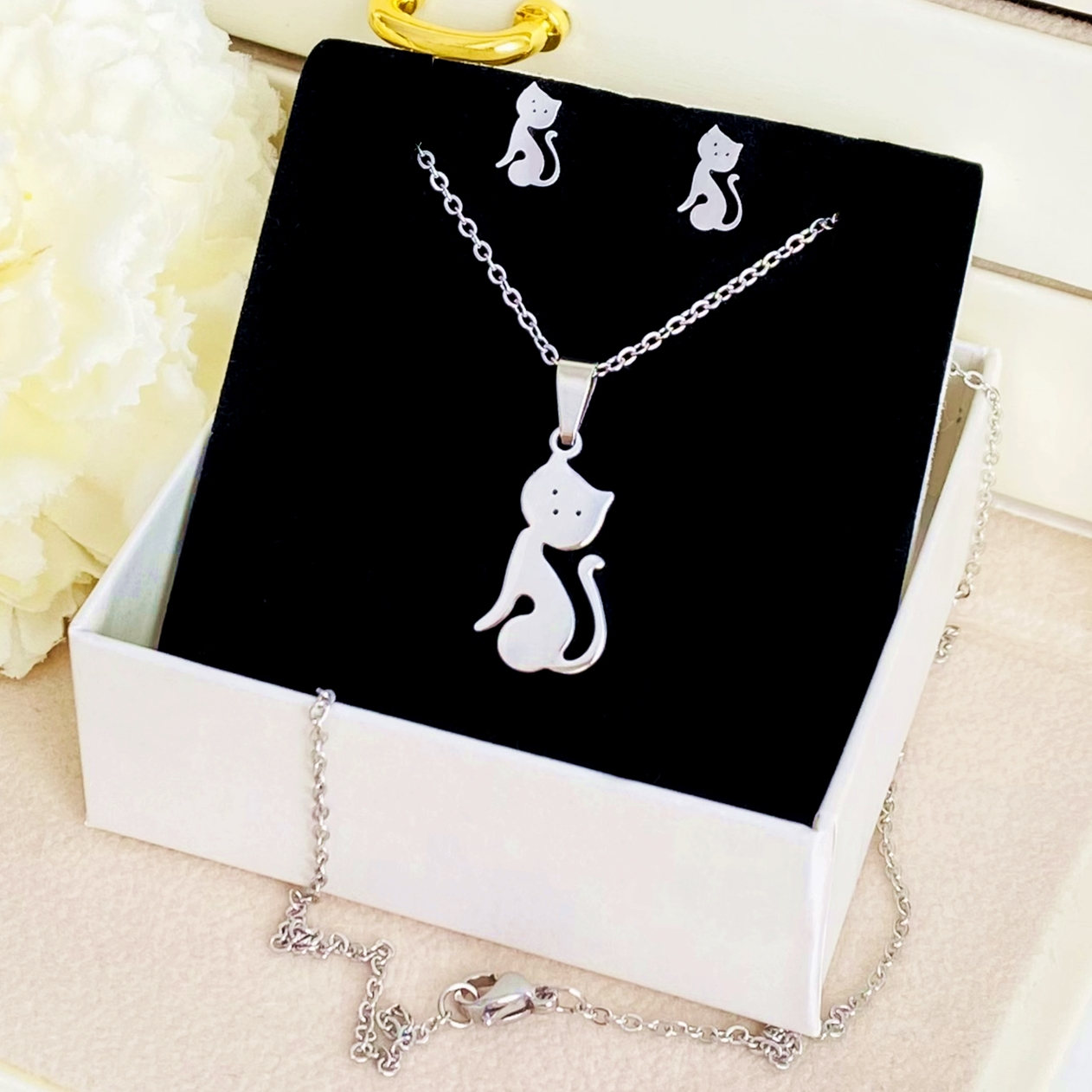 Set Colier & Cercei Pisici Argintii - Otel Inoxidabil