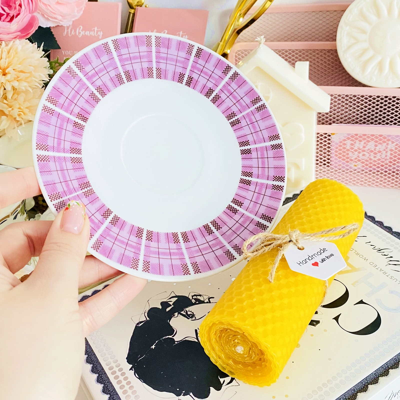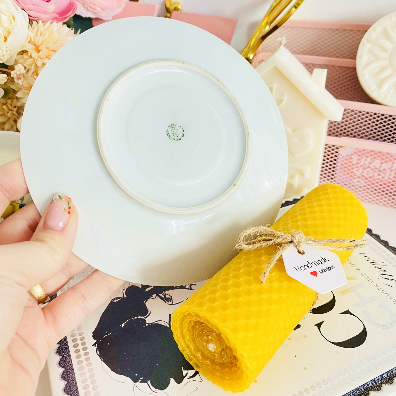 Set cadou format dintr-o farfurie mica vintage din portelan si lumanare din ceara naturala de albine si fitil bumbac, rulata manual.