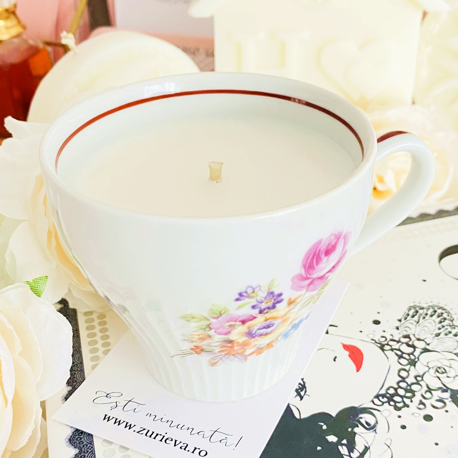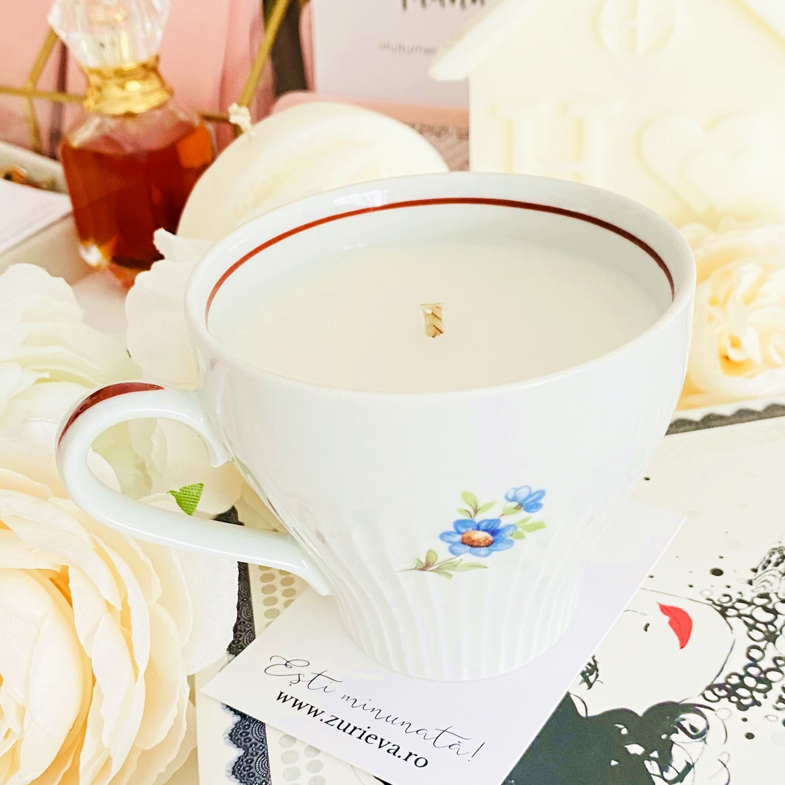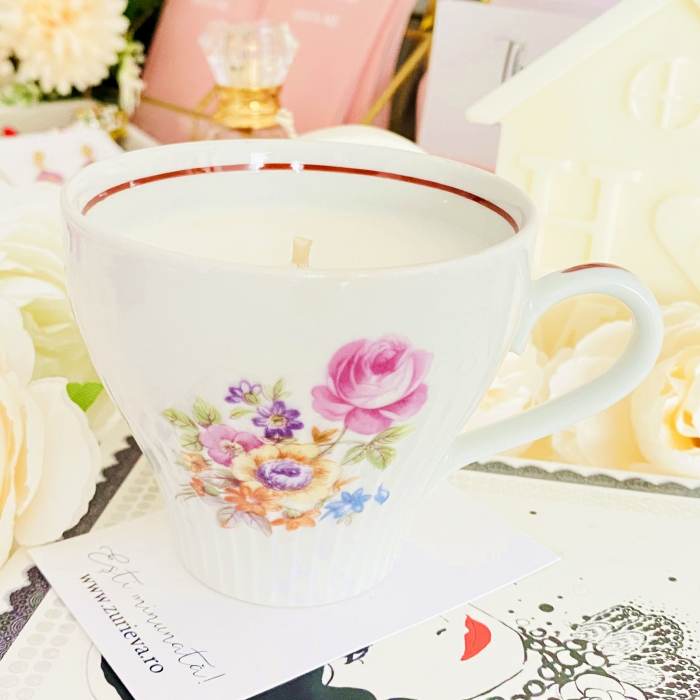 Lumanare parfumata din ceara de soia, 100% naturala, turnata manual intr-o ceasca vintage din portelan si cu fitil din bumbac.