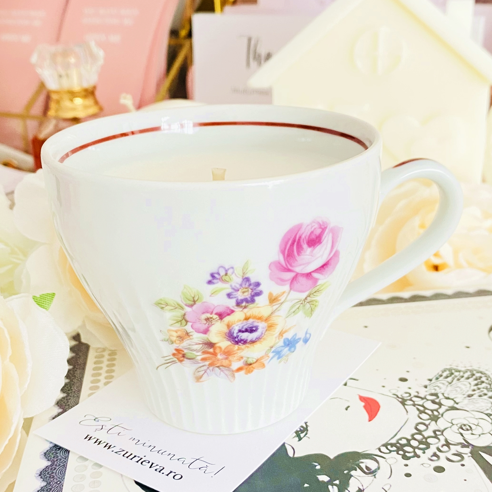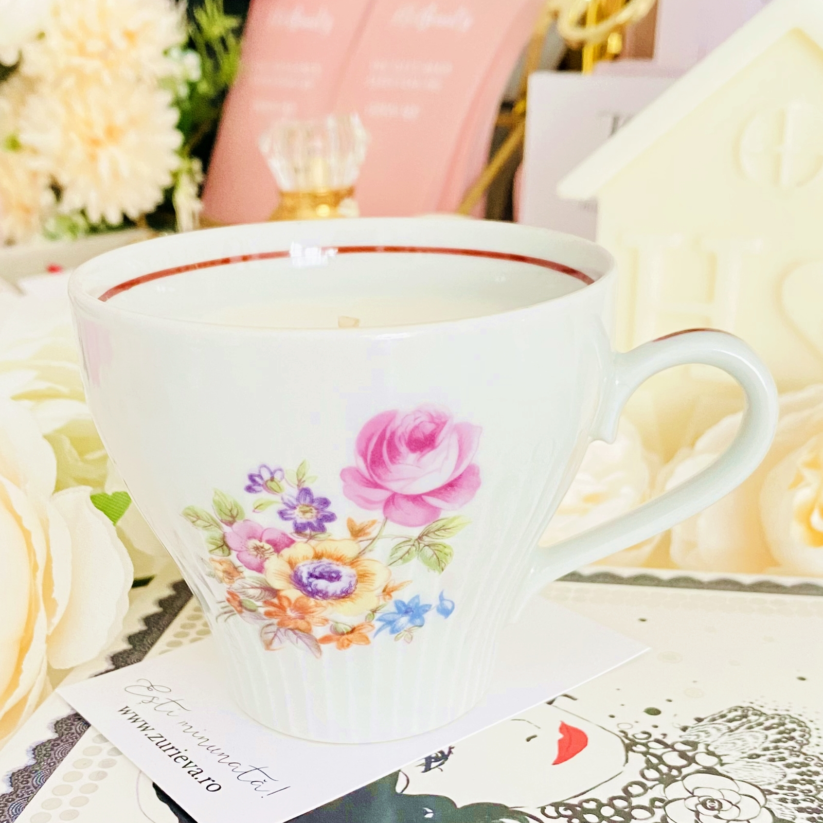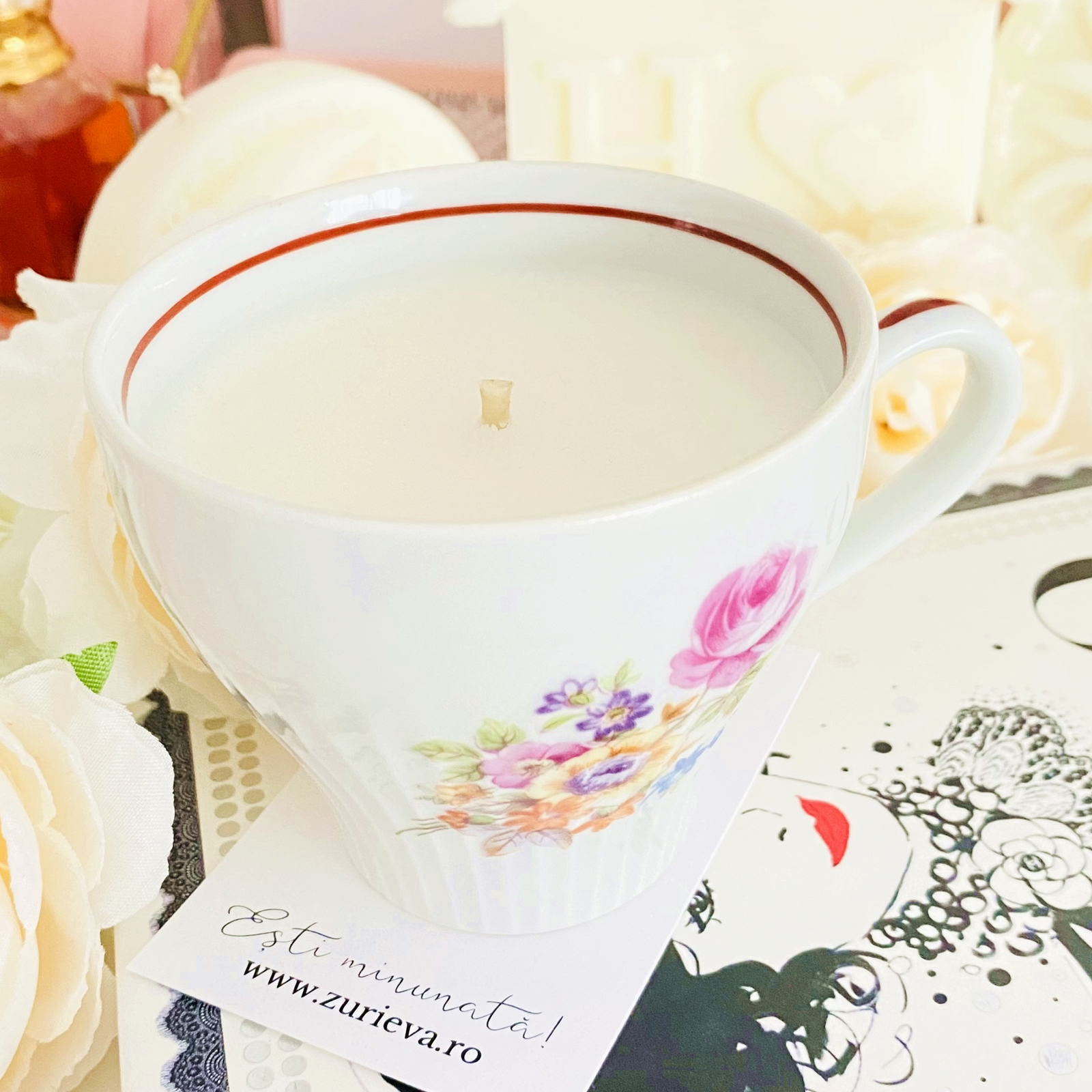 Lumanare parfumata din ceara de soia, 100% naturala, turnata manual intr-o ceasca vintage din portelan si cu fitil din bumbac.