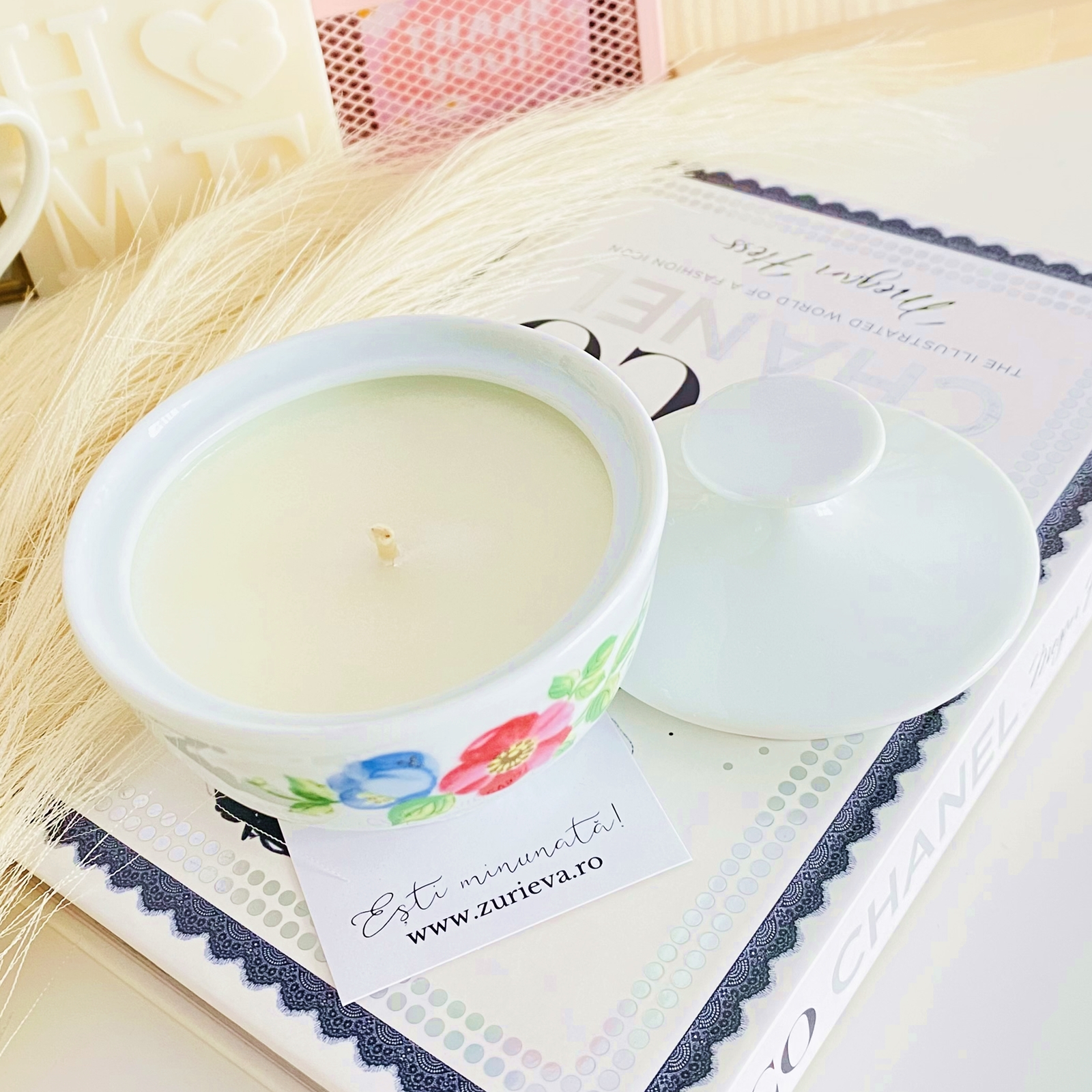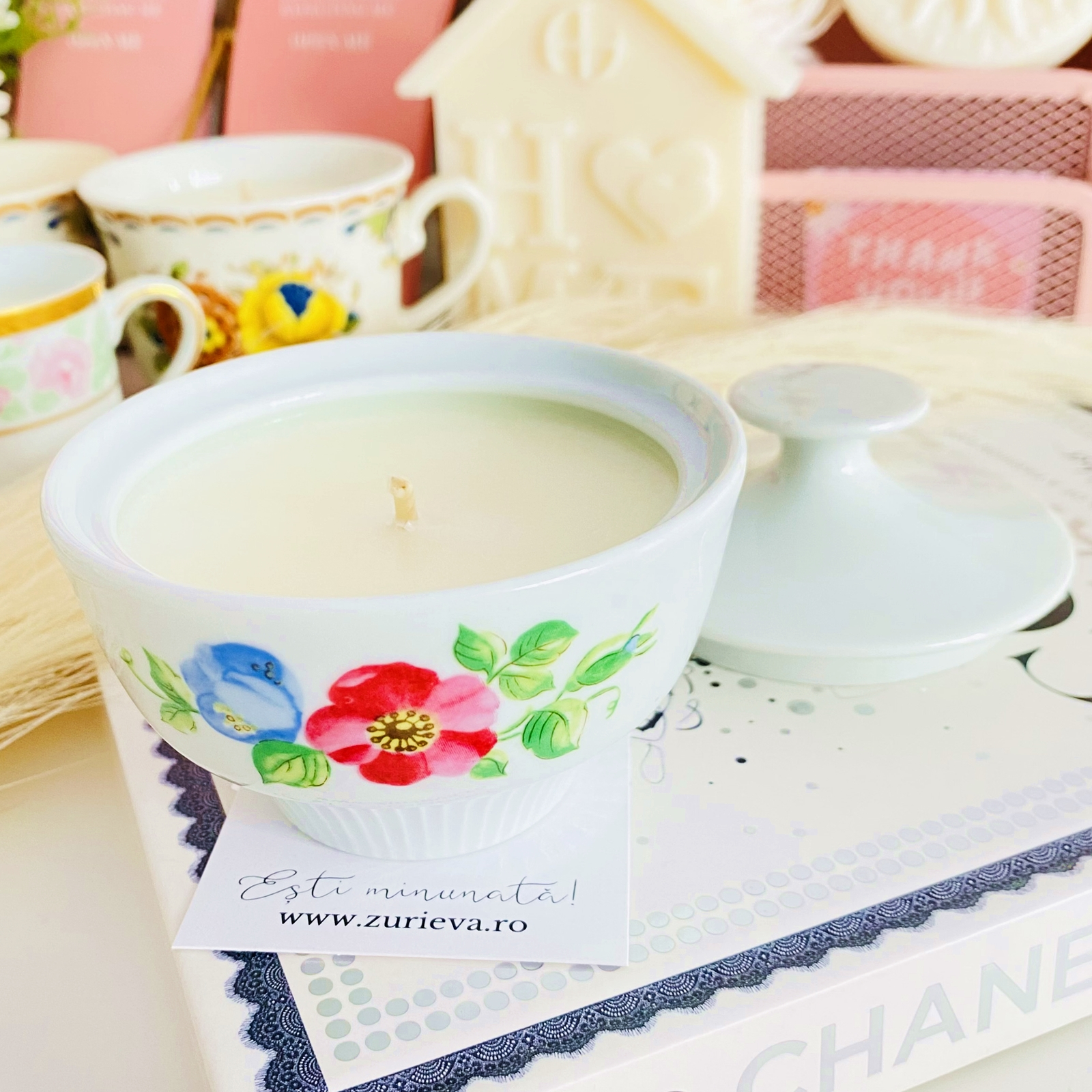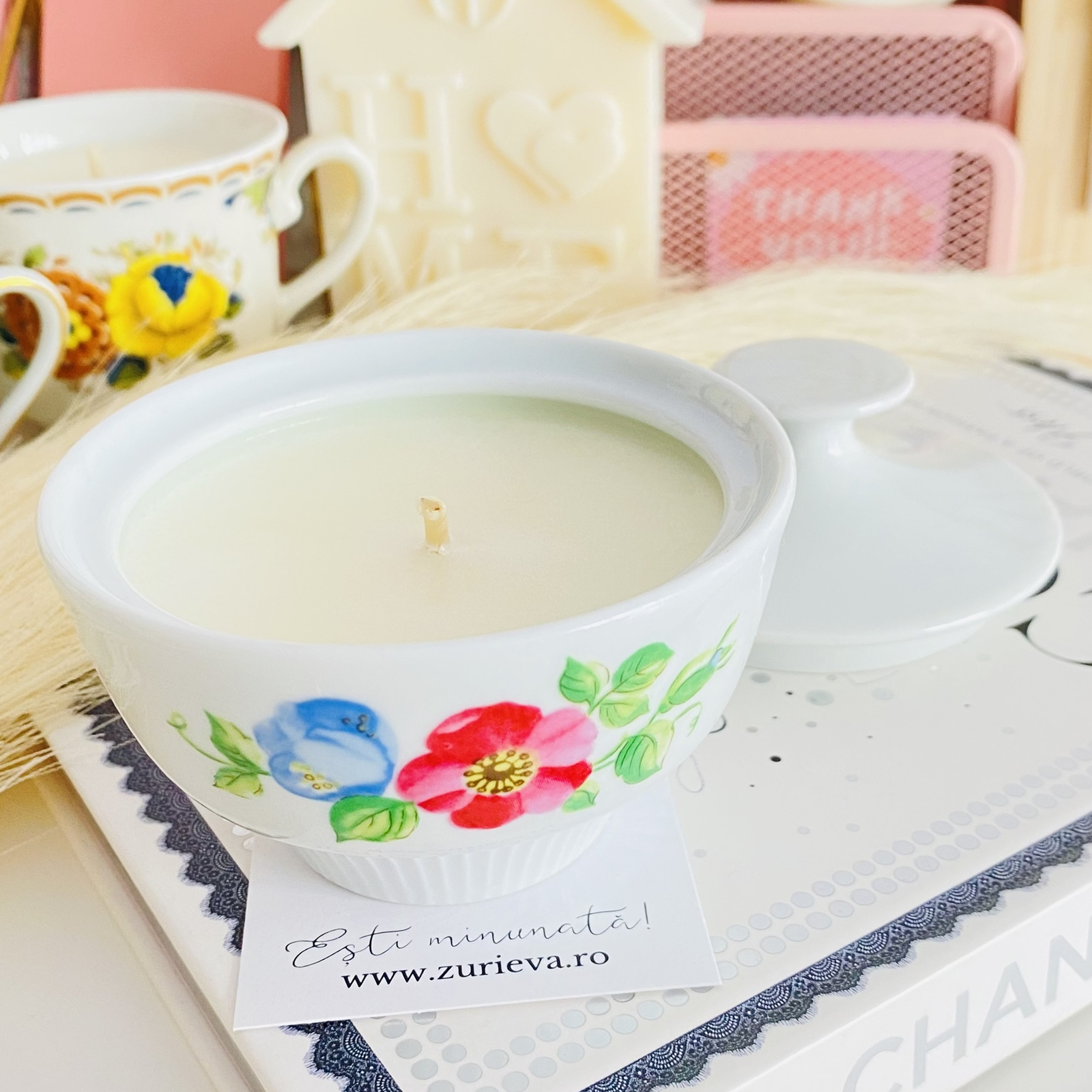 Lumanare parfumata din ceara de soia, 100% naturala, turnata manual intr-o bomboniera din portelan vintage si cu fitil din bumbac.