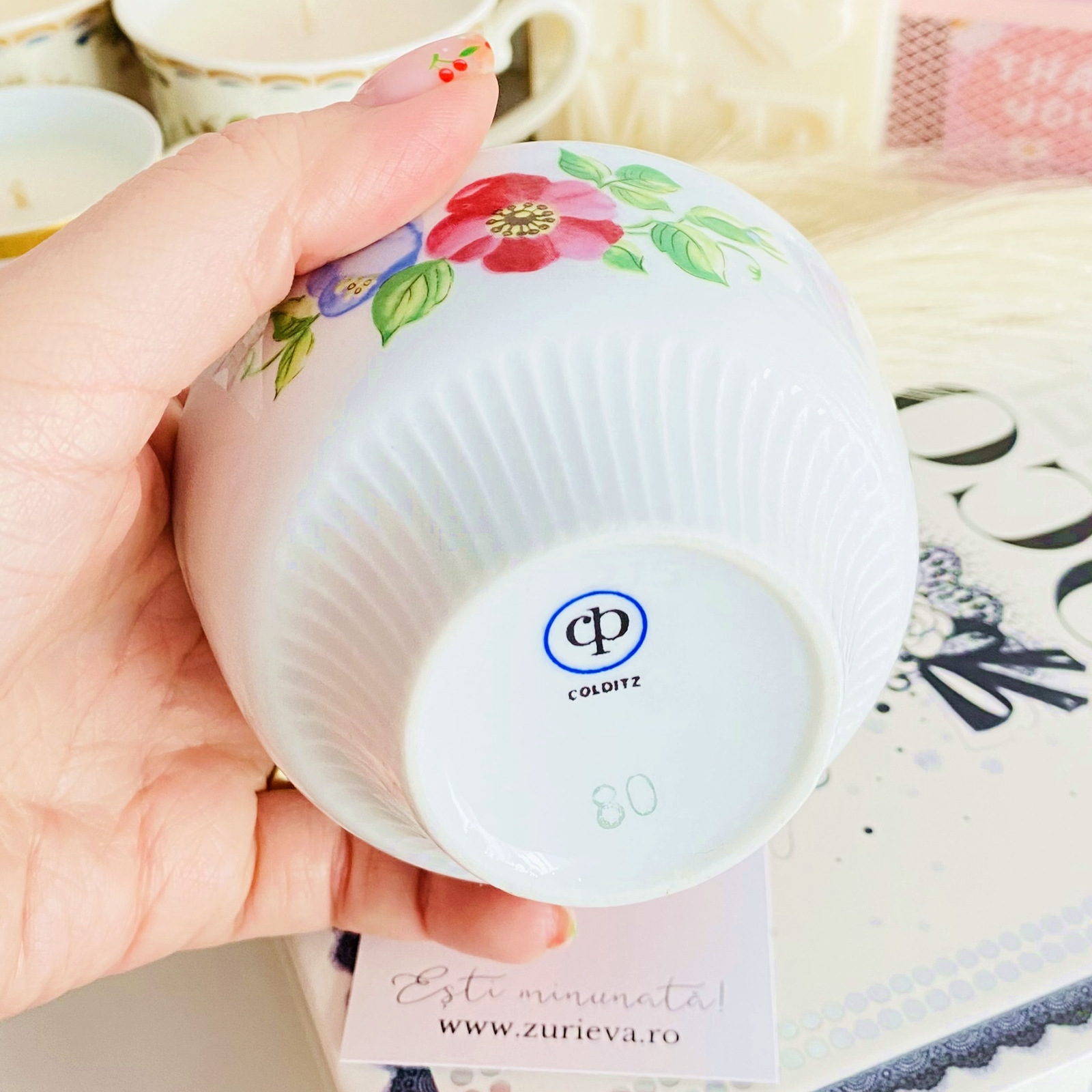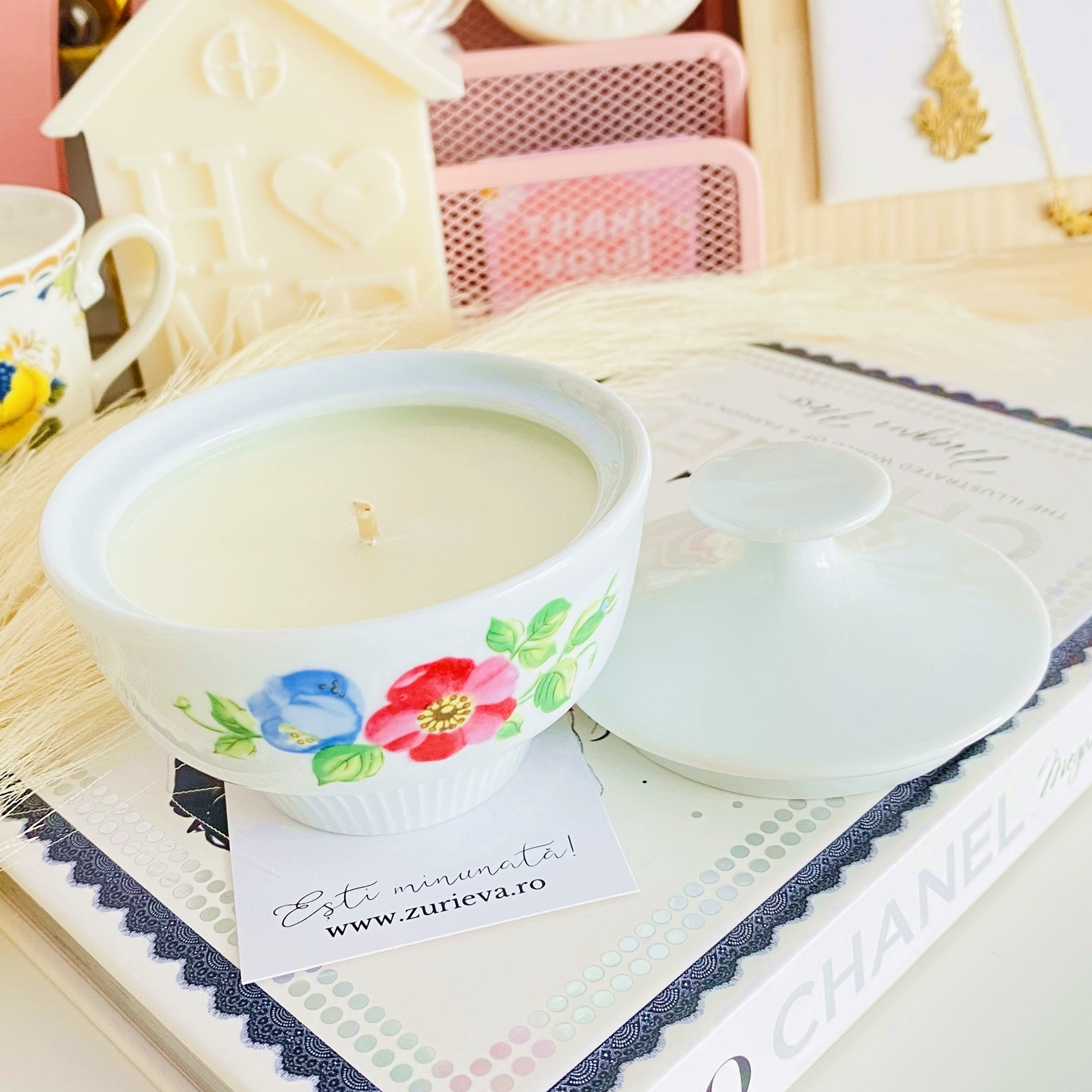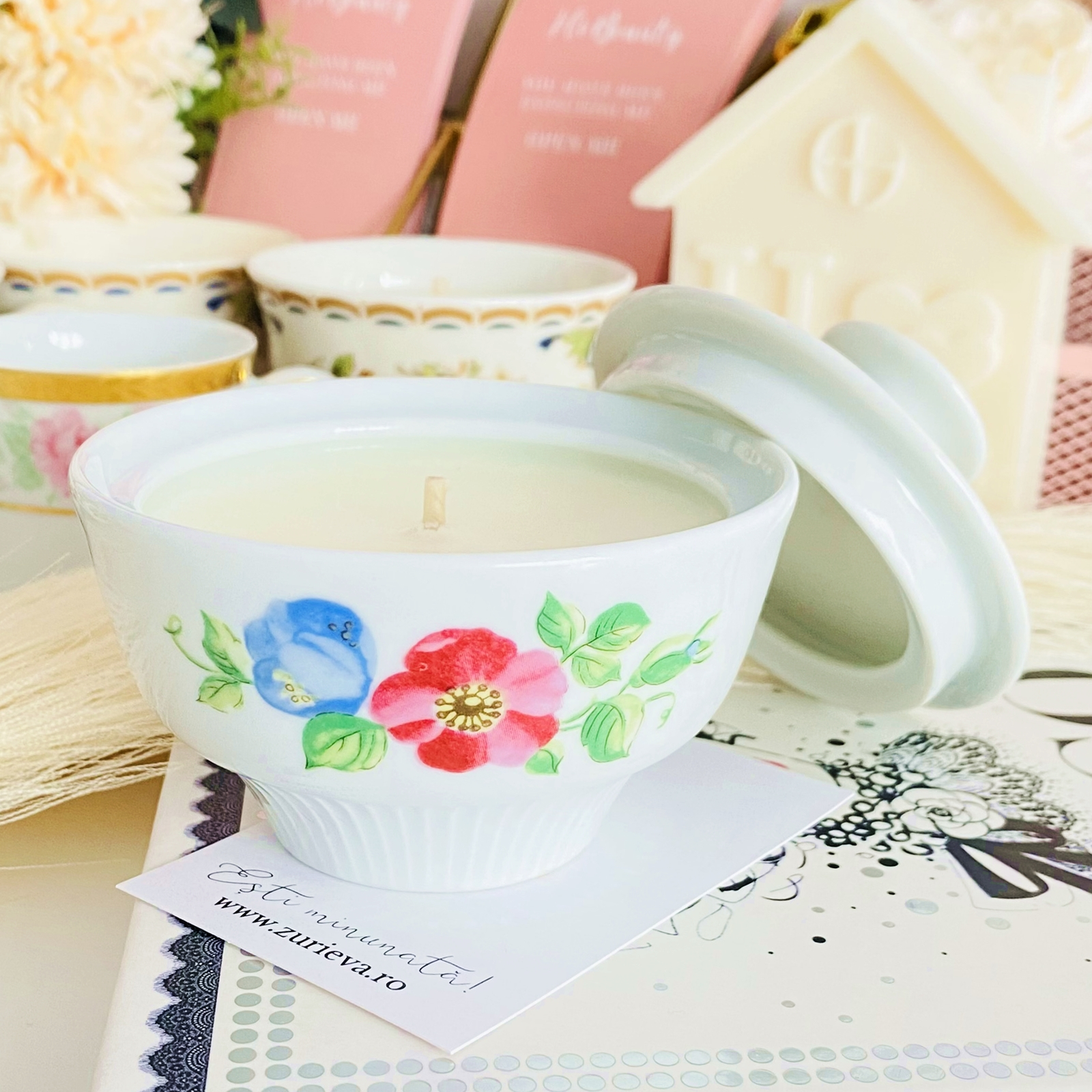 Lumanare parfumata din ceara de soia, 100% naturala, turnata manual intr-o bomboniera din portelan vintage si cu fitil din bumbac.
