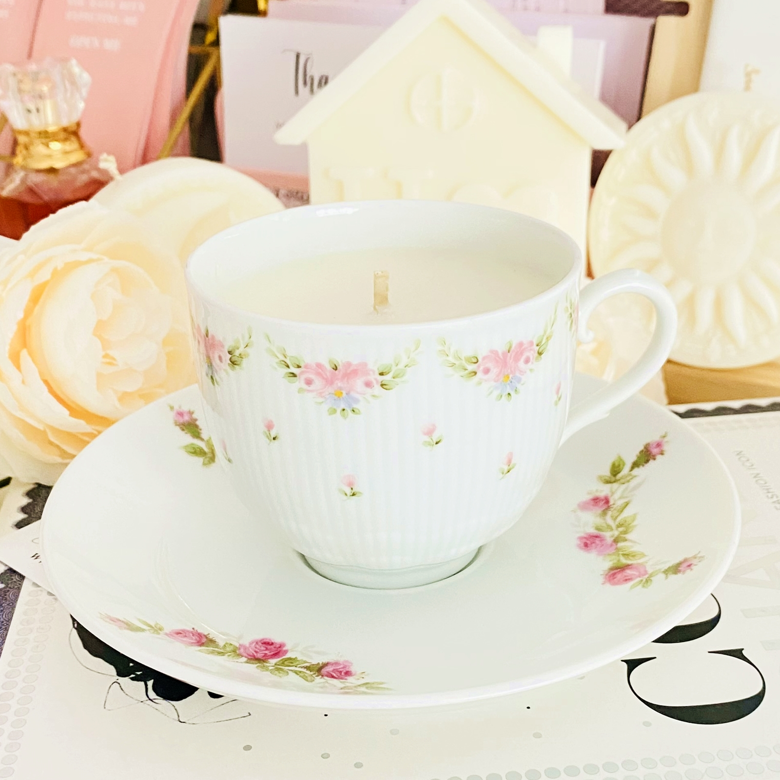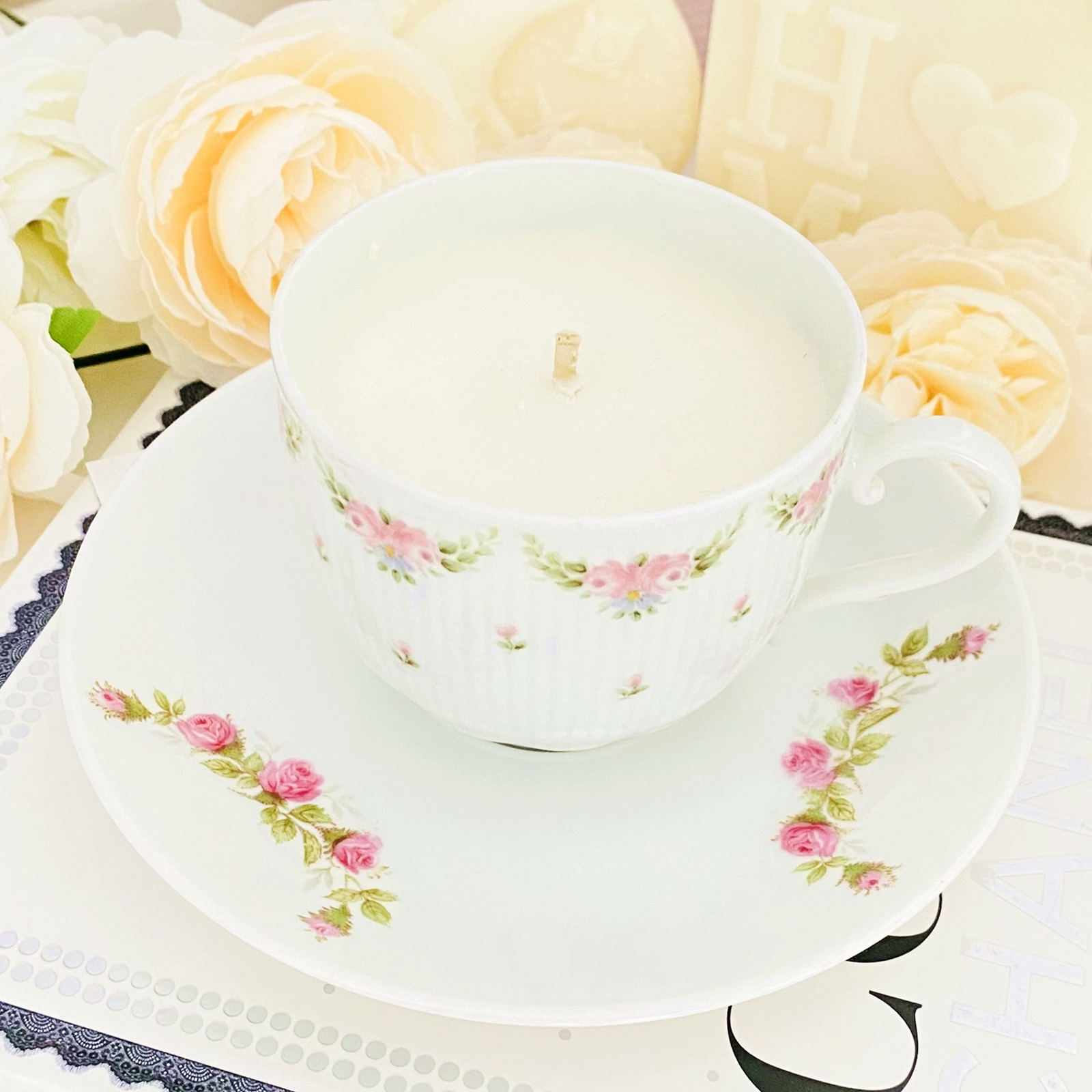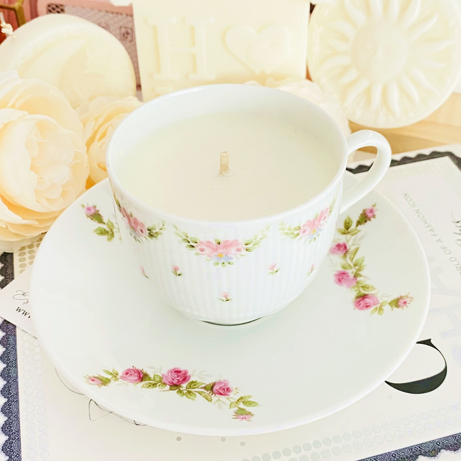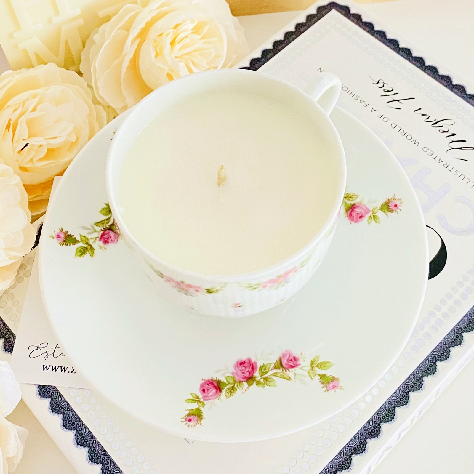 Lumanare parfumata din ceara de soia, 100% naturala, turnata manual intr-o ceasca vintage din portelan nemtesc si cu fitil din bumbac. Lumanarea este insotita de farfurie mica.