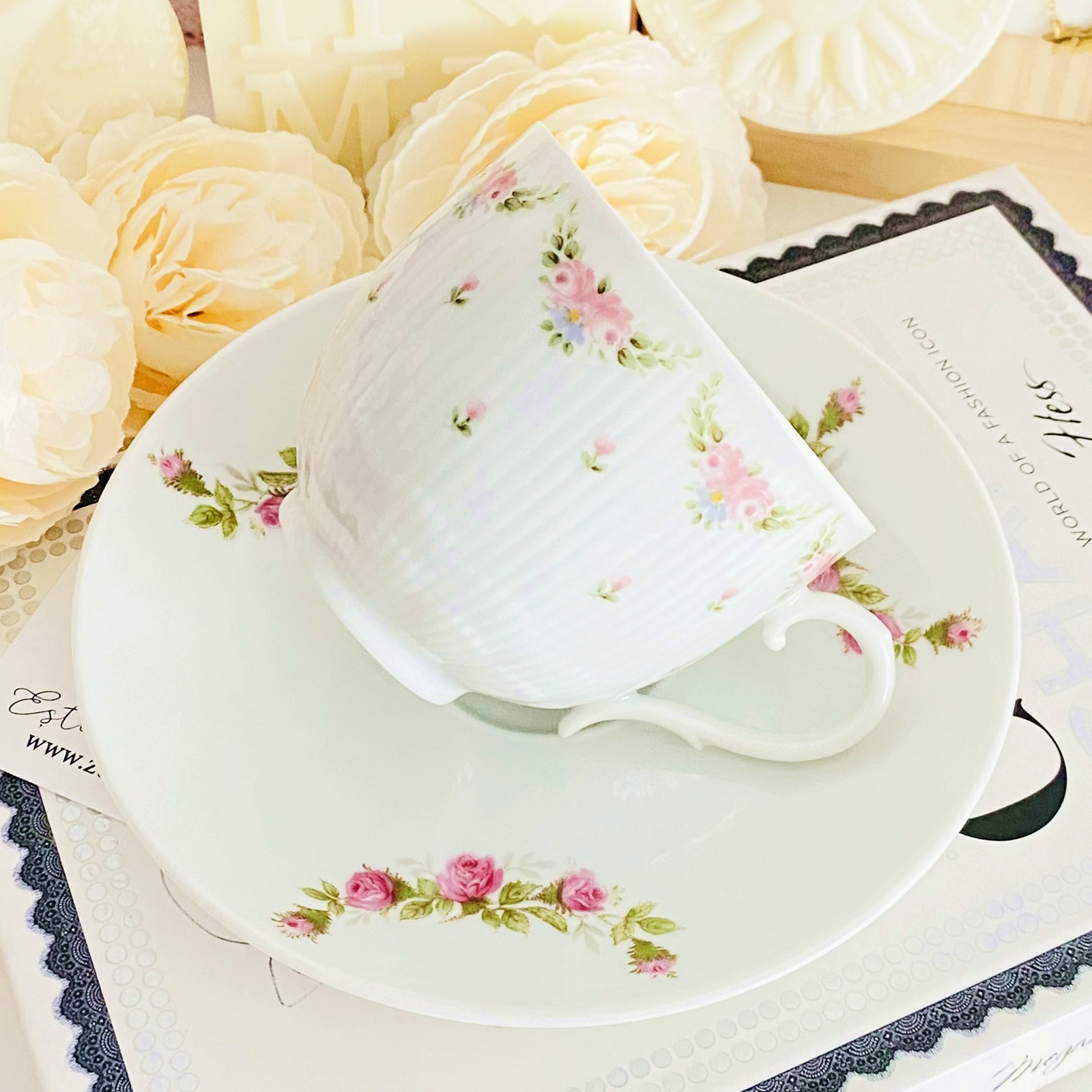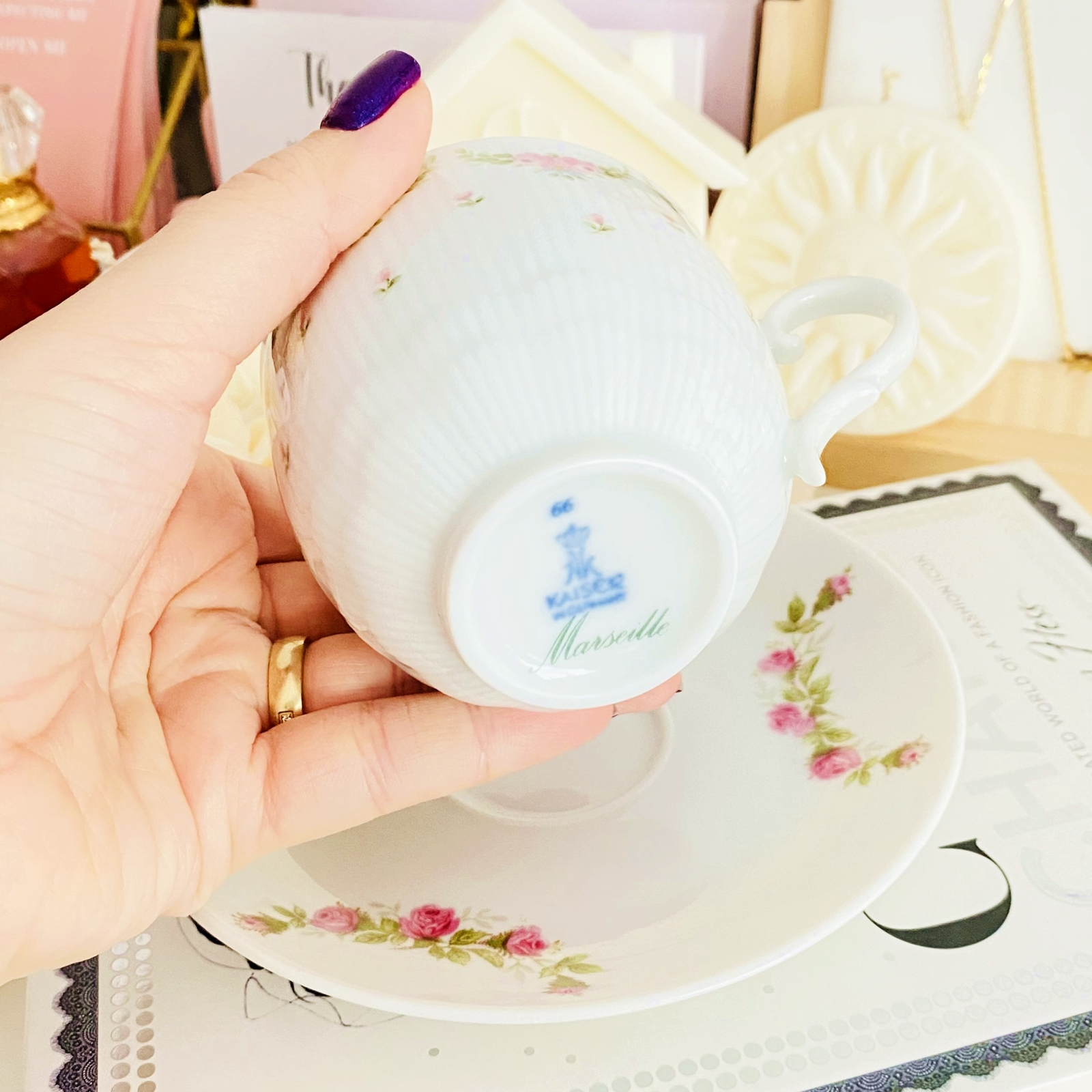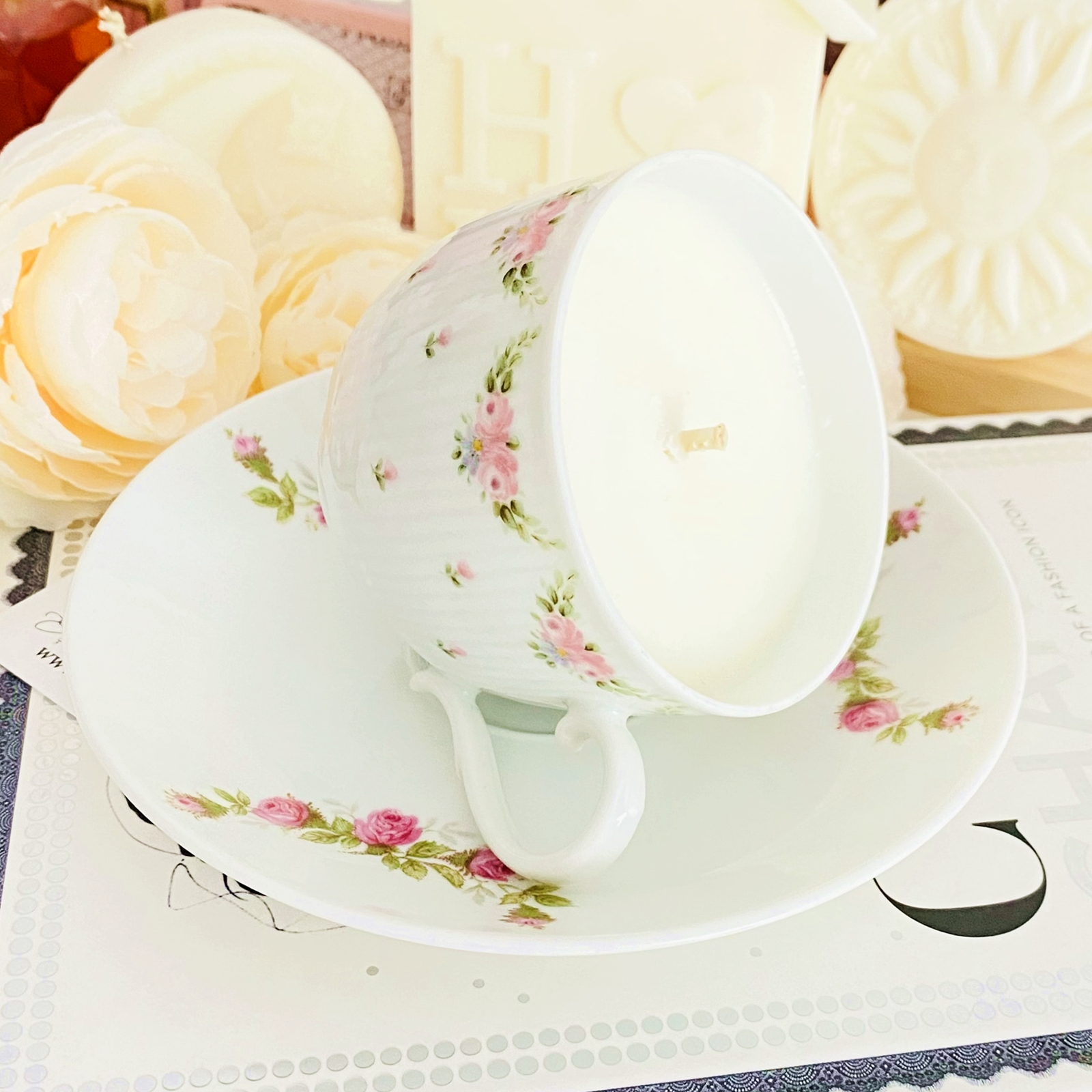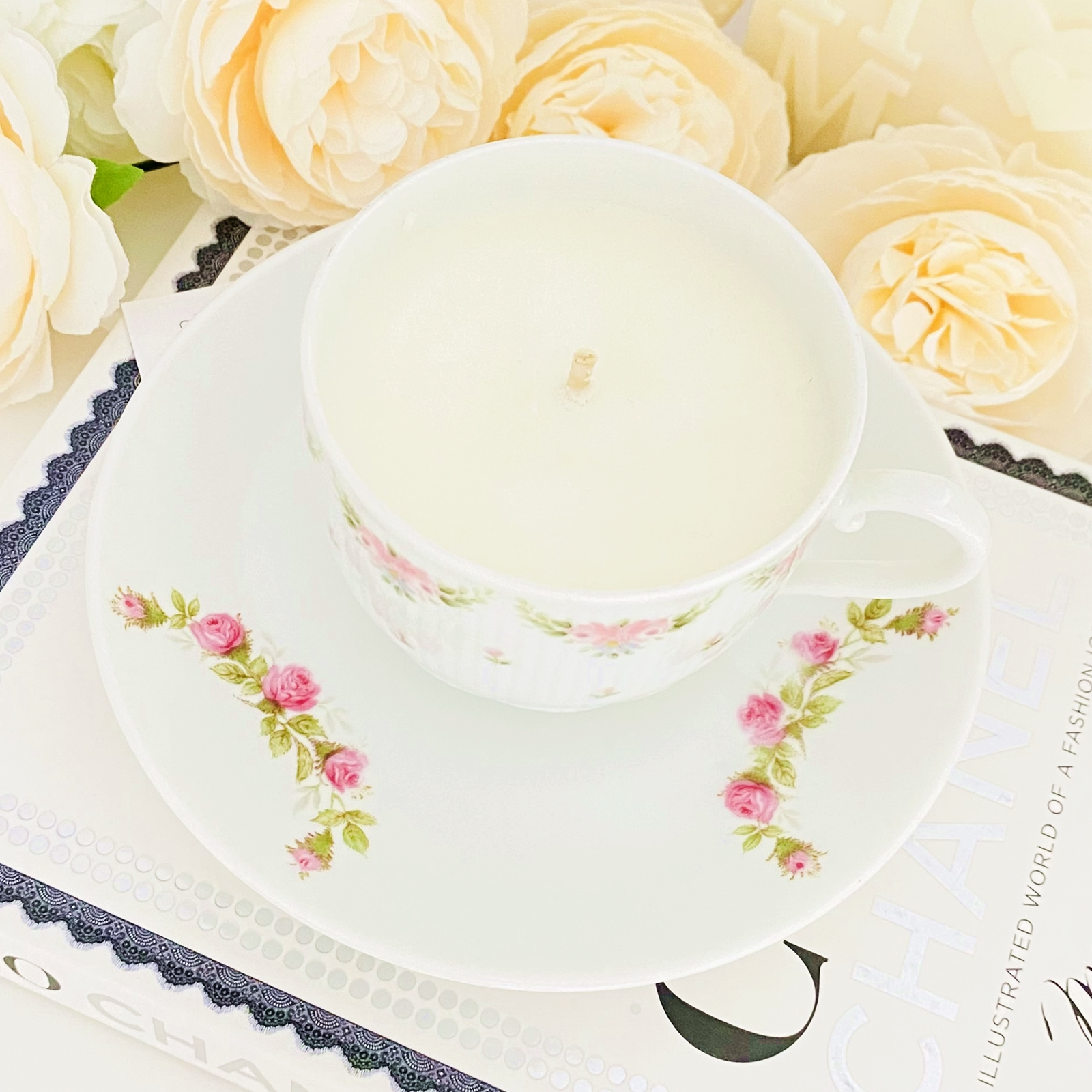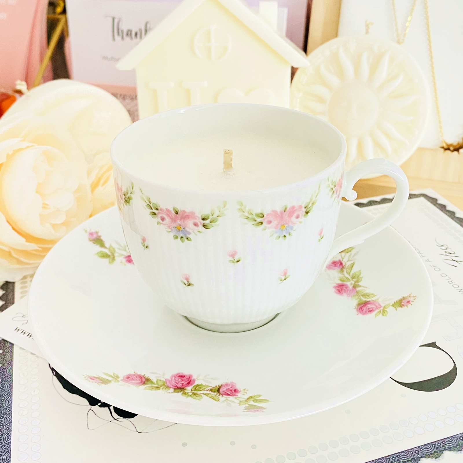 Lumanare parfumata din ceara de soia, 100% naturala, turnata manual intr-o ceasca vintage din portelan nemtesc si cu fitil din bumbac. Lumanarea este insotita de farfurie mica.