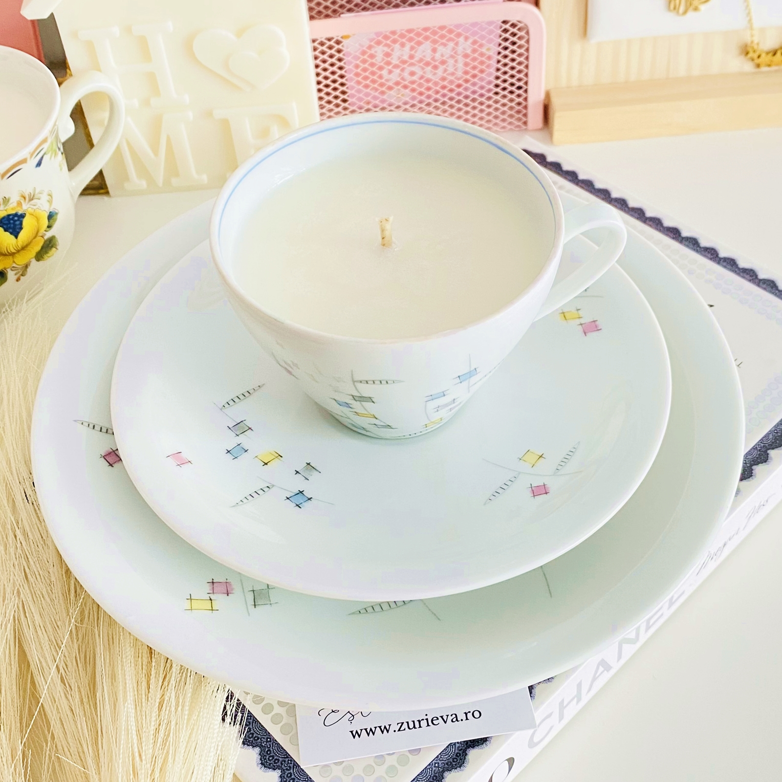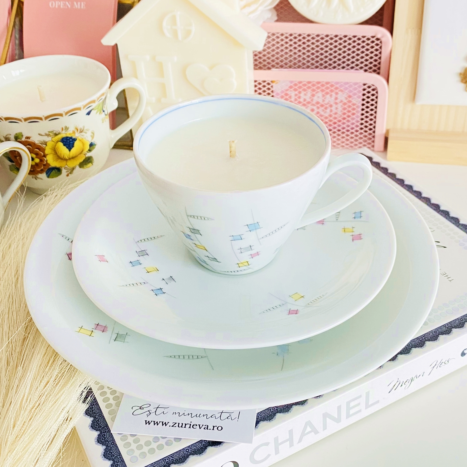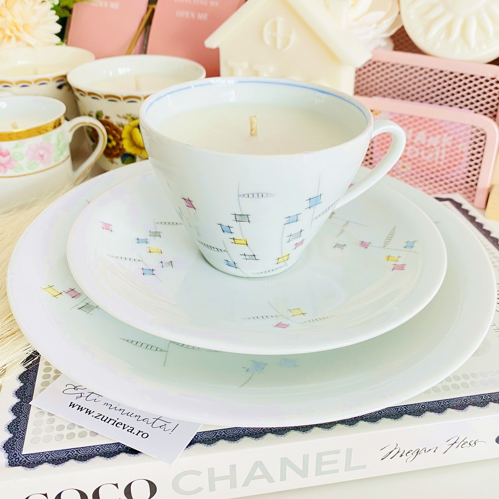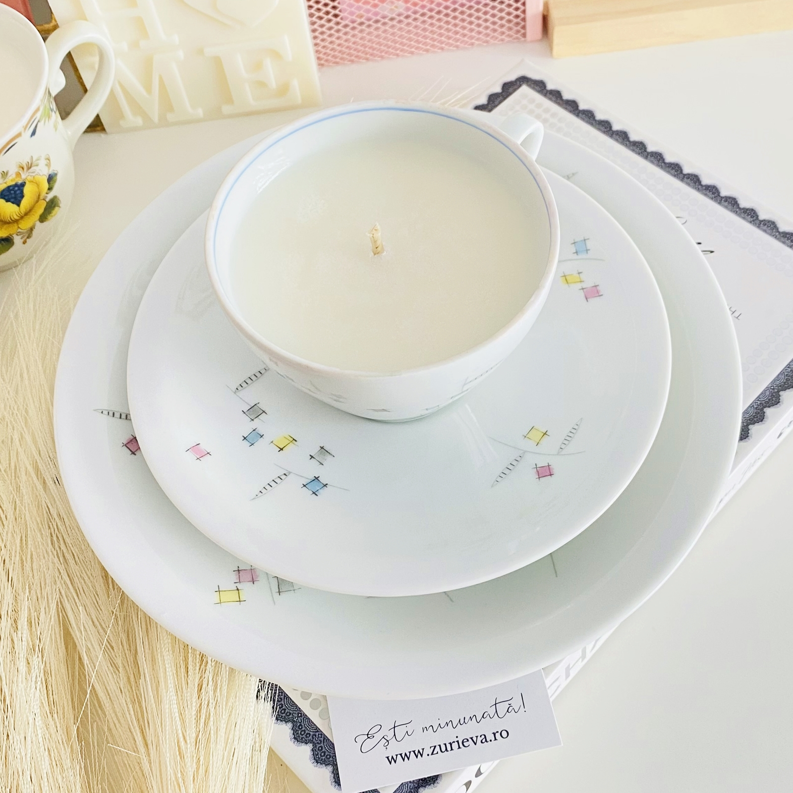 Lumanare parfumata din ceara de soia, 100% naturala, turnata manual intr-o ceasca din portelan vintage si cu fitil din bumbac.