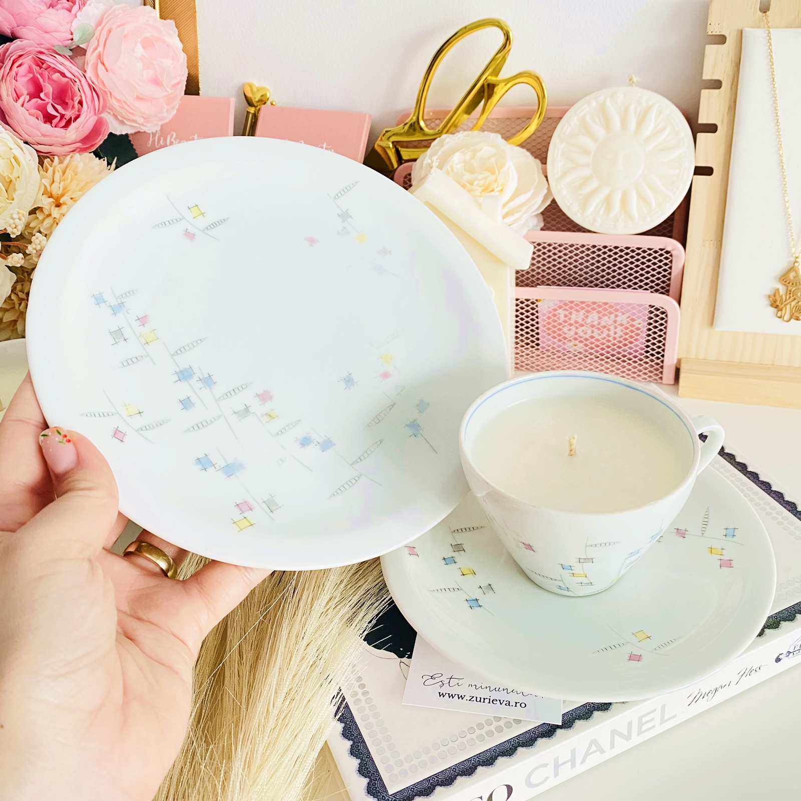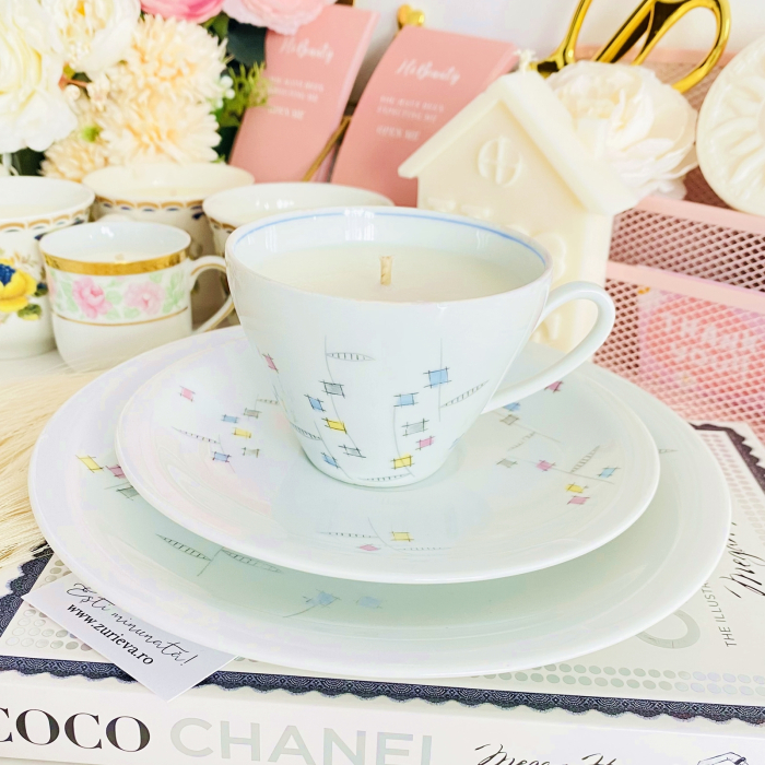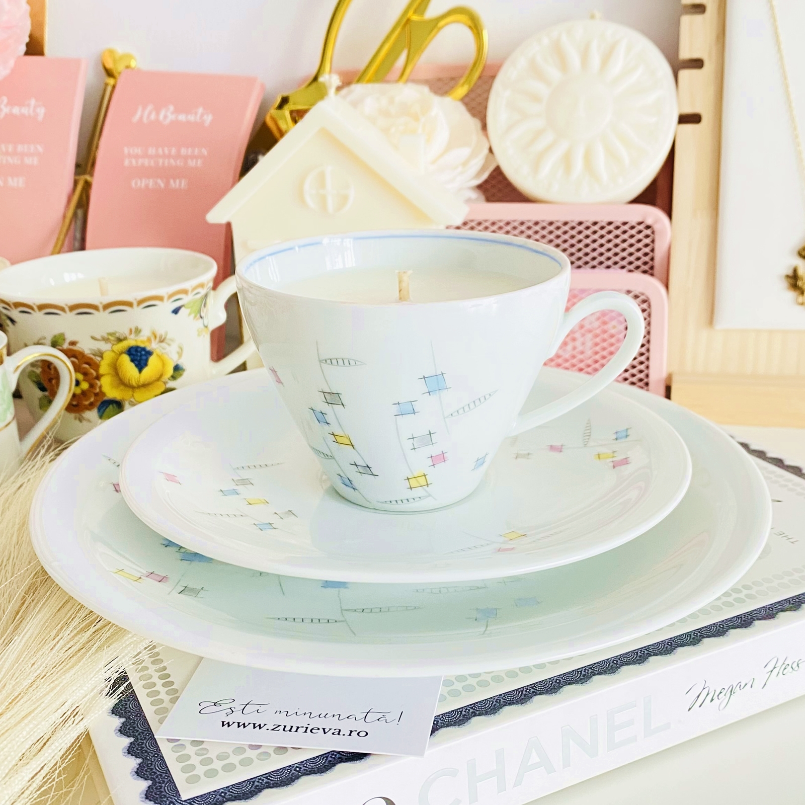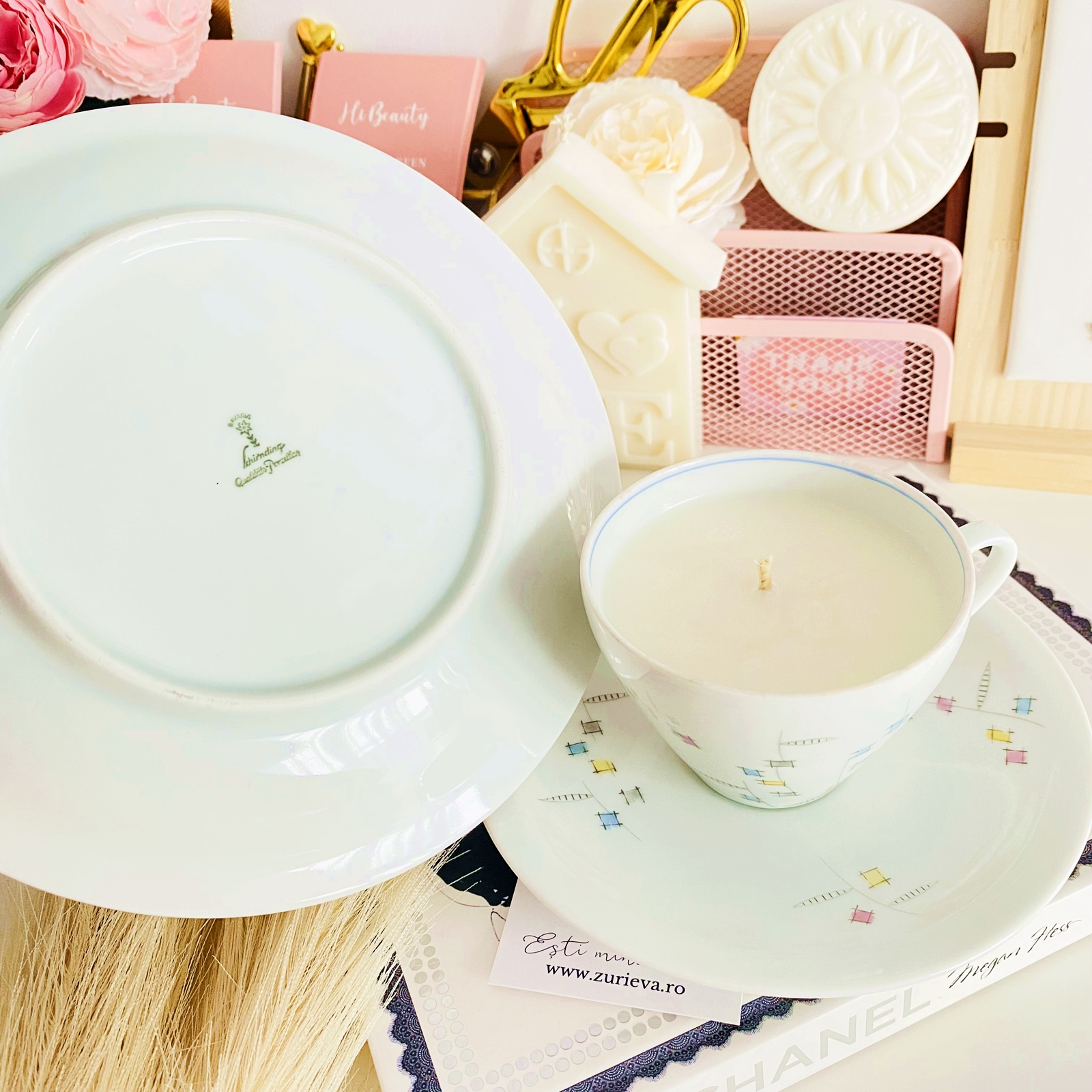 Lumanare parfumata din ceara de soia, 100% naturala, turnata manual intr-o ceasca din portelan vintage si cu fitil din bumbac.