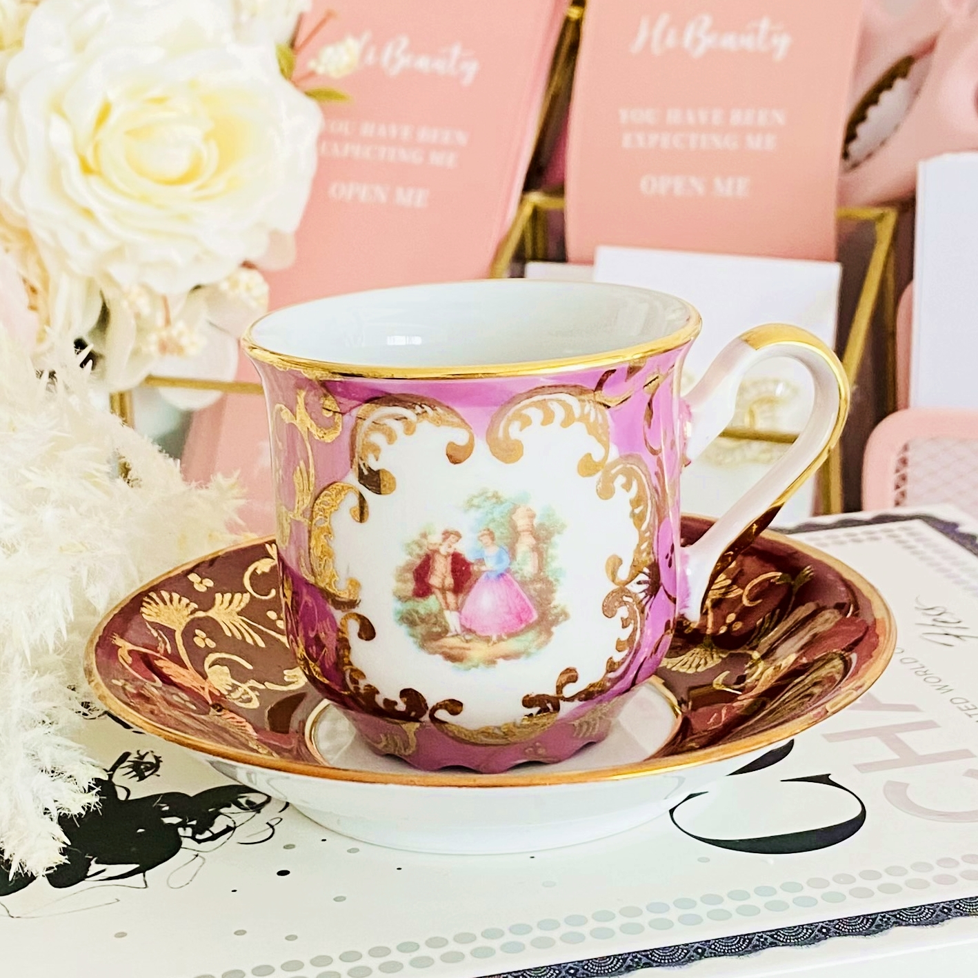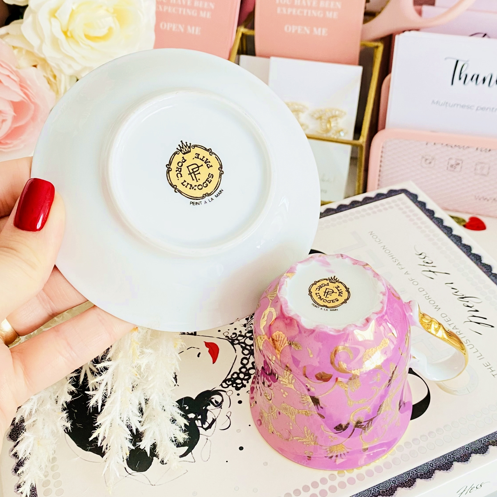 Set ceasca si farfurie din portelan vintage frantuzesc Limoges, bogat decorat cu scena Fragonard si aur coloidal.